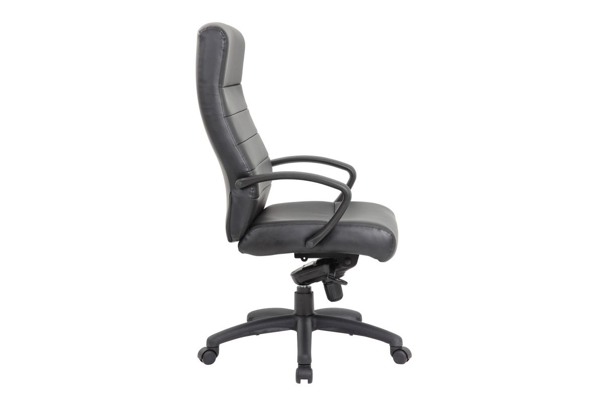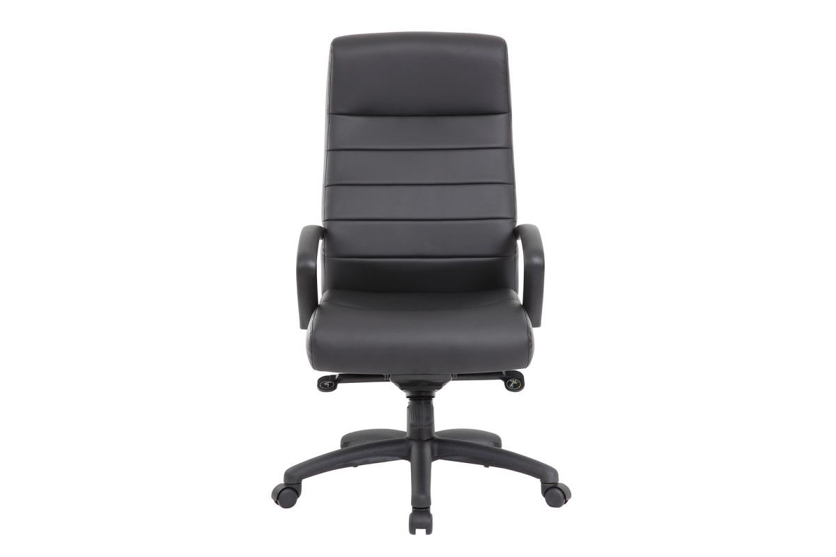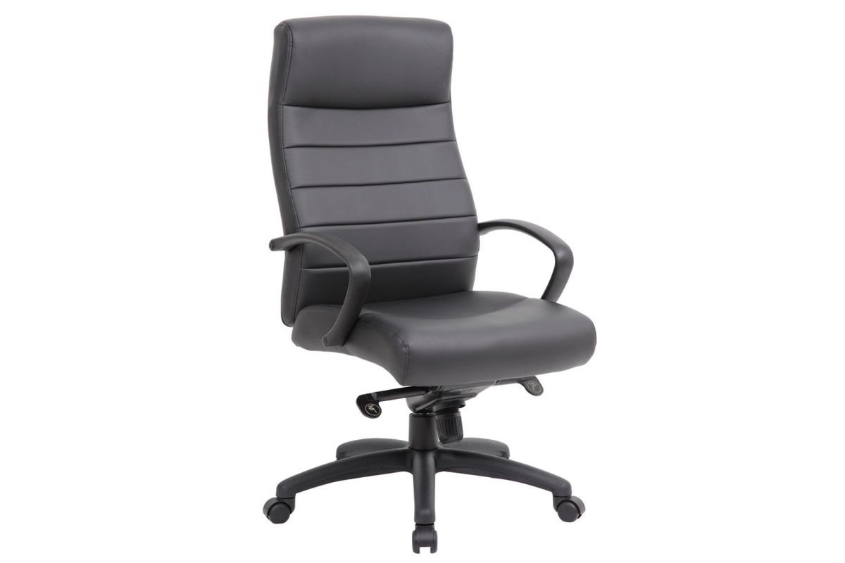 This executive high back chair with a black frame is both comfortable and stylish. The linear stitching provides a sleek look, while the curvature of the back provides support. With its ability to swivel 360 degrees and tilt, you can find a comfortable position no matter where you are.