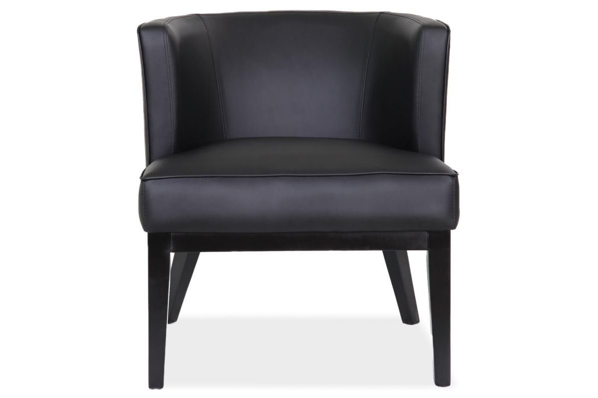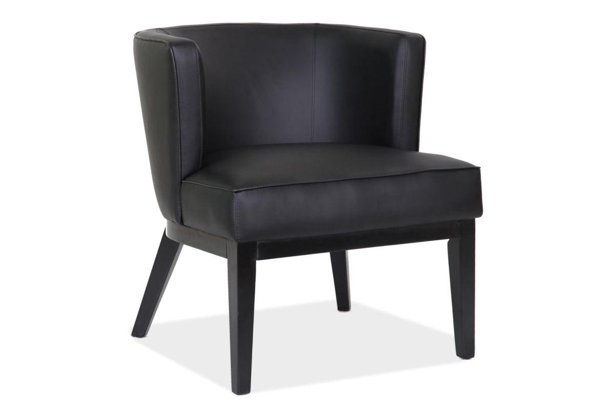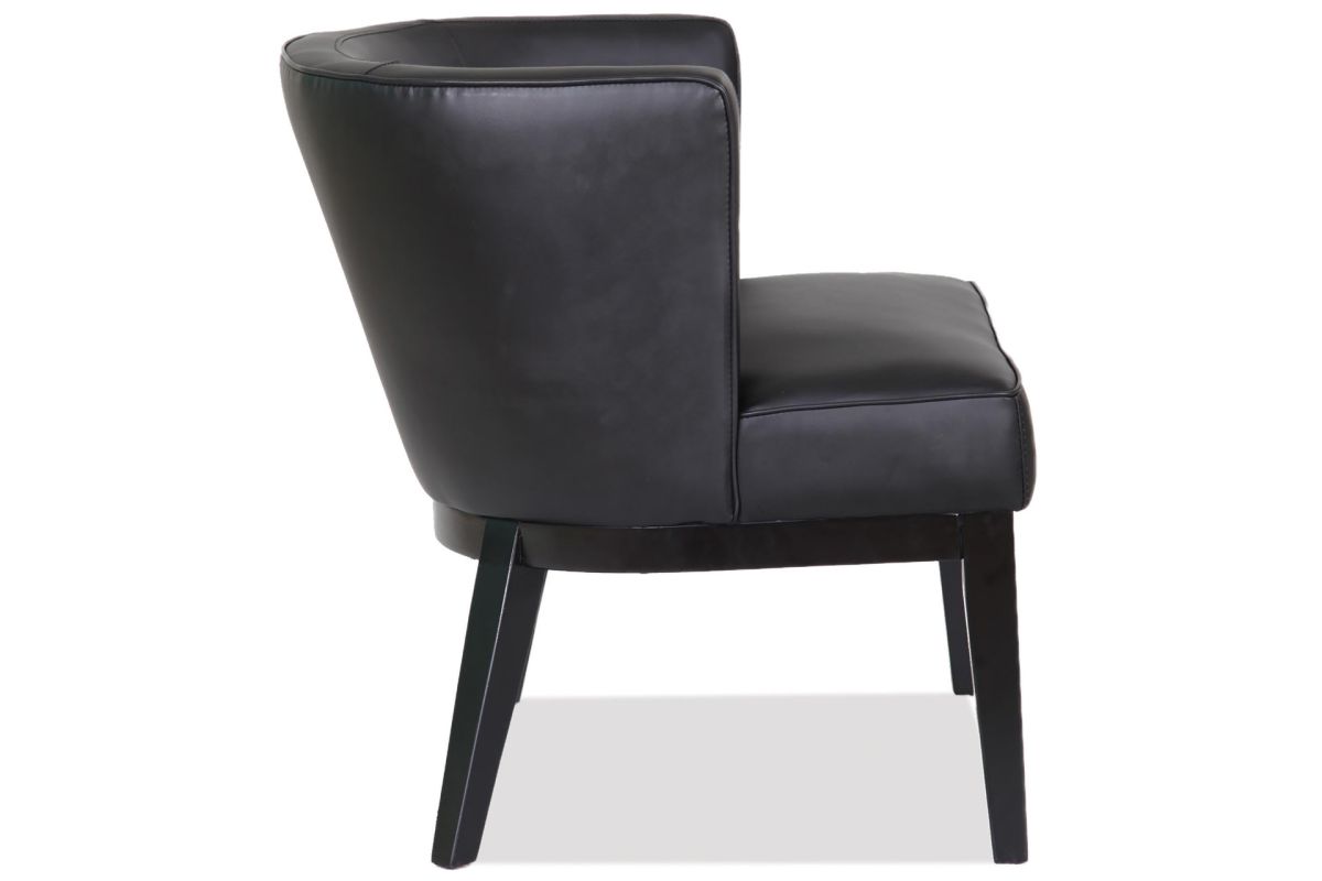 This barrel back arm chair from the Bowery Collection by OfficeSource is very fashionable and perfect as an accent, guest or reception chair. This barrel back arm chair features an extra large padded seat for extra guest comfort, and four black wooden legs.