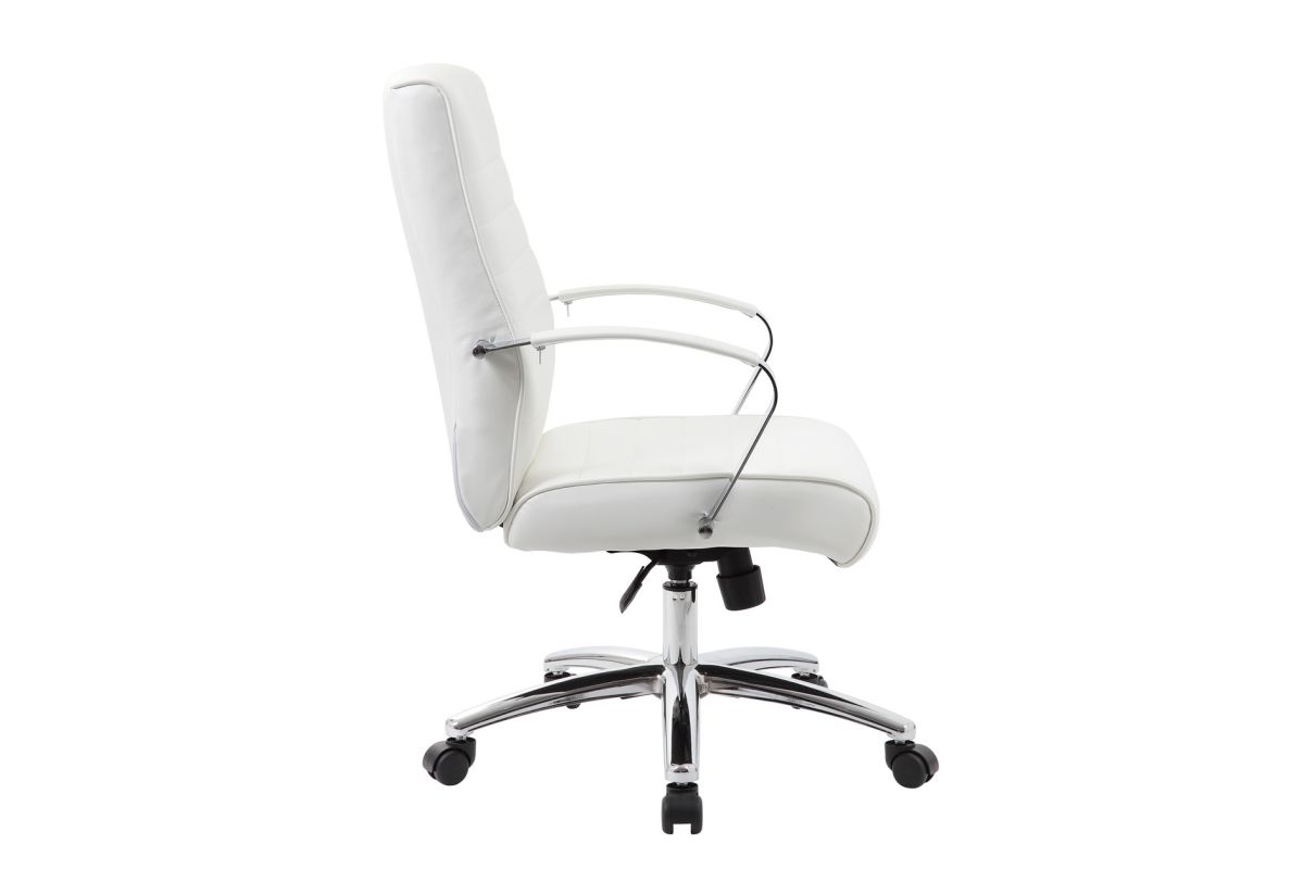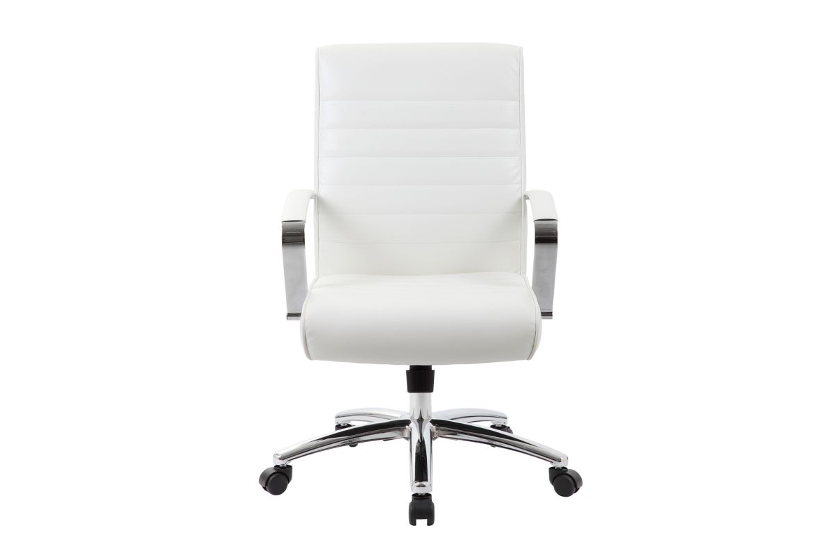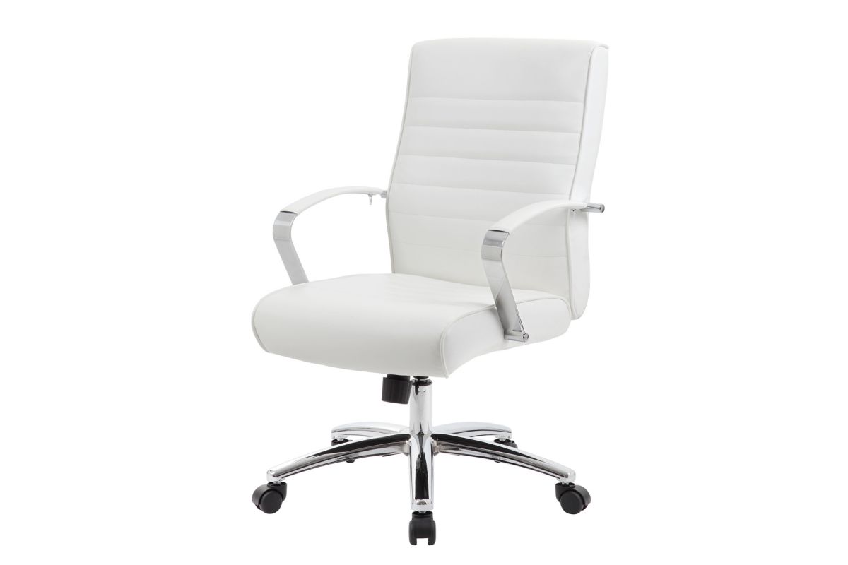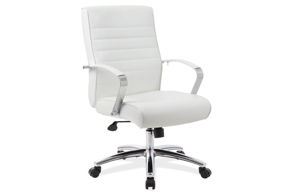 Beautifully upholstered with ultra-soft, durable and breathable PU Leather, this mid back chair from the Studio Collection is the perfect seating option for a long day of work. This chair features a ribbed back and seat cushion, built-in lumbar support and chrome finished, padded armrests. Upright locking position. The control options for this chair include a pneumatic gas lift seat height adjustment, adjustable tilt tension control and swivel control. This chair comes with a large 27'' chrome base for greater stability and hooded double wheel casters for easy mobility. This mid back chair comes upholstered in your choice of four stunning colors.
