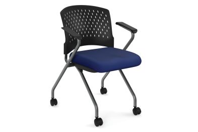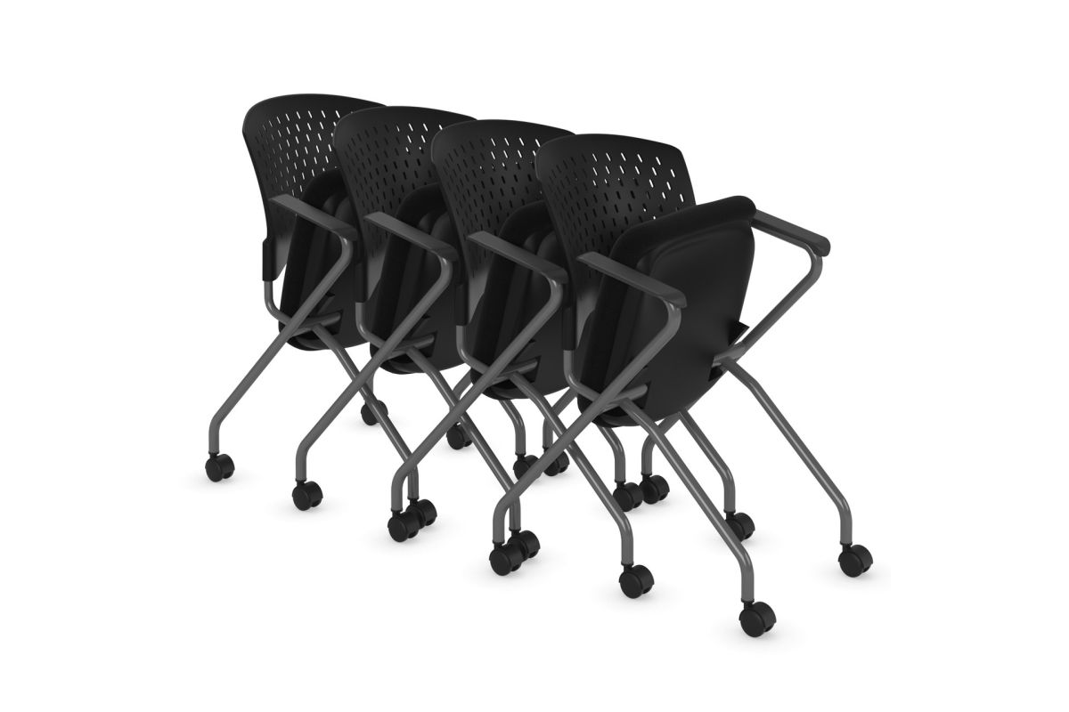 Nesting Chair with Arms and Casters features chairs with a titanium frame and fabric seats. It comes in a variety of upholstery colors. Assembly is required.