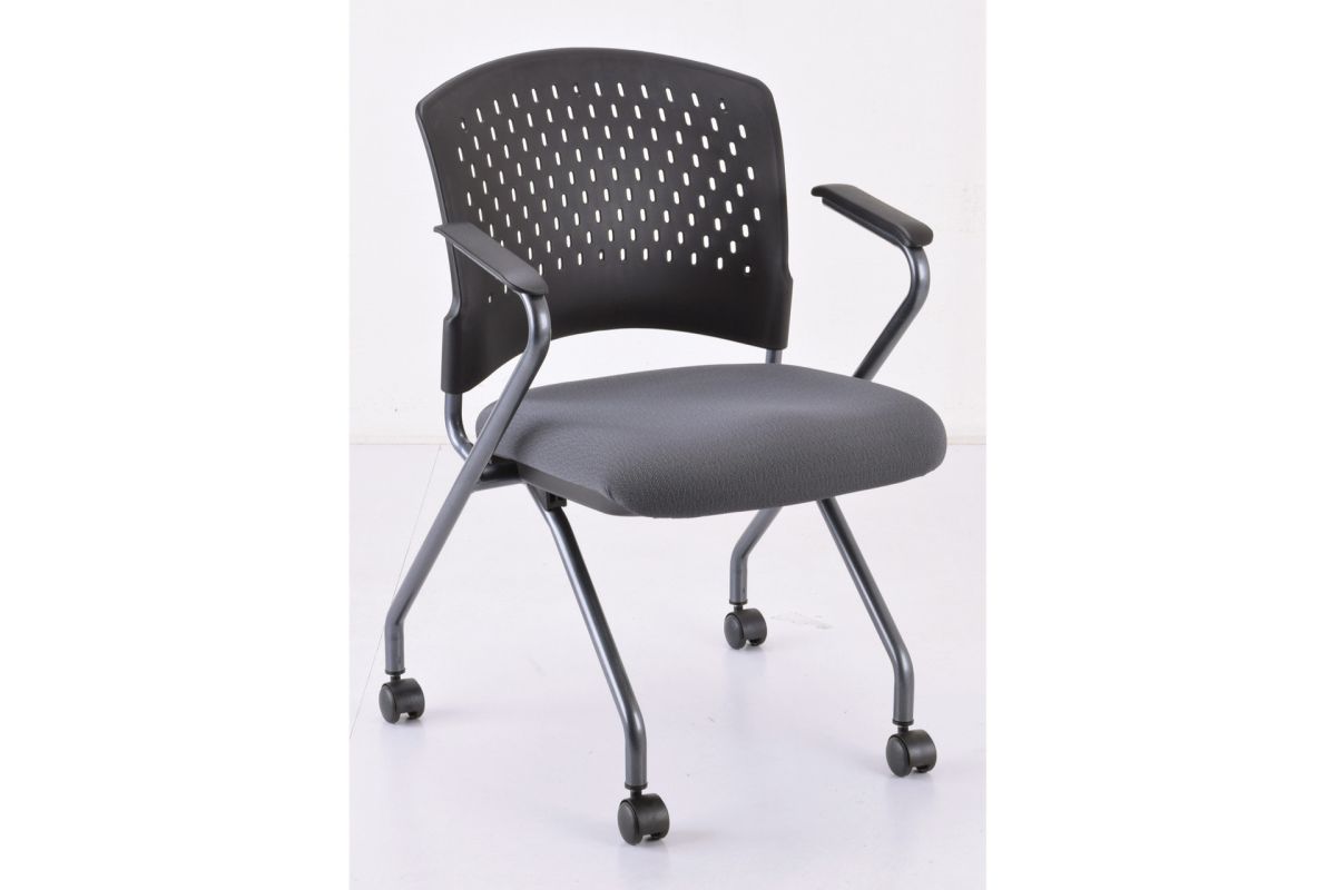 Nesting Chair with Arms and Casters features chairs with a titanium frame and fabric seats. It comes in a variety of upholstery colors. Assembly is required.