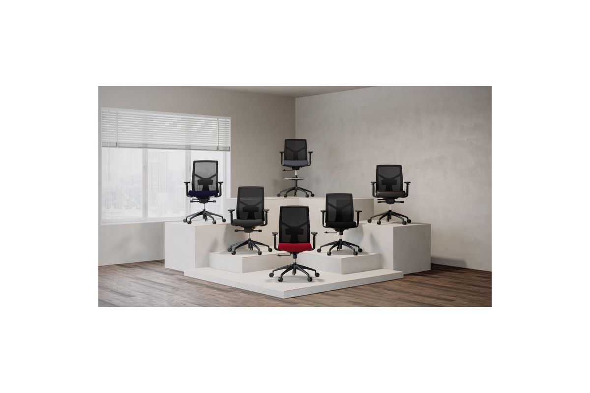 - Wide, comfortable upholstered seat with waterfall front edge; available in a wide variety of colors complemented by a unique black textured mesh back