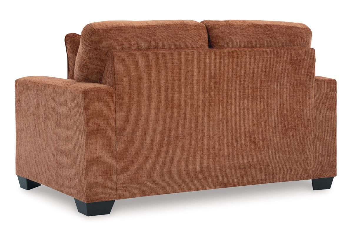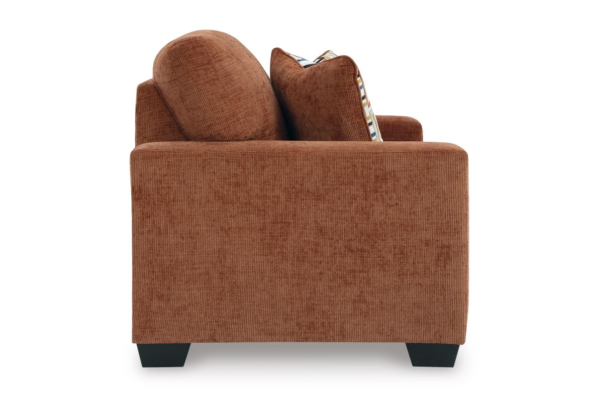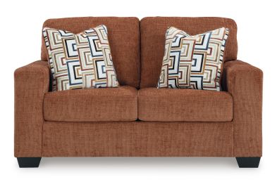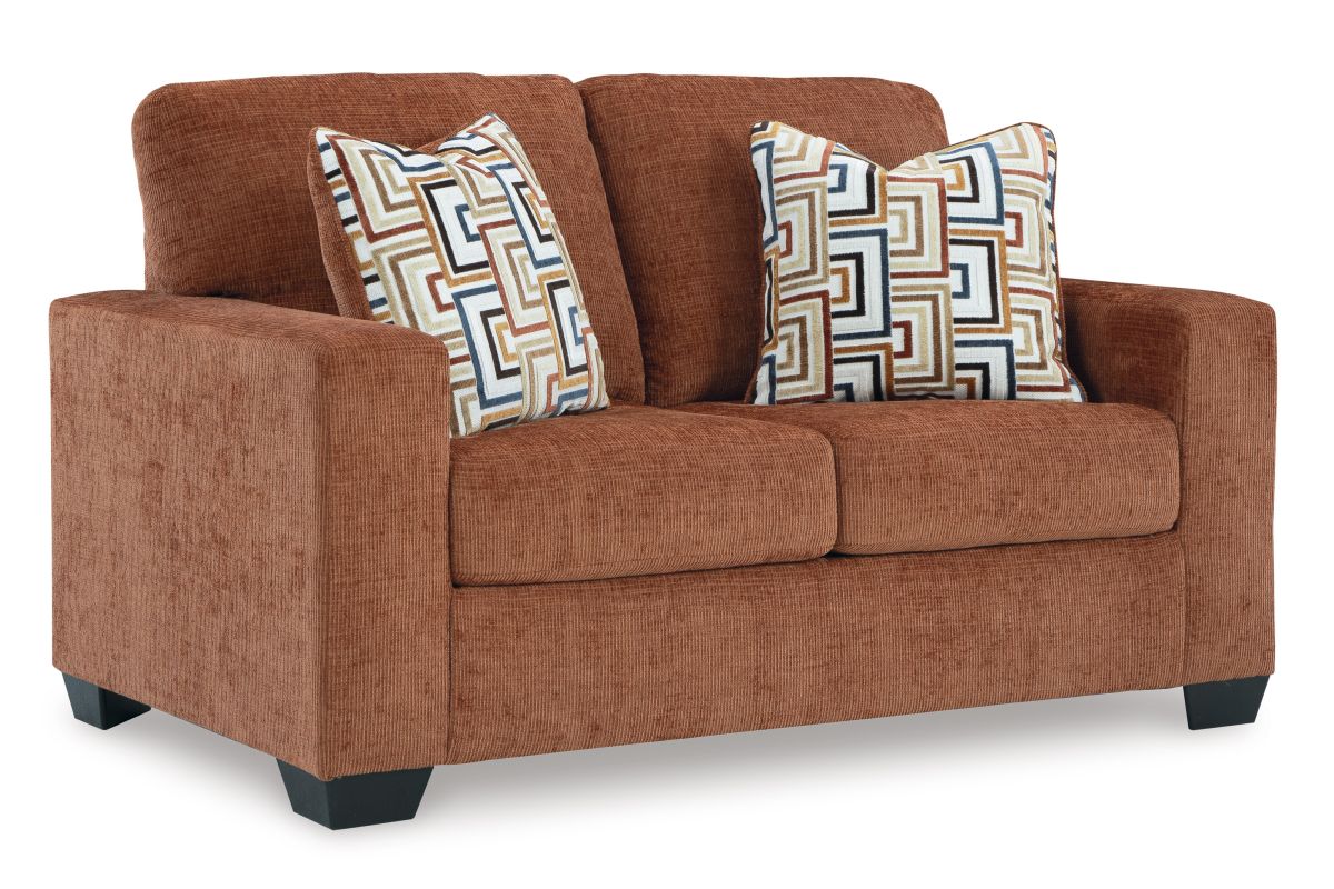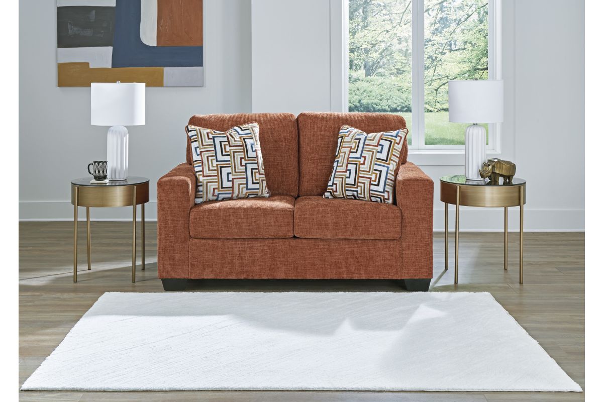 Looking to make a bold statement with color? Liven up your living room with this loveseat. Its trend-right burnt orange upholstery adds a playful pop of color to your decor. Bold and eclectic accent pillows complete the look. Pairing posh style with everyday comfort, this piece is a welcome addition to contemporary spaces.