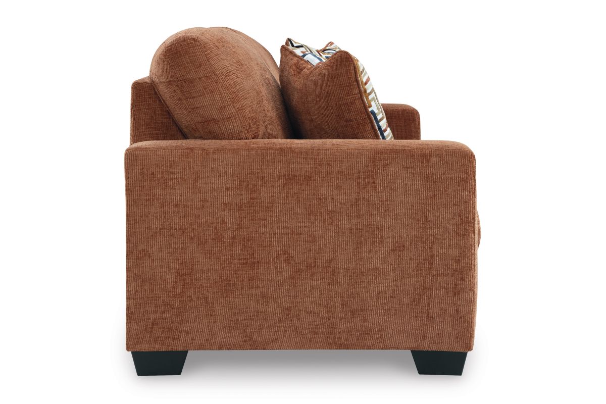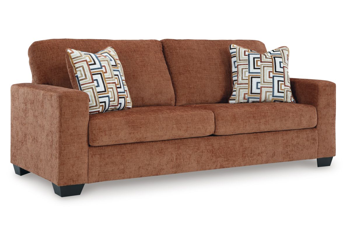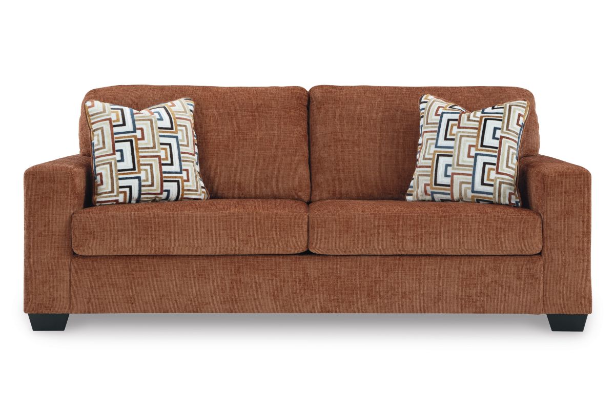 Looking to make a bold statement with color? Liven up your living room with this sofa. Its trend-right burnt orange upholstery adds a playful pop of color to your decor. Bold and eclectic accent pillows complete the look. Pairing posh style with everyday comfort, this piece is a welcome addition to contemporary spaces.