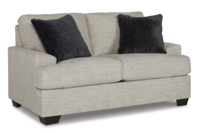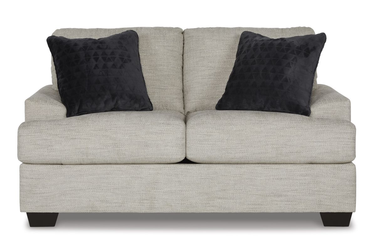 Laid-back luxury meets neutral practicality in this loveseat. Taking its cues from contemporary design, the clean-lined piece is outfitted with angular arms for a layer of geometric expression. Softly upholstered, sizable cushions keep you comfortable, while black faux fur accent pillows bring a touch of soft glam. With this loveseat, winning style and superb functionality go hand in hand.