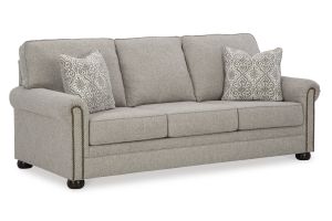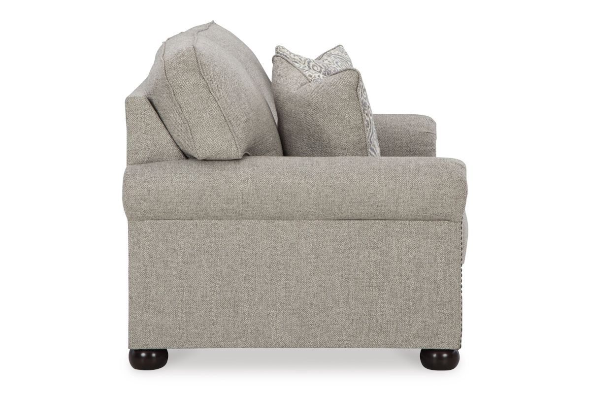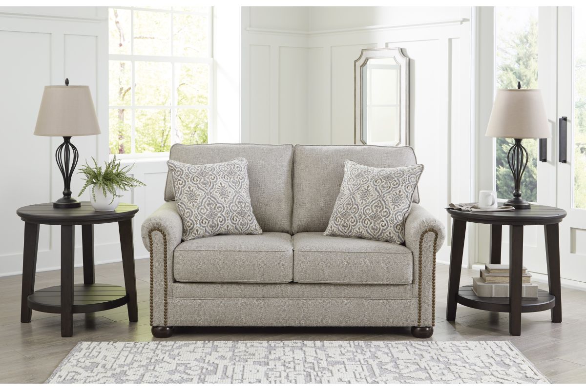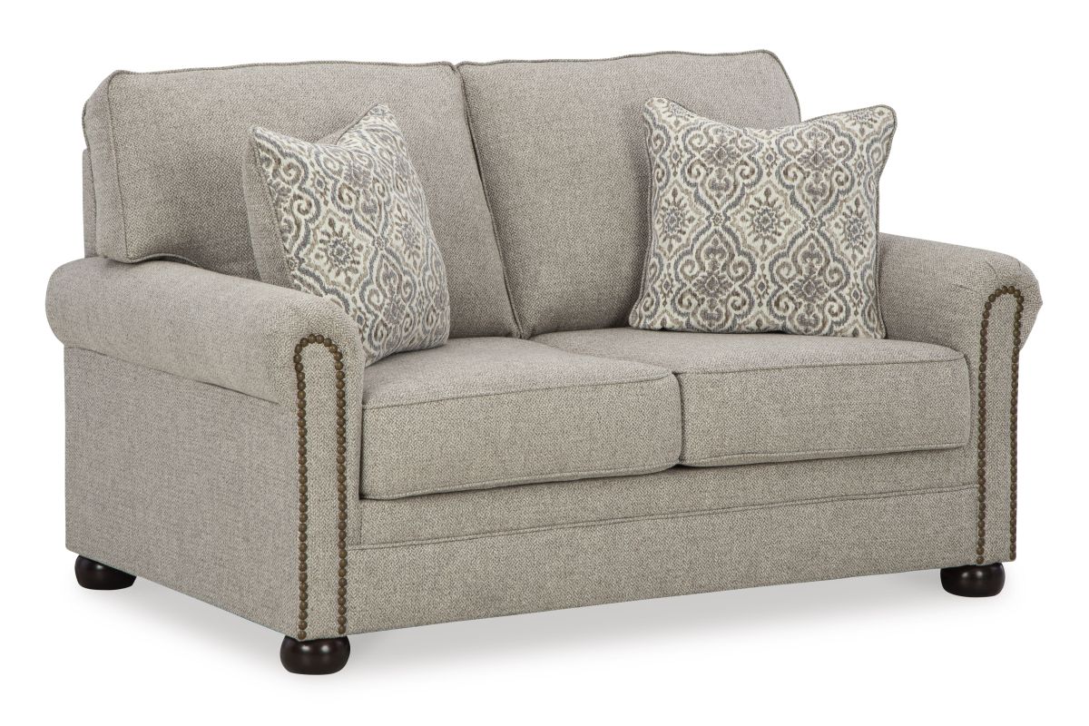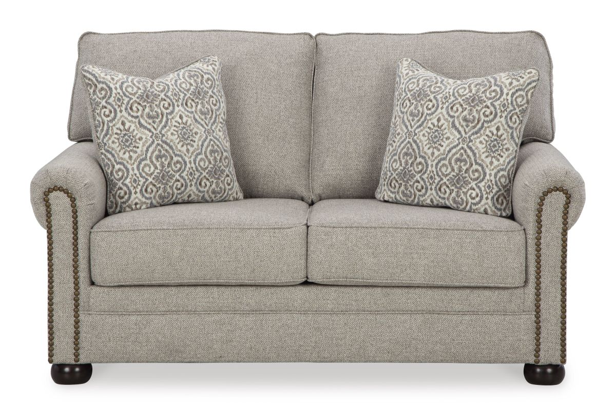 Inspired by the past but rooted firmly in the present, this loveseat complements your transitional seating area. Its versatile upholstery is delightfully detailed for a subtle herringbone effect. Designer touches like decorative nailhead trim and bun legs add traditional character. With this loveseat's reliable style and comfort, all you need to do is sit back and relax. No assembly required.