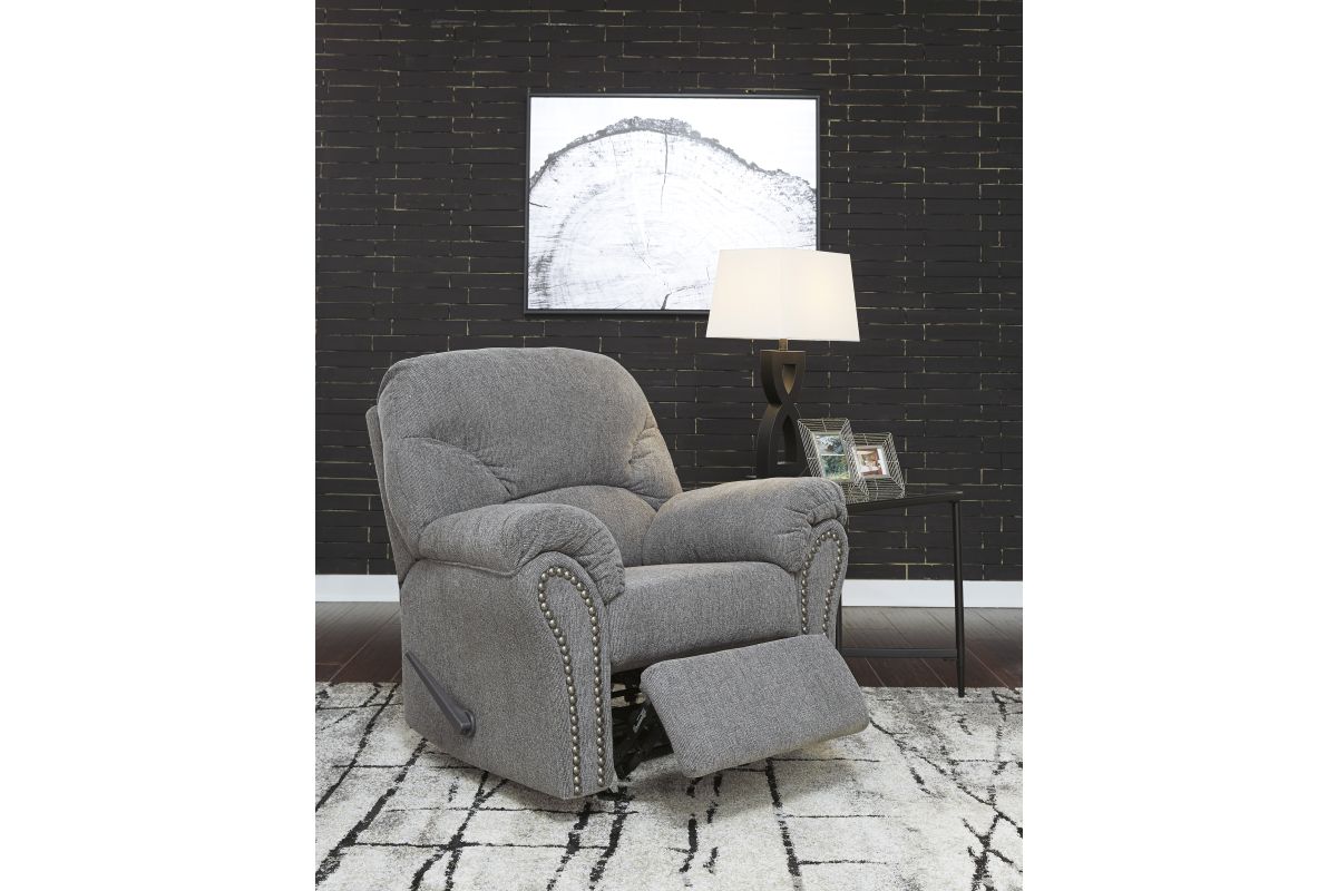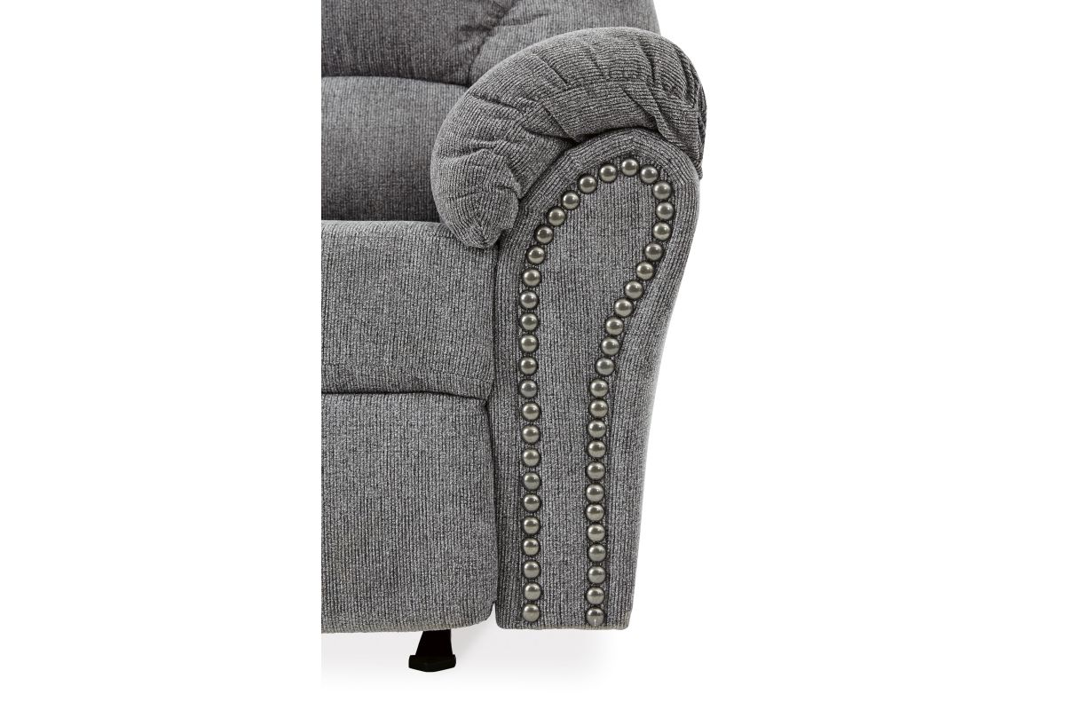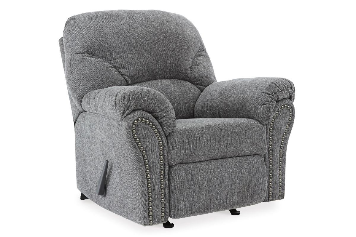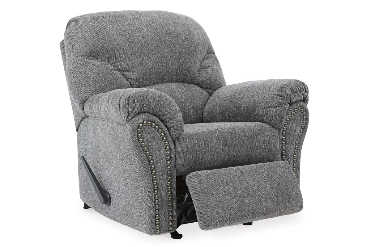 Why sacrifice comfort for style (or style for comfort) when you can have the best of both in this rocker recliner in pewter gray. Elements include a chic divided-back design and pillow top wrapped armrests that make nodding off all too easy. Calling attention to the elegantly flared armrests—black nickel nailhead trim for a punch of cool character. Minimal assembly is required.