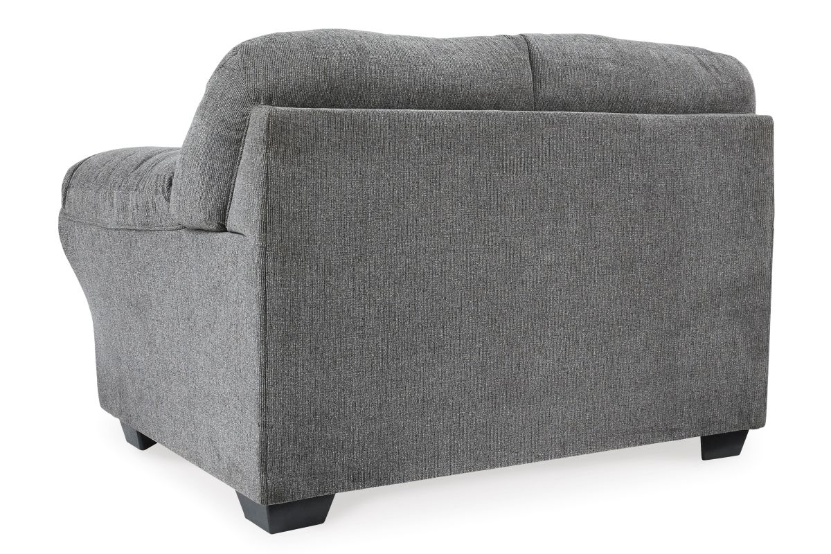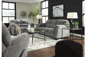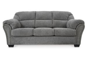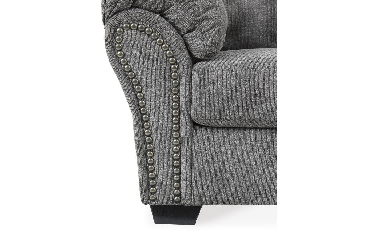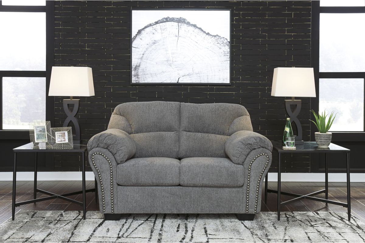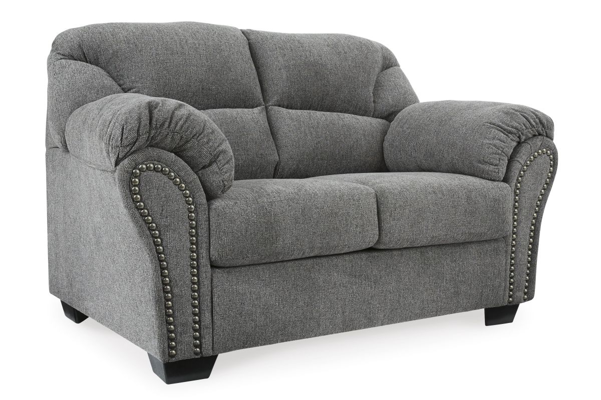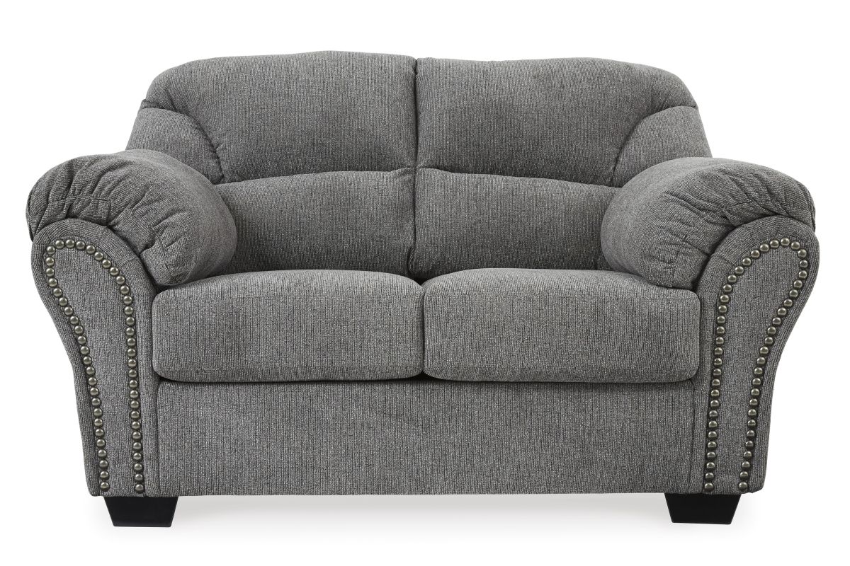 Why sacrifice comfort for style (or style for comfort) when you can have the best of both in this loveseat in pewter gray. Elements include a chic divided-back design and pillow top wrapped armrests that make nodding off all too easy. Calling attention to the elegantly flared armrests—black nickel-tone nailhead trim for a punch of cool character.