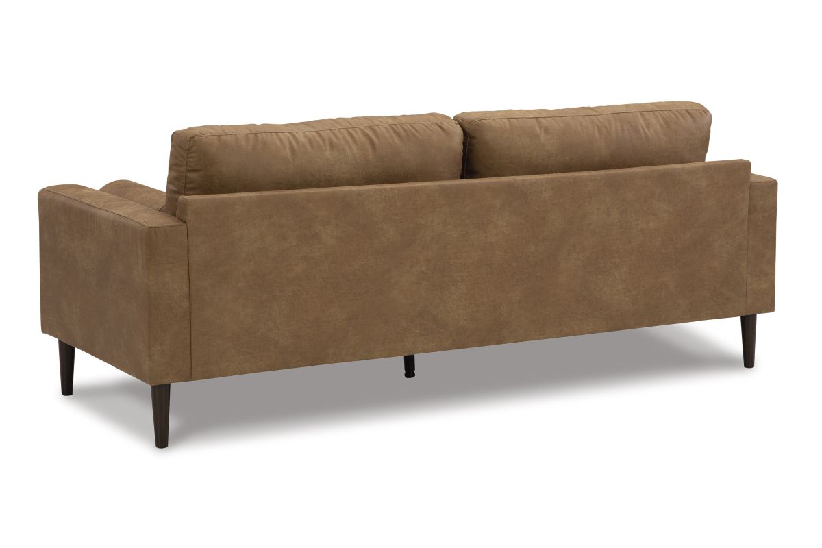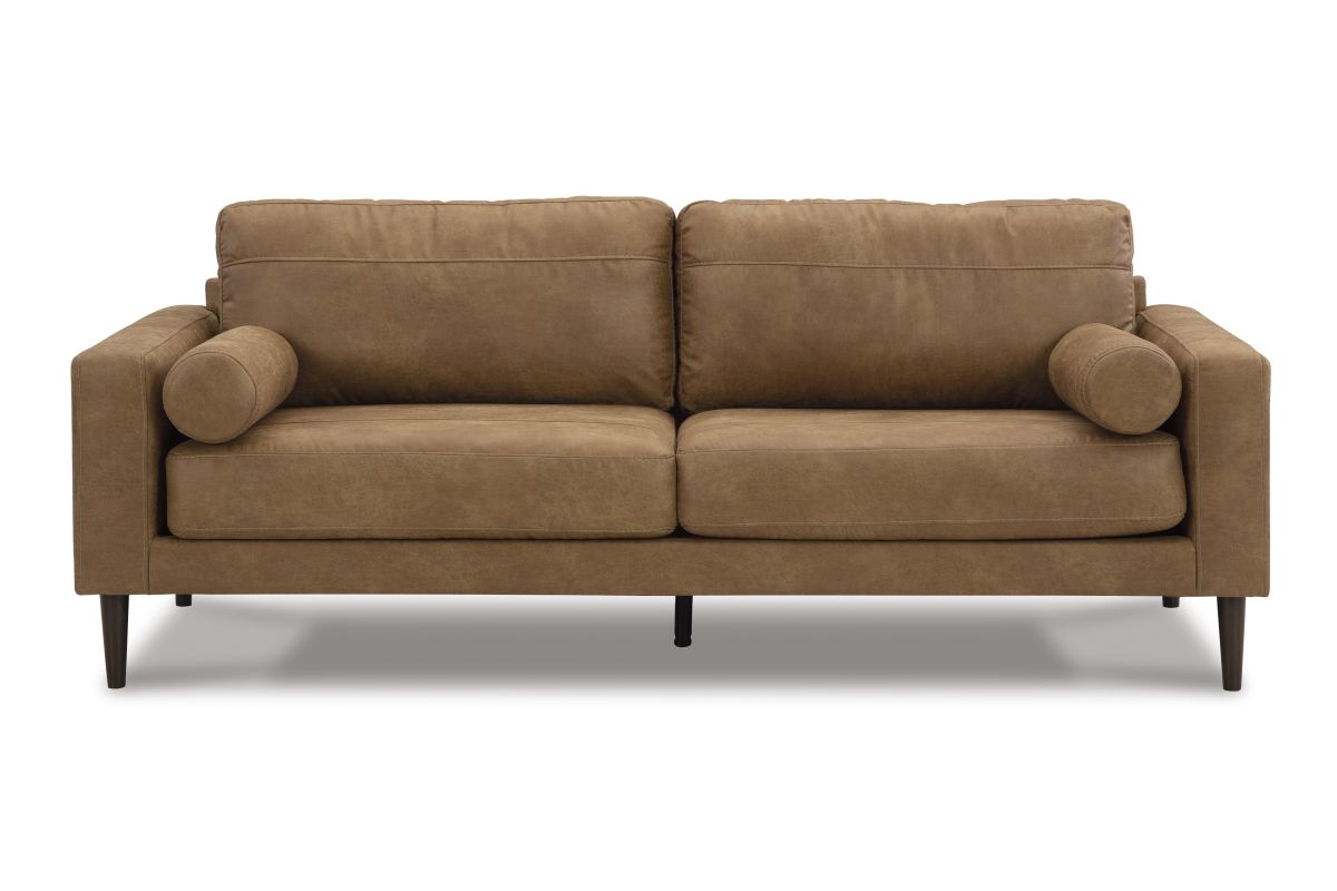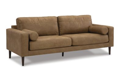 Small-scale style, tailored to perfection. This sofa echoes retro aesthetics with warm caramel faux leather, while its ultra-linear silhouette incorporates a contemporary edge. Versatile in form and function, the seat suits styles from modern boho to transitional. And its size helps you to confidently curate your compact space without sacrificing comfort (or your budget).