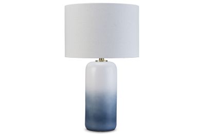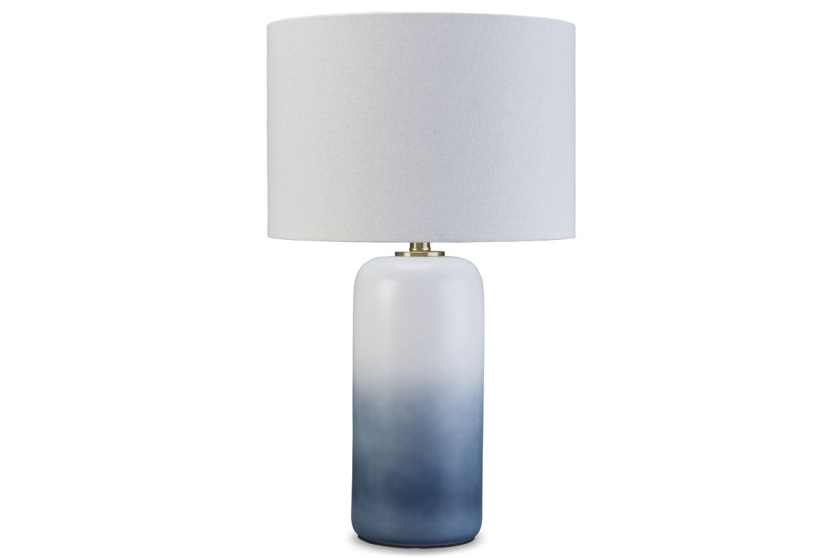 A dramatic ombré design defines this table lamp. Crafted of ceramic, it features broad, saturated bands of color that gradually fade to white toward the top. A natural fabric shade extends the tonal gradation and provides a tailored finishing touch. Assembly required.