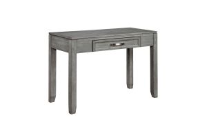 The Garretson Collection blends transitional lines with rustic styling to create an elegant addition for your bedroom. The okume veneer of the desk features a gray finish, and a centrally located single drawer with a silver-finished metal bar pull. Assembly required.
