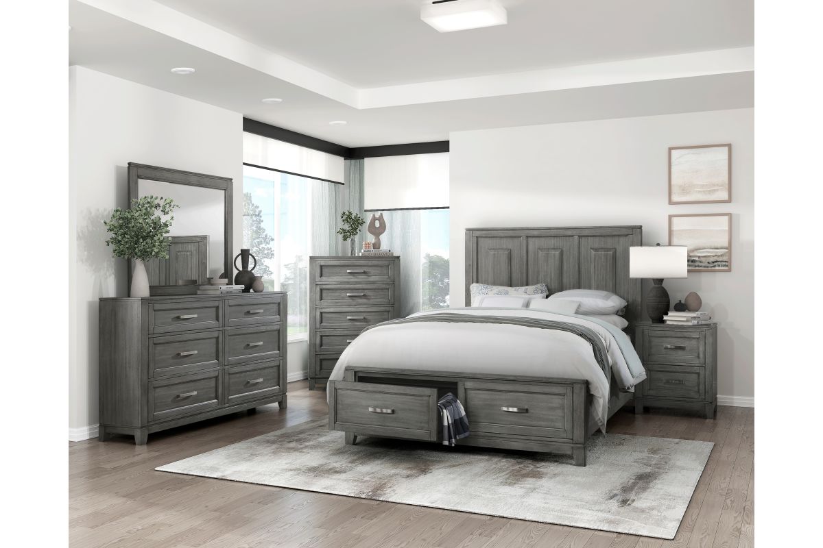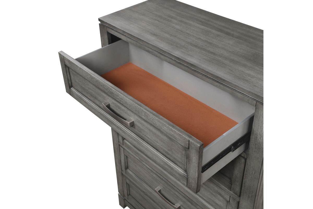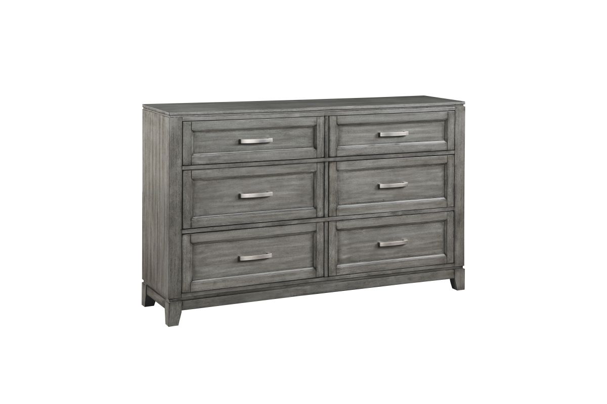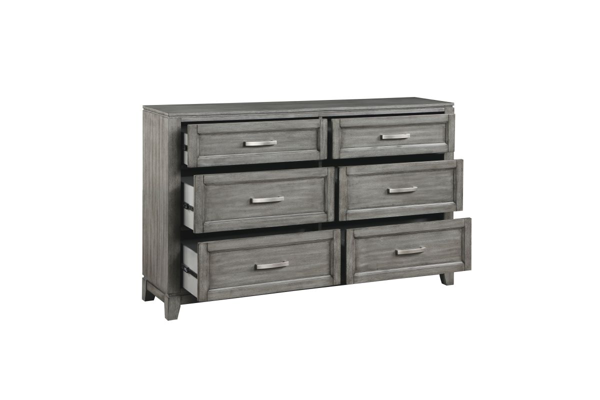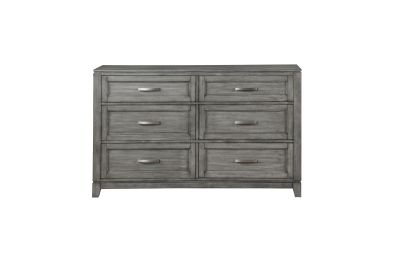 The Garretson Collection blends transitional lines with rustic styling to create an elegant addition for your bedroom. The distinct grain of the okume veneer features a gray finish. Metal bar hardware accents the picture frame drawer fronts of the dresser. Assembly required.