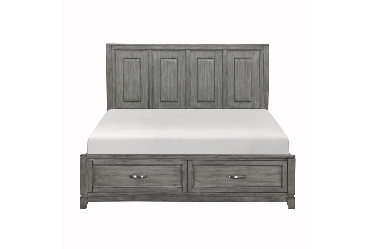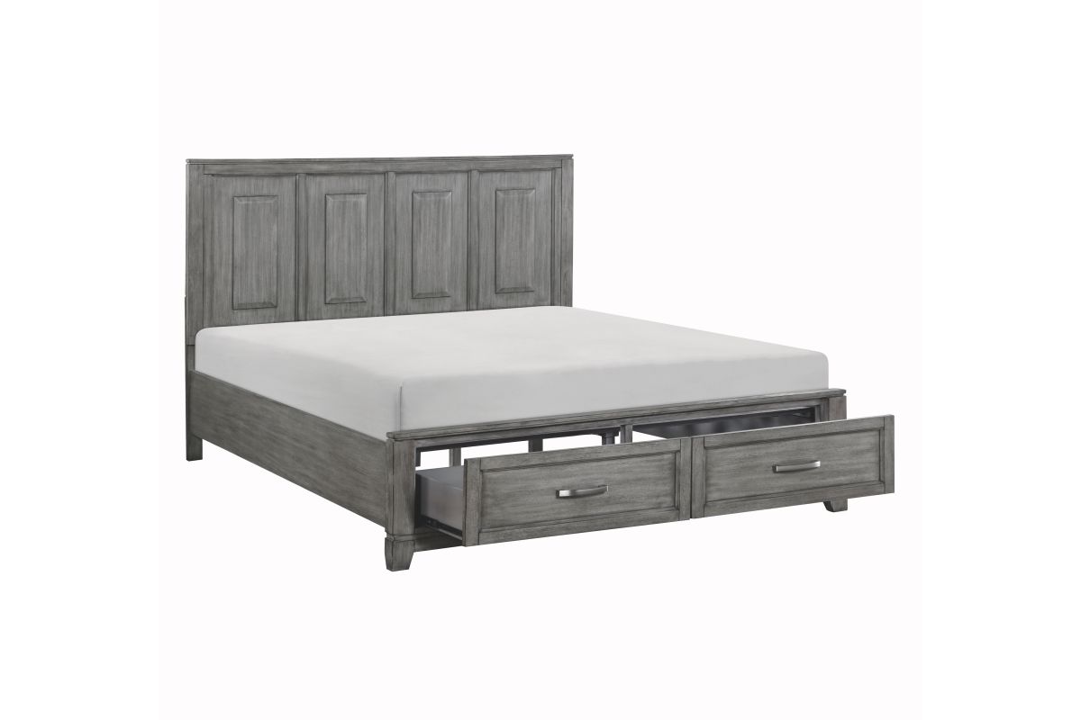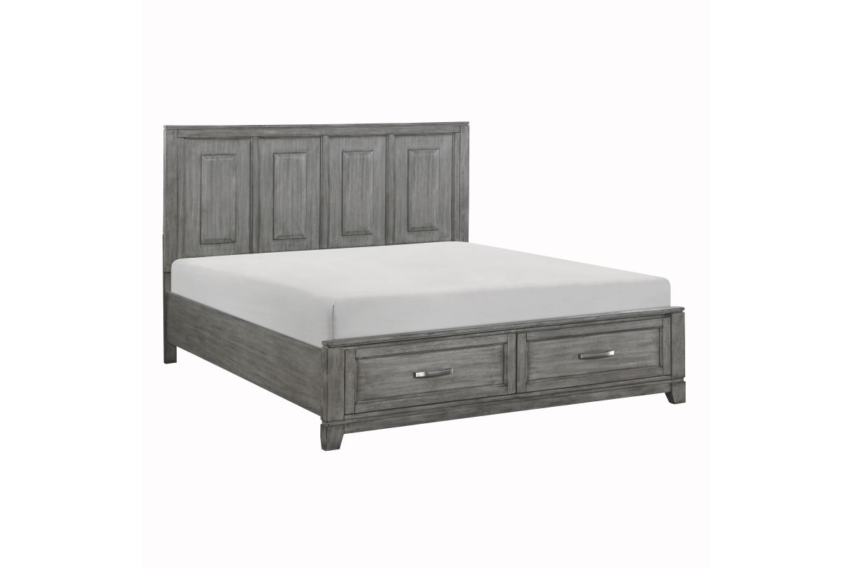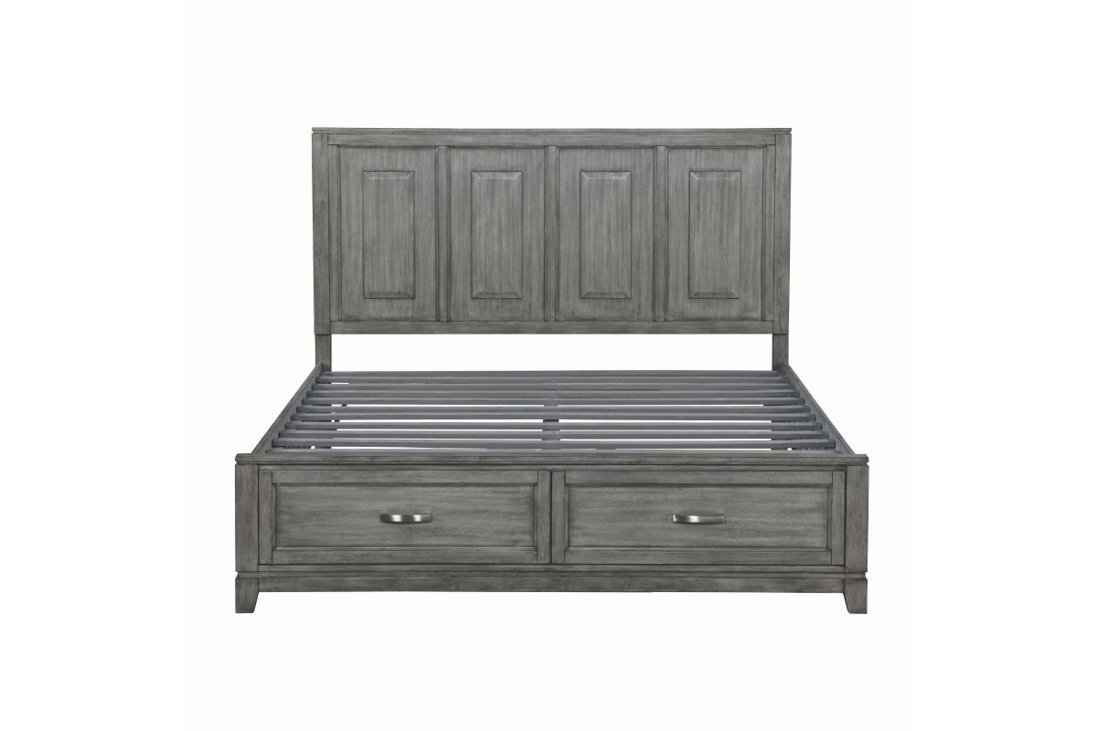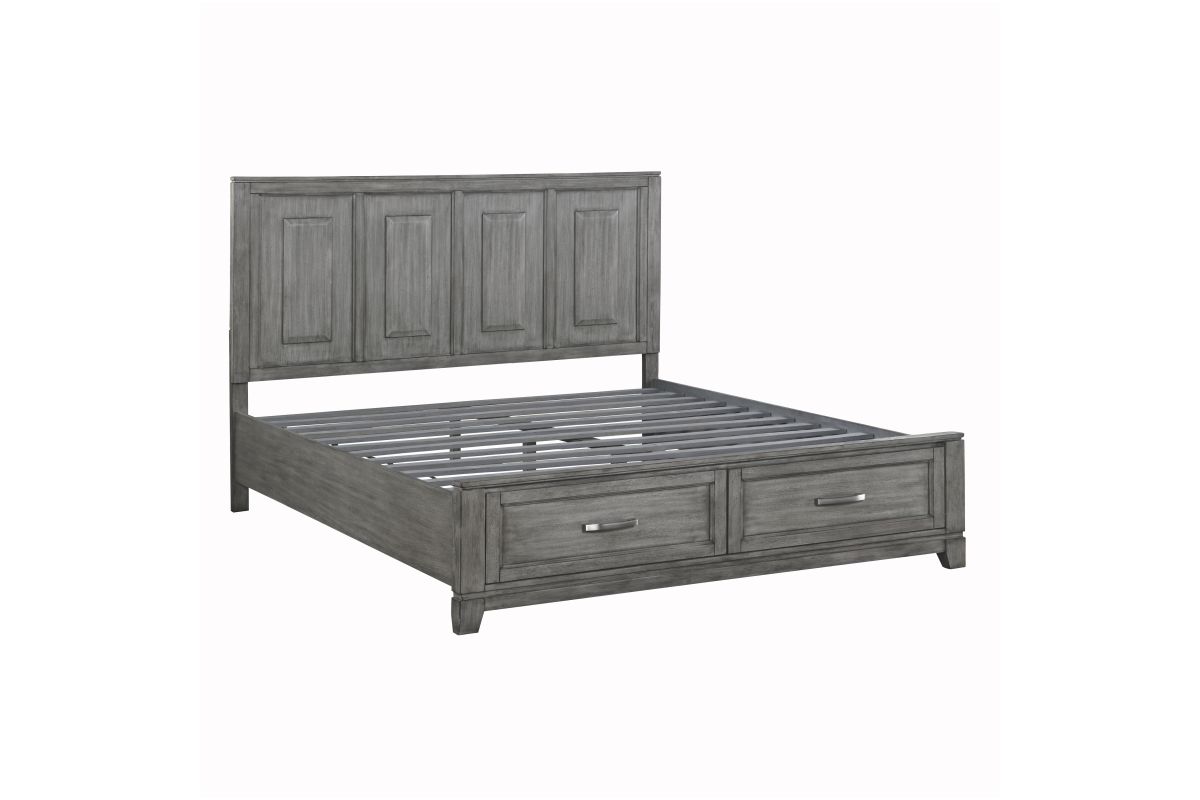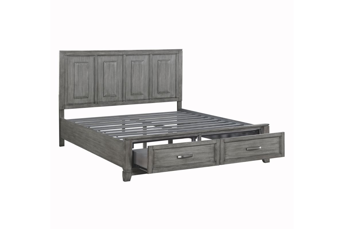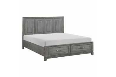 The Garretson Collection blends transitional lines with rustic styling to create an elegant addition for your bedroom. The distinct grain of the okume veneer features a gray finish. The Eastern King bed features metal bar hardware on the picture frame drawer fronts of the low-profile storage footboard, the two drawers creating additional space within your room for soft good storage. Assembly required.