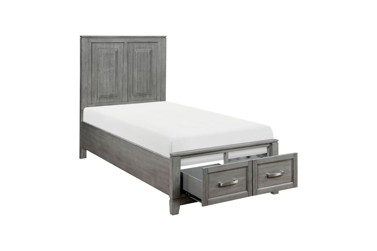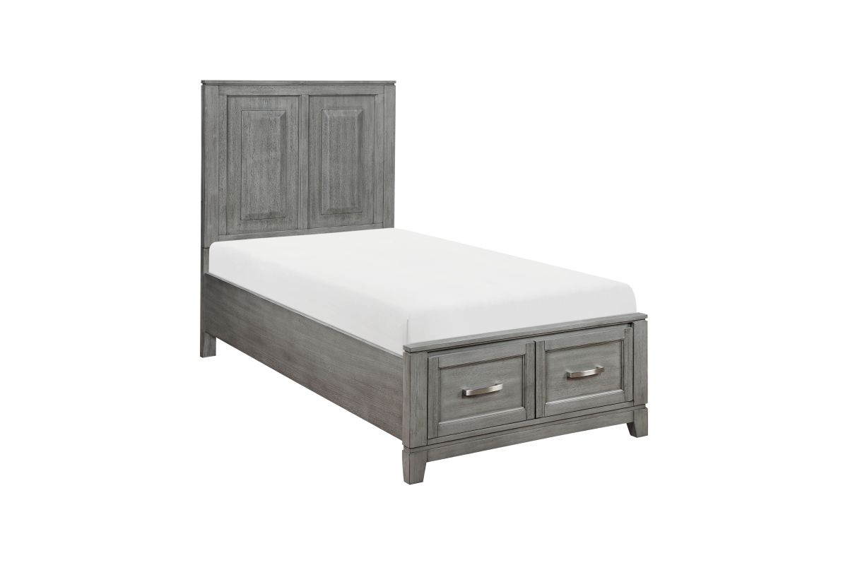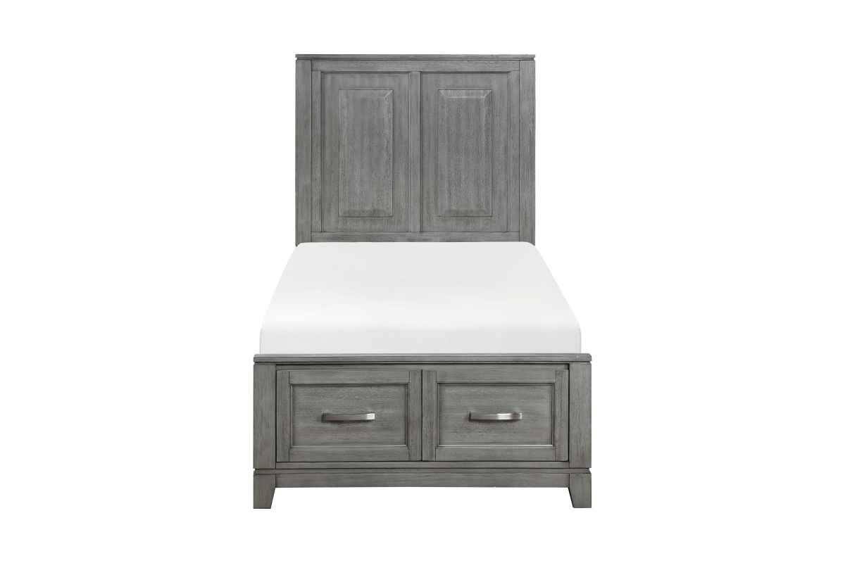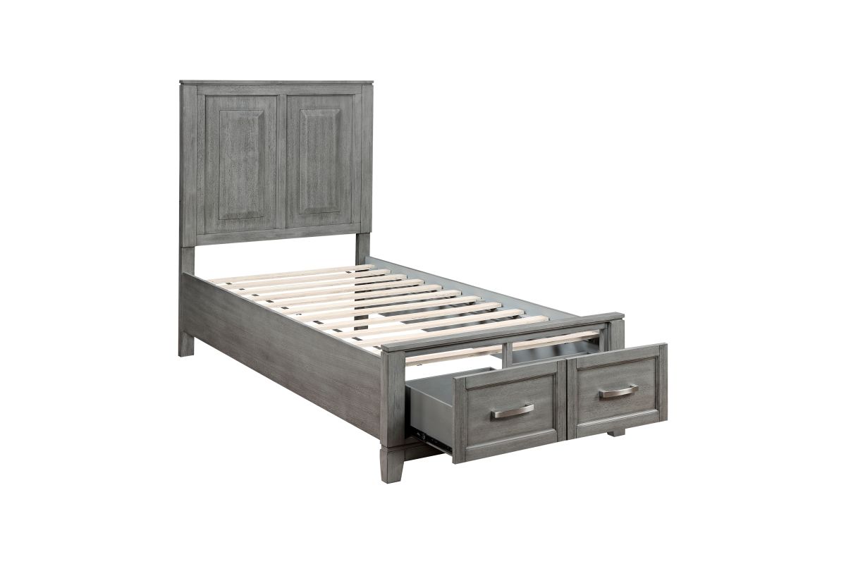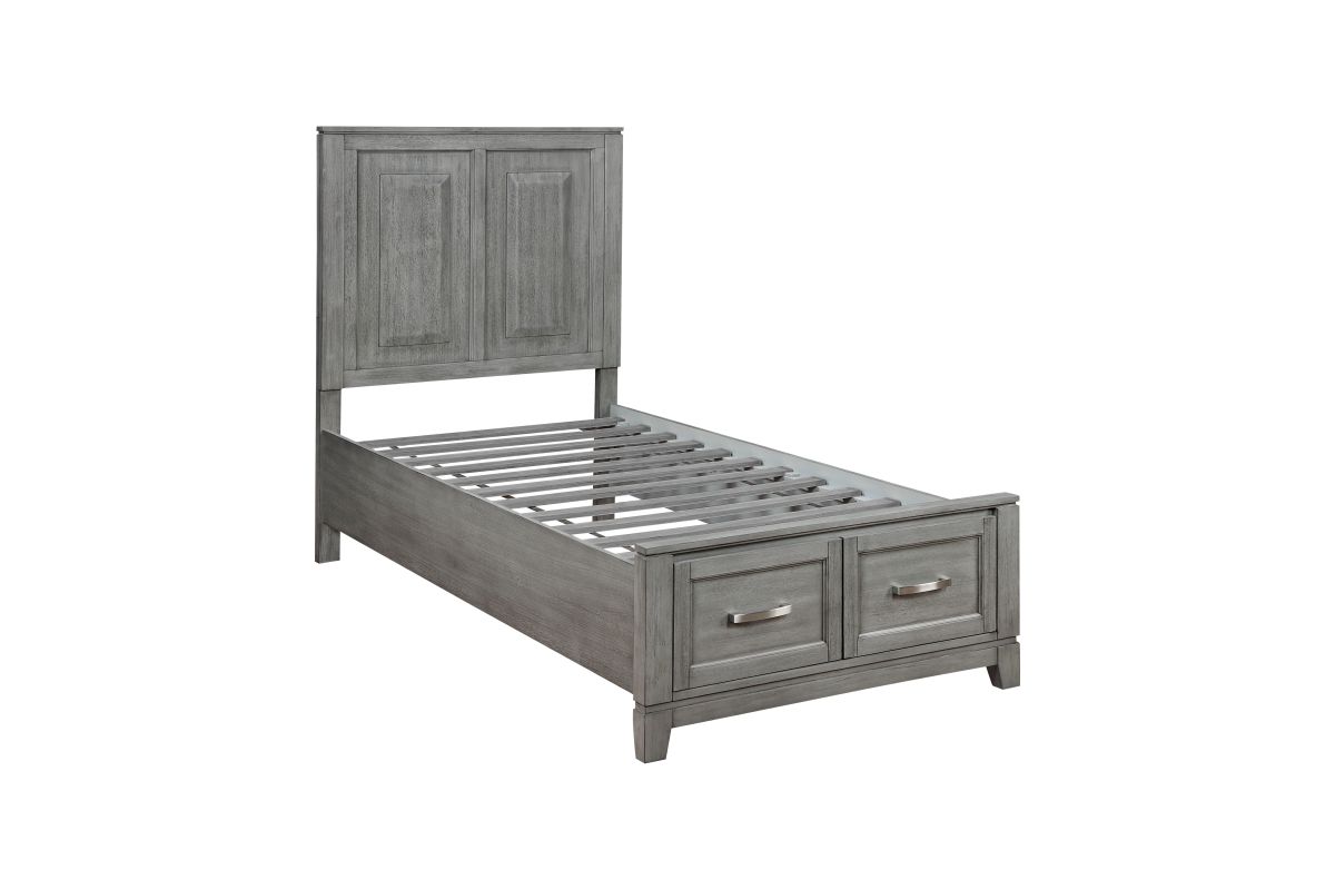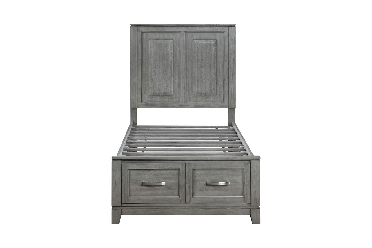The Garretson Collection blends transitional lines with rustic styling to create an elegant addition for your bedroom. The distinct grain of the okume veneer features a gray finish. The twin bed features metal bar hardware on the picture frame drawer fronts of the low-profile storage footboard, the two drawers creating additional space within your room for soft good storage. Assembly required.