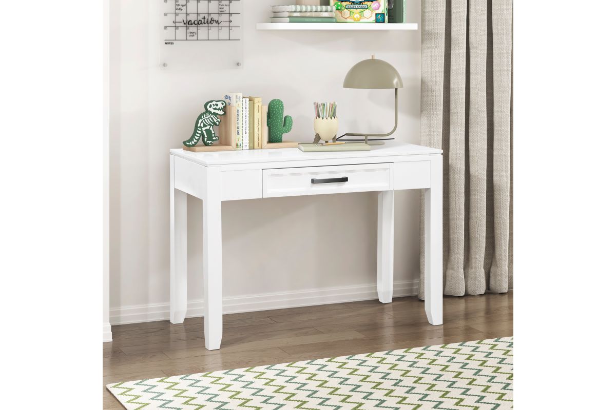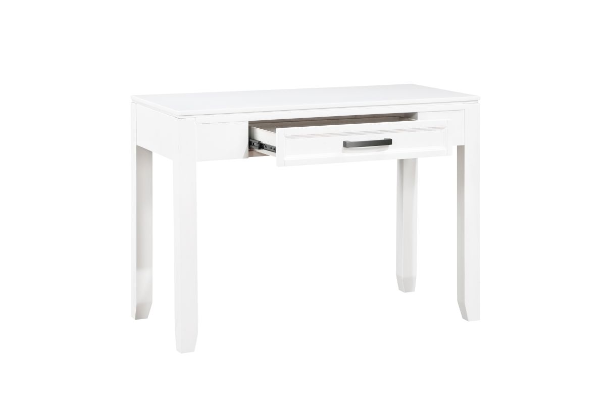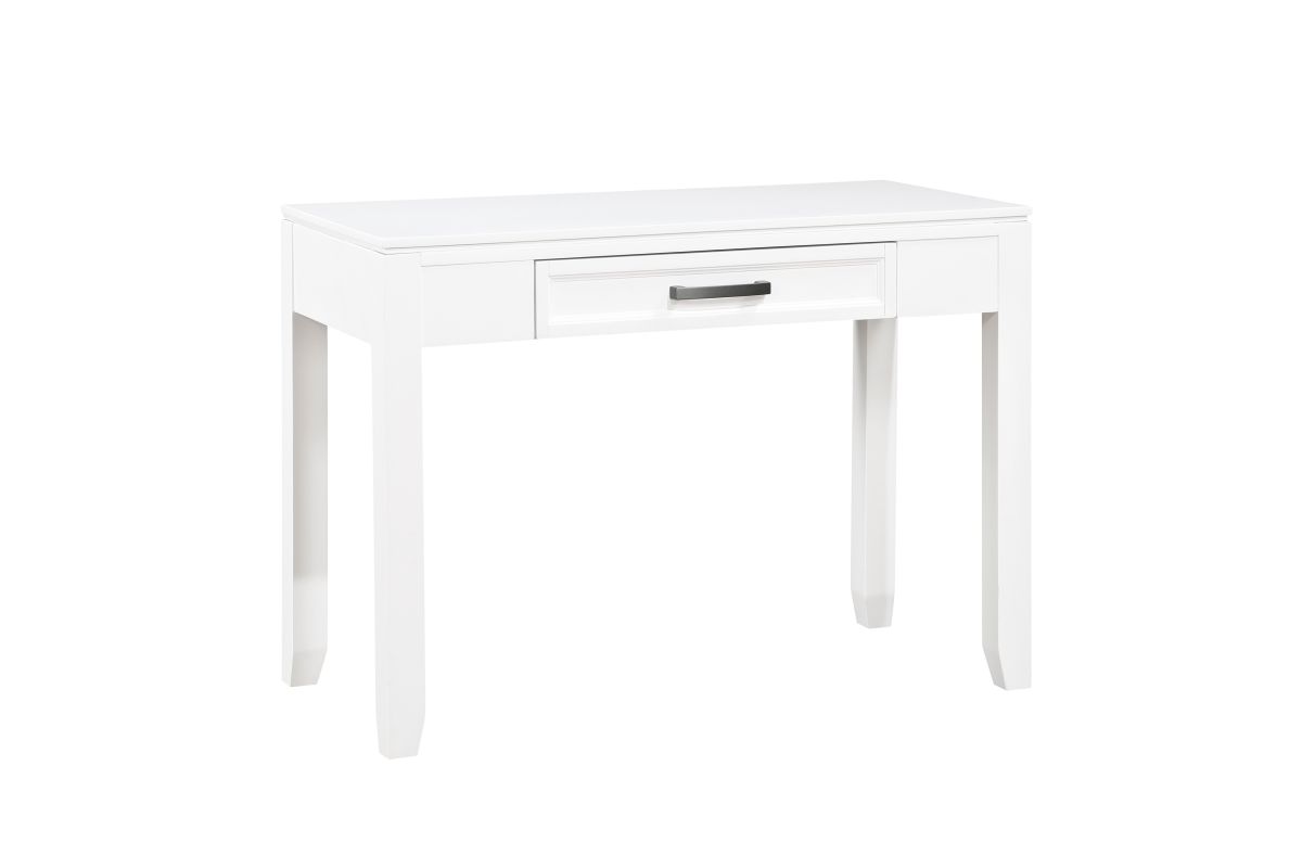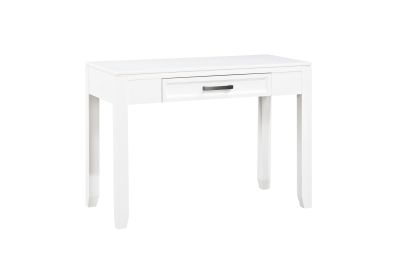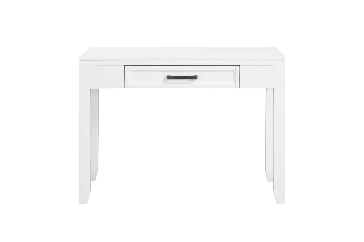 The Garretson Collection blends transitional lines with rustic styling to create an elegant addition for your bedroom, living room, or home office. The desk features a white finish, and a centrally located single drawer with a black-finished metal bar pull.