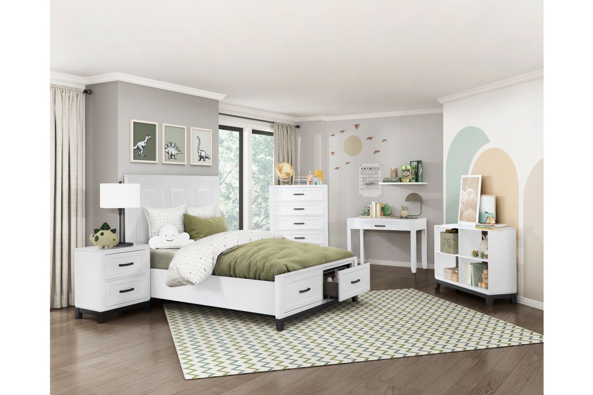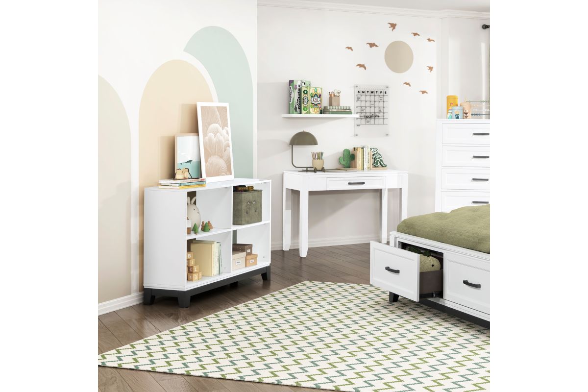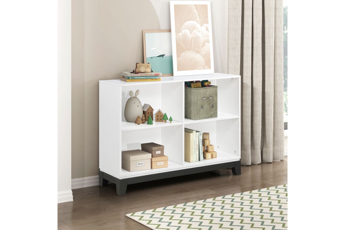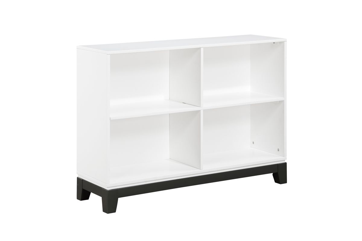 The Garretson Collection blends transitional lines with rustic styling to create an elegant addition for your bedroom, living room, or home office. The 4-shelf bookcase features a white finish and contrasting black finish base rail. Assembly required.