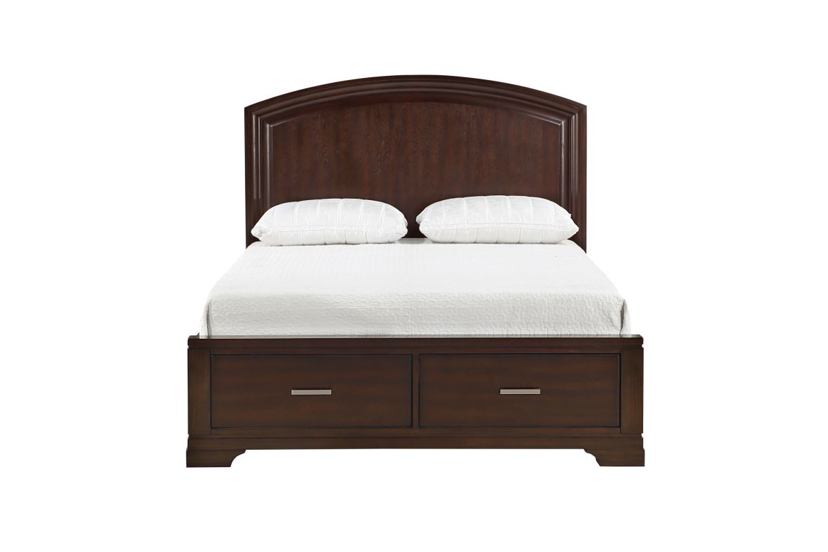 The intersection of modern lines and understated transitional style blend to create the Hudson Collection.The cherry finish over birch veneer of the queen bed presents a decoratively versatile addition to your bedroom. Polished chrome bar hardware fronts the storage drawers of the bed’s footboard. The curved design of the bed’s headboard lends subtle decorative shape to the collection. Assembly required.