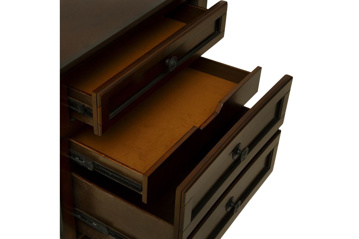 - Bottom drawer with felt-lined jewelry tray