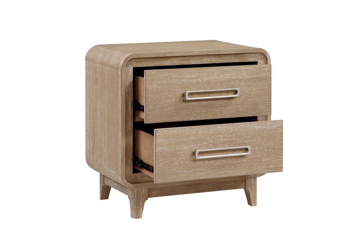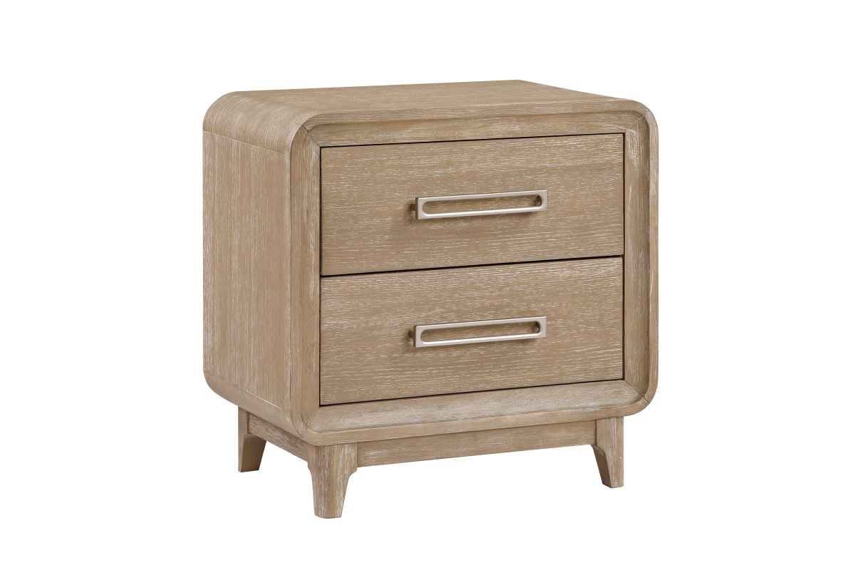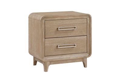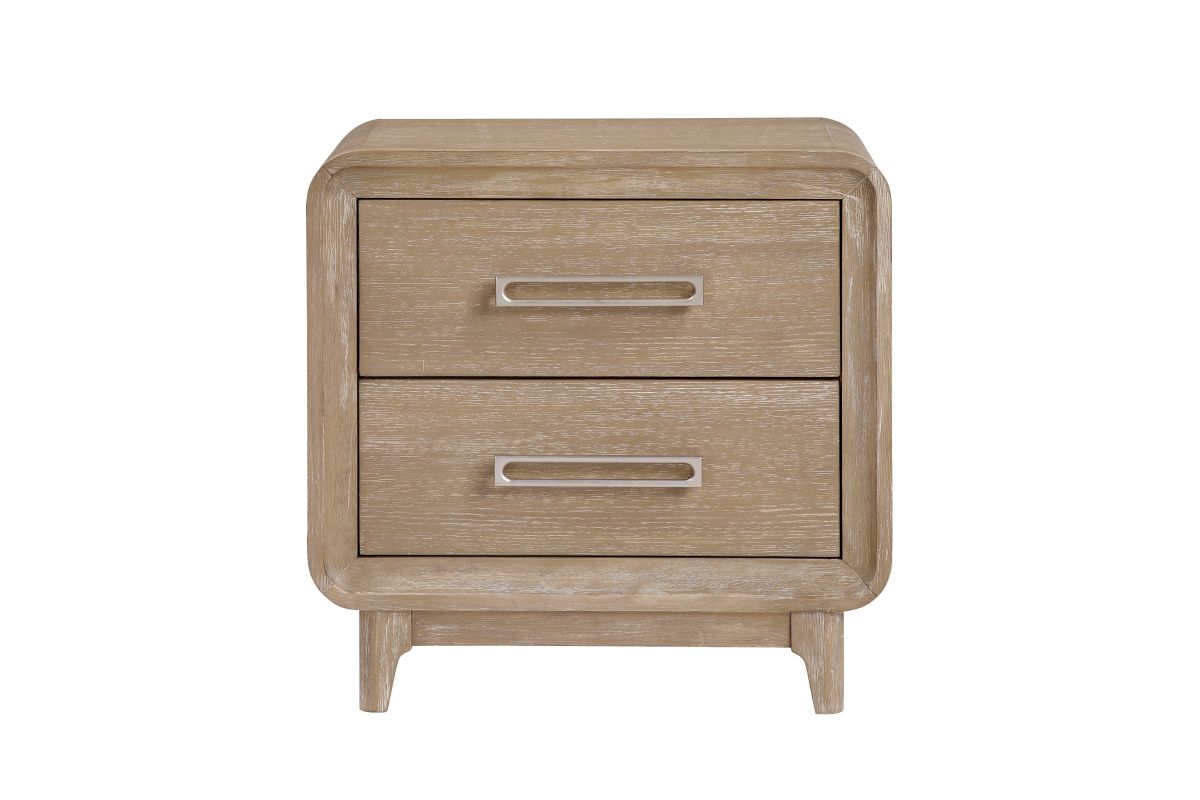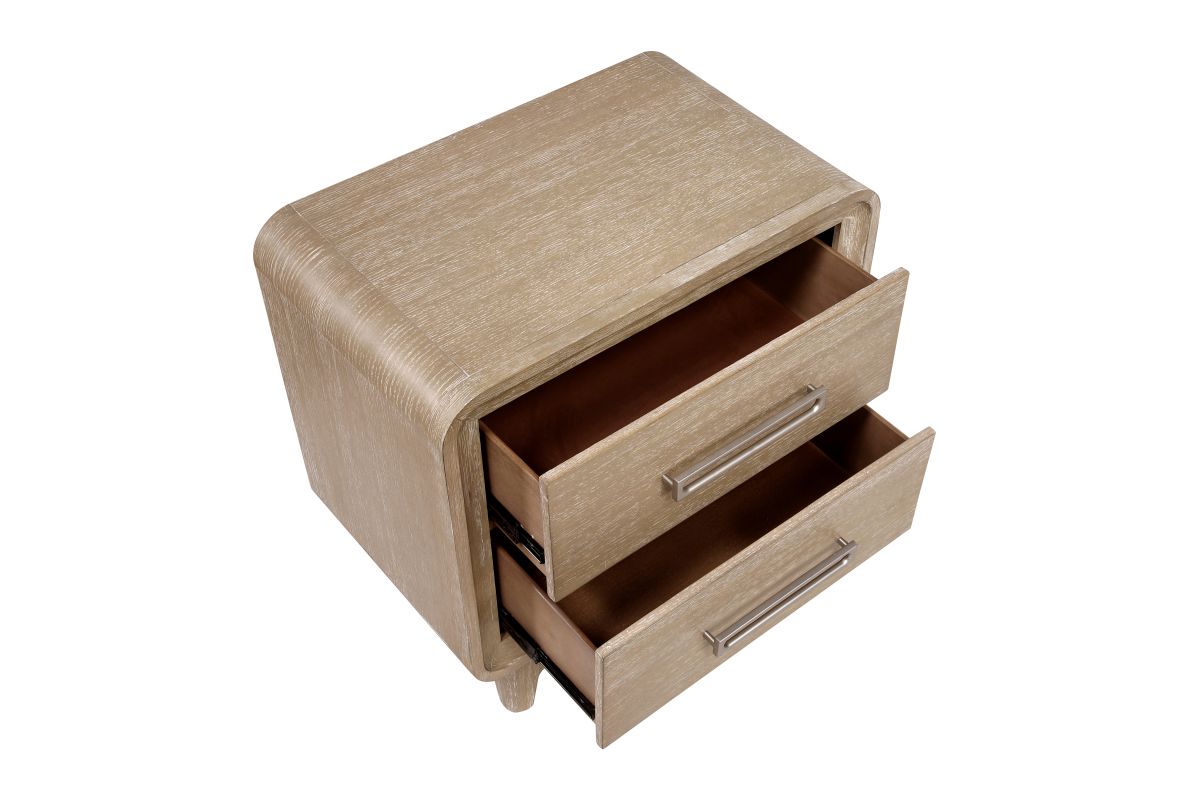This exquisitely designed nightstand is the perfect blend of elegant style and practical bedside storage, offering a serene addition to your bedroom. Crafted from a durable combination of oak veneer, solid wood, and engineered wood, this nightstand ensures lasting stability and strength. The beautiful natural finish highlights the wood's inherent grain, creating a calming and versatile aesthetic that complements various interior styles. Featuring two spacious drawers, each constructed with sturdy dovetail joints and equipped with smooth ball-bearing glides, it provides effortless access to your bedside essentials. The refined antique nickel-tone bar pulls add a touch of classic sophistication, making this nightstand a truly distinguished and functional piece. Assembly required.