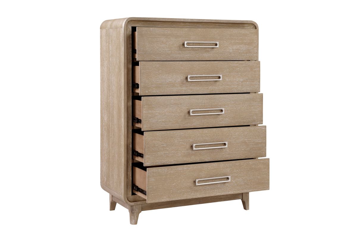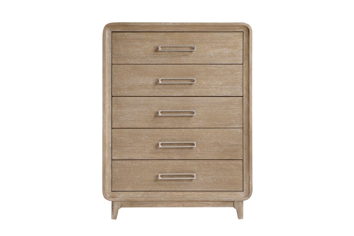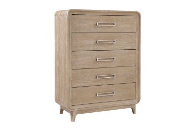 Elevate your bedroom's storage and style with the 5-drawer chest. This beautifully crafted chest, featuring a timeless natural finish on durable oak veneer, wood, and engineered wood, offers ample space to organize your essentials. The five smoothly operating dovetail drawers, equipped with full-extension ball-bearing glides, provide effortless access to your belongings, while the elegant antique nickel-tone bar pulls add a touch of sophisticated charm. Designed for both functionality and enduring aesthetic appeal, this chest is a perfect addition to any transitional or rustic-inspired interior. Assembly required.