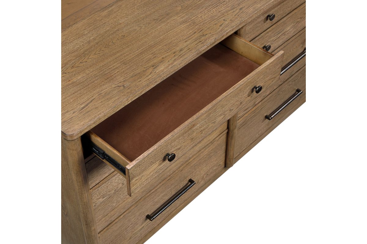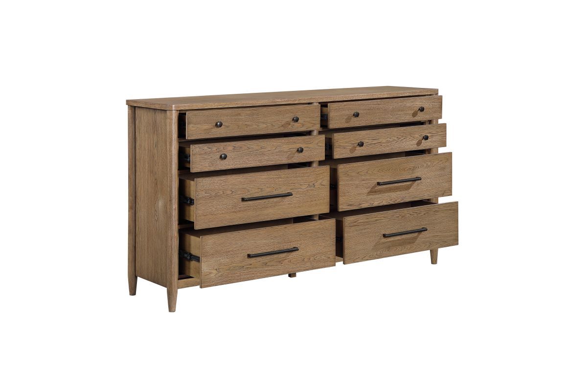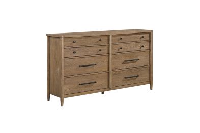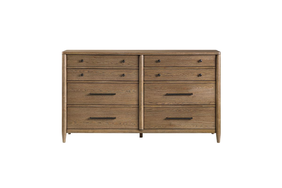 Elevate your bedroom's organization and style with the dresser. Crafted from a blend of durable hickory veneer, wood, and engineered wood, and finished in a rich brown tone, this dresser offers substantial storage with timeless appeal. It features eight smoothly operating dovetail drawers with full-extension ball-bearing glides, providing ample space for all your clothing and accessories. The bottom drawers are lined with cedar veneer, offering natural protection for delicate items. Adorned with sophisticated flat black-tone knobs and antique nickel-tone bar pulls, this dresser arrives fully assembled, ready to seamlessly enhance your bedroom decor.