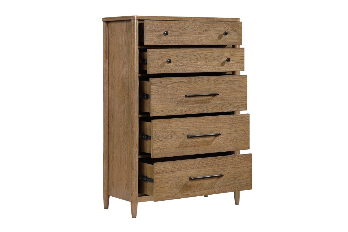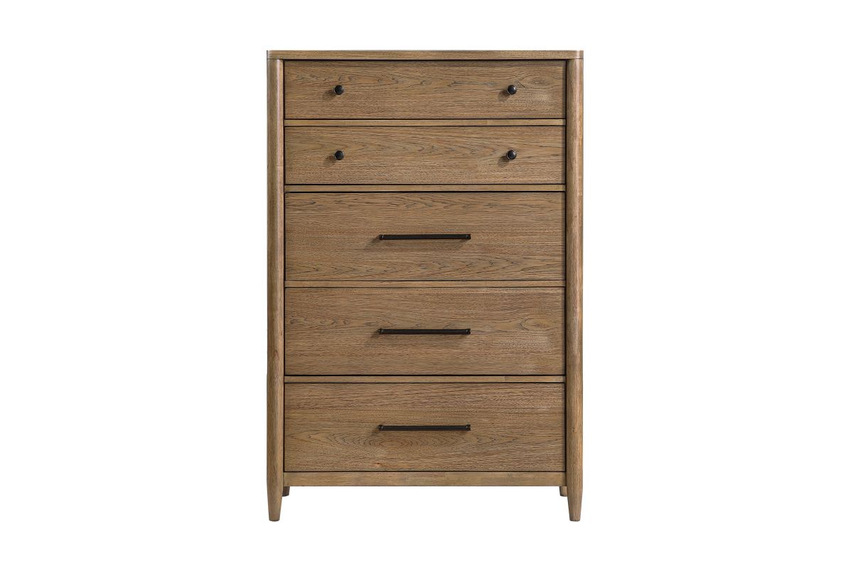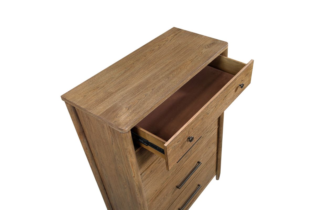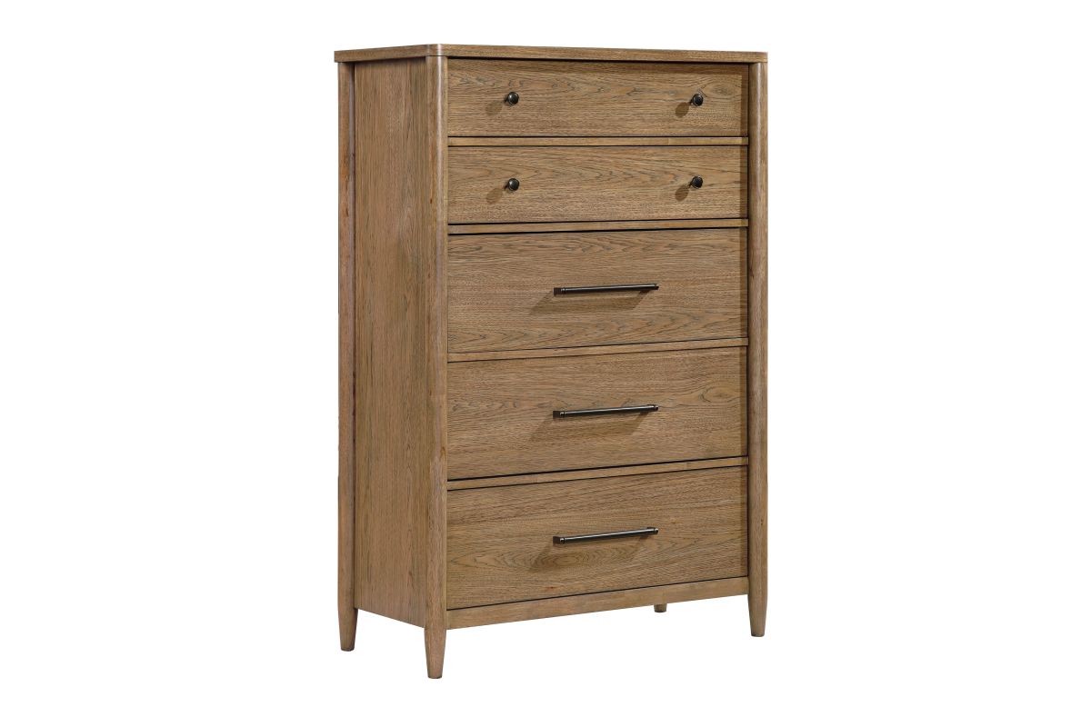 Elevate your bedroom's organization and style with the 5-drawer chest. Expertly crafted from a blend of durable hickory veneer, wood, and engineered wood, and finished in a rich brown tone, this chest offers substantial vertical storage with timeless appeal. It features five smoothly operating dovetail drawers with full-extension ball-bearing glides, providing ample space for all your clothing and accessories. The bottom drawer is lined with cedar veneer, offering natural protection for delicate items. Adorned with sophisticated flat black-tone knobs and antique nickel-tone bar pulls, this chest arrives fully assembled, ready to seamlessly enhance your bedroom decor.