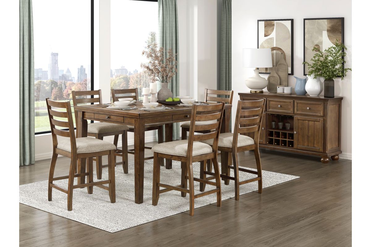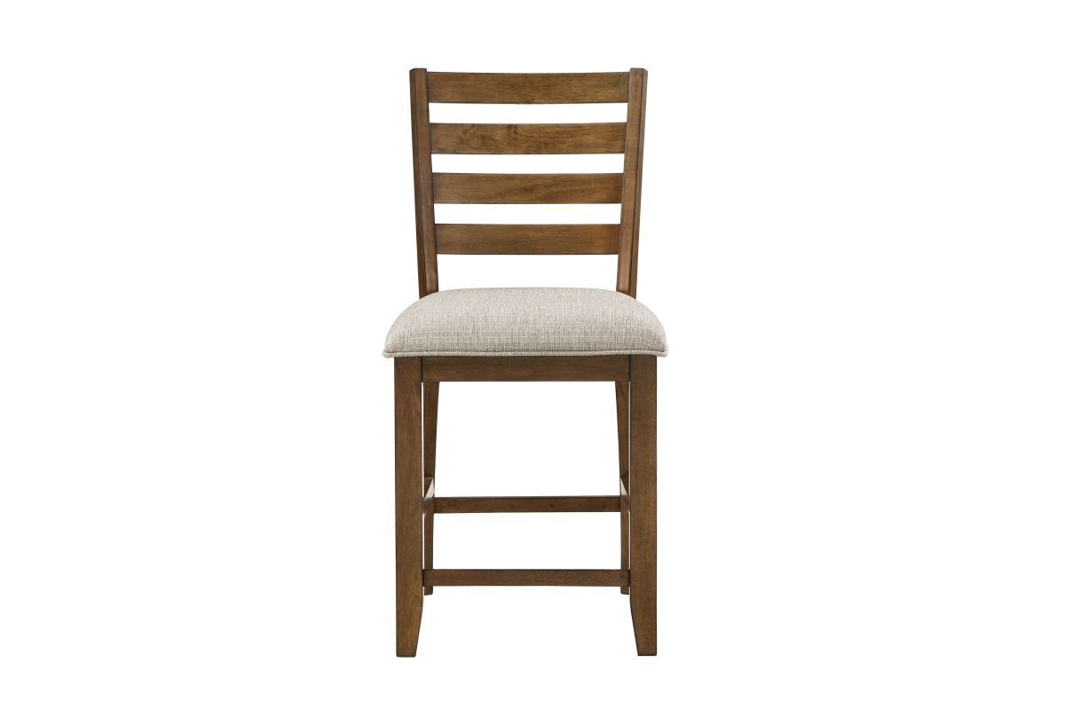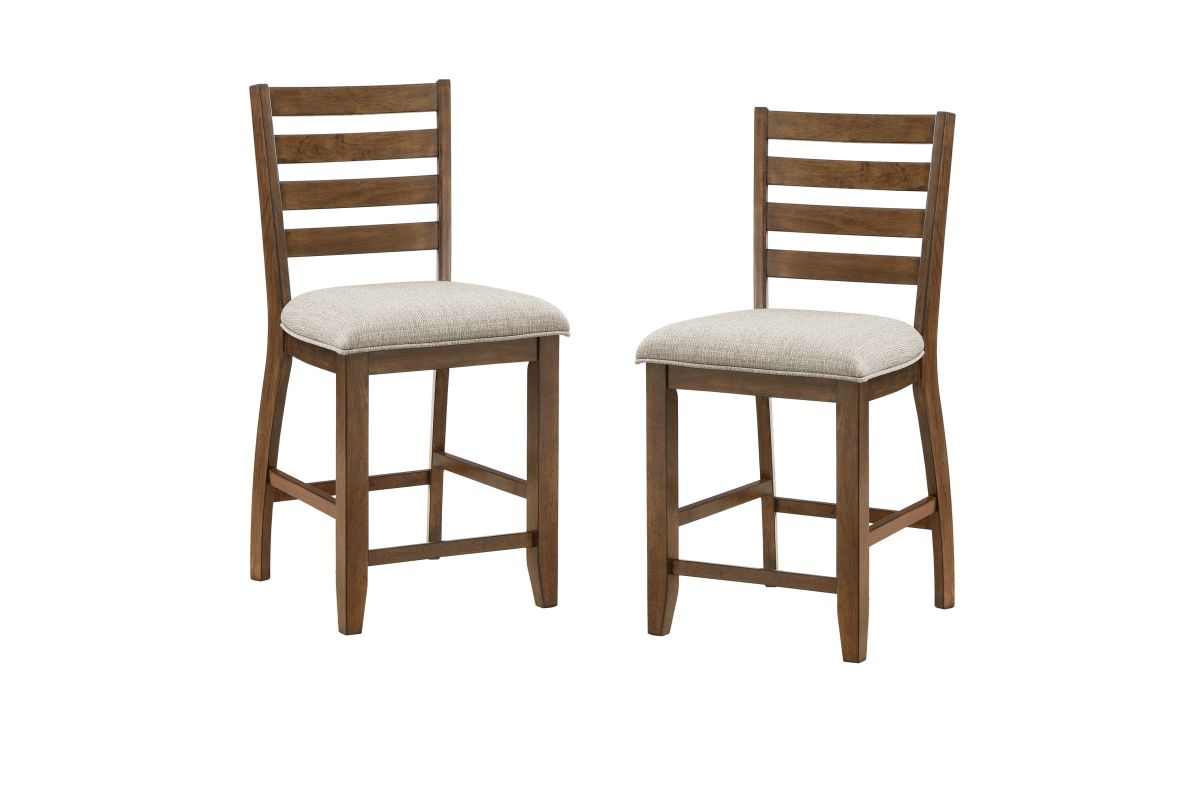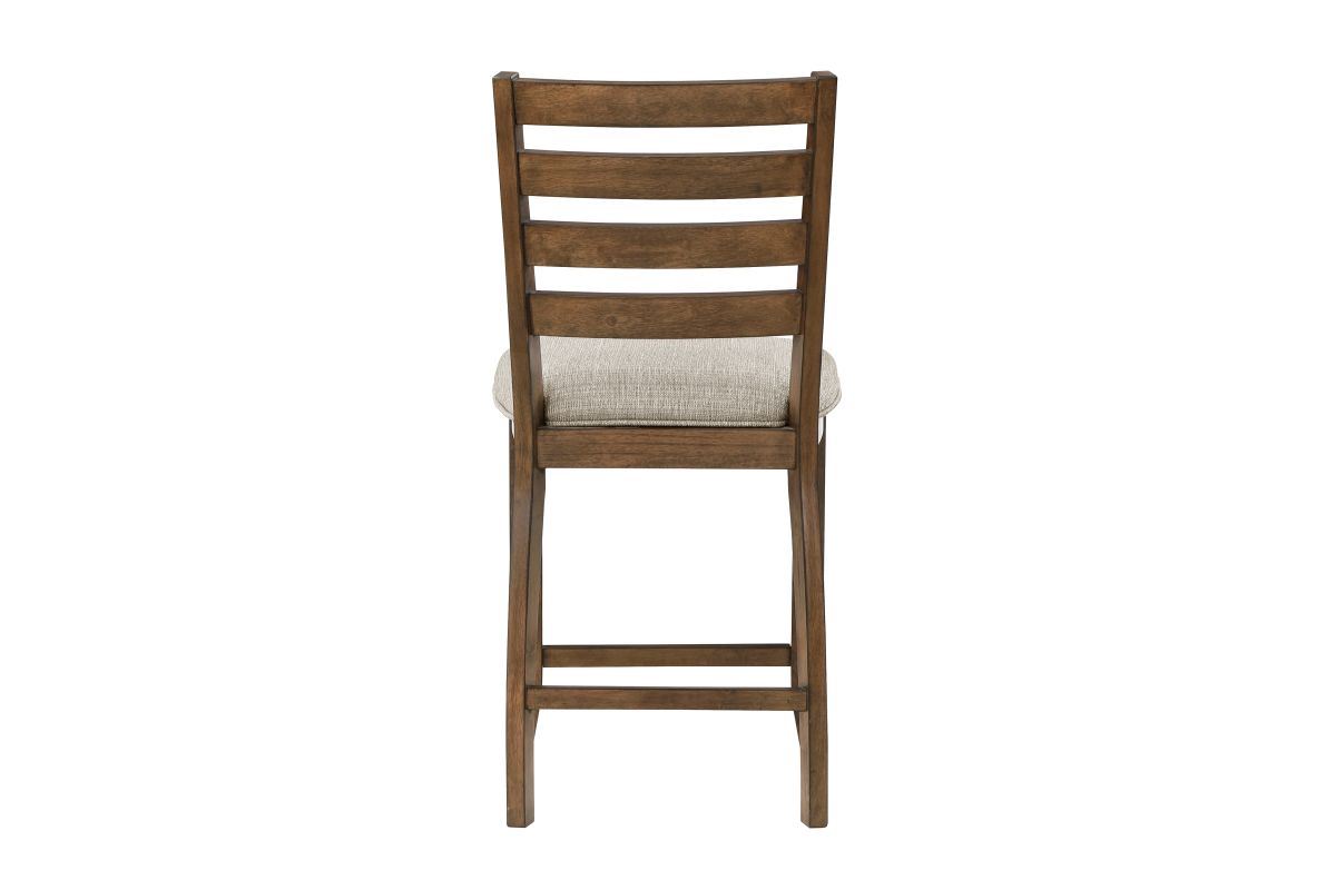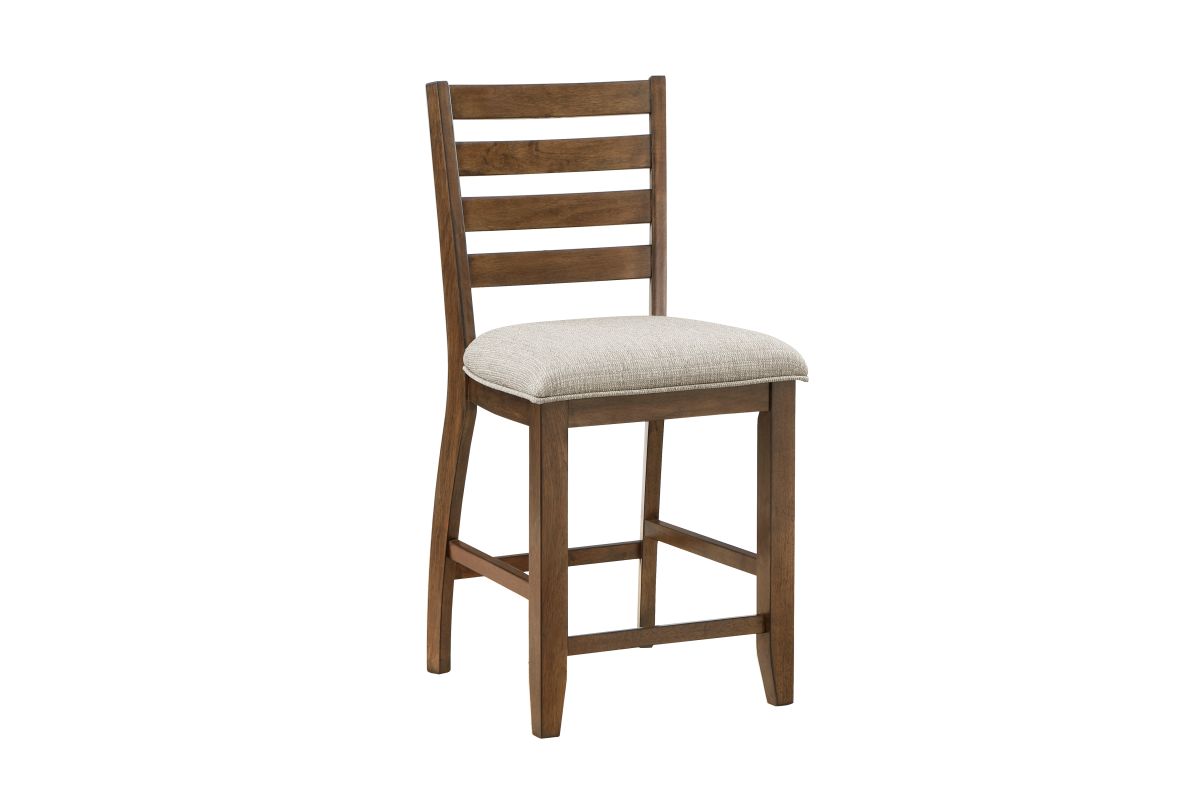 The traditional styling of the Tigard Collection lends timeless appeal to the look of your casual dining space. With subtle hints nodding to the Arts and Crafts design movement, the ladder-back counter height chair features classic lines that solidify the versatile aesthetic of the collection. Covering the padded seats of the chair is a neutral tone fabric upholstery, complementing the traditional cherry finish of the chair’s wood veneer. Assembly required.