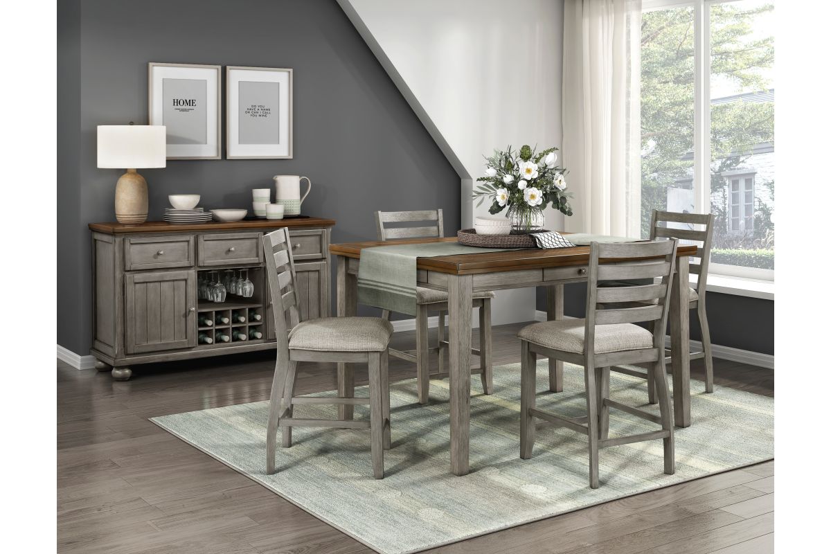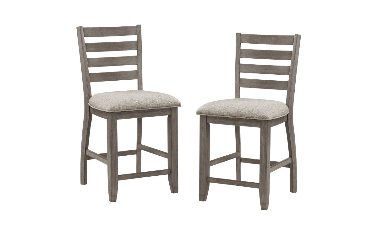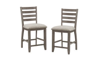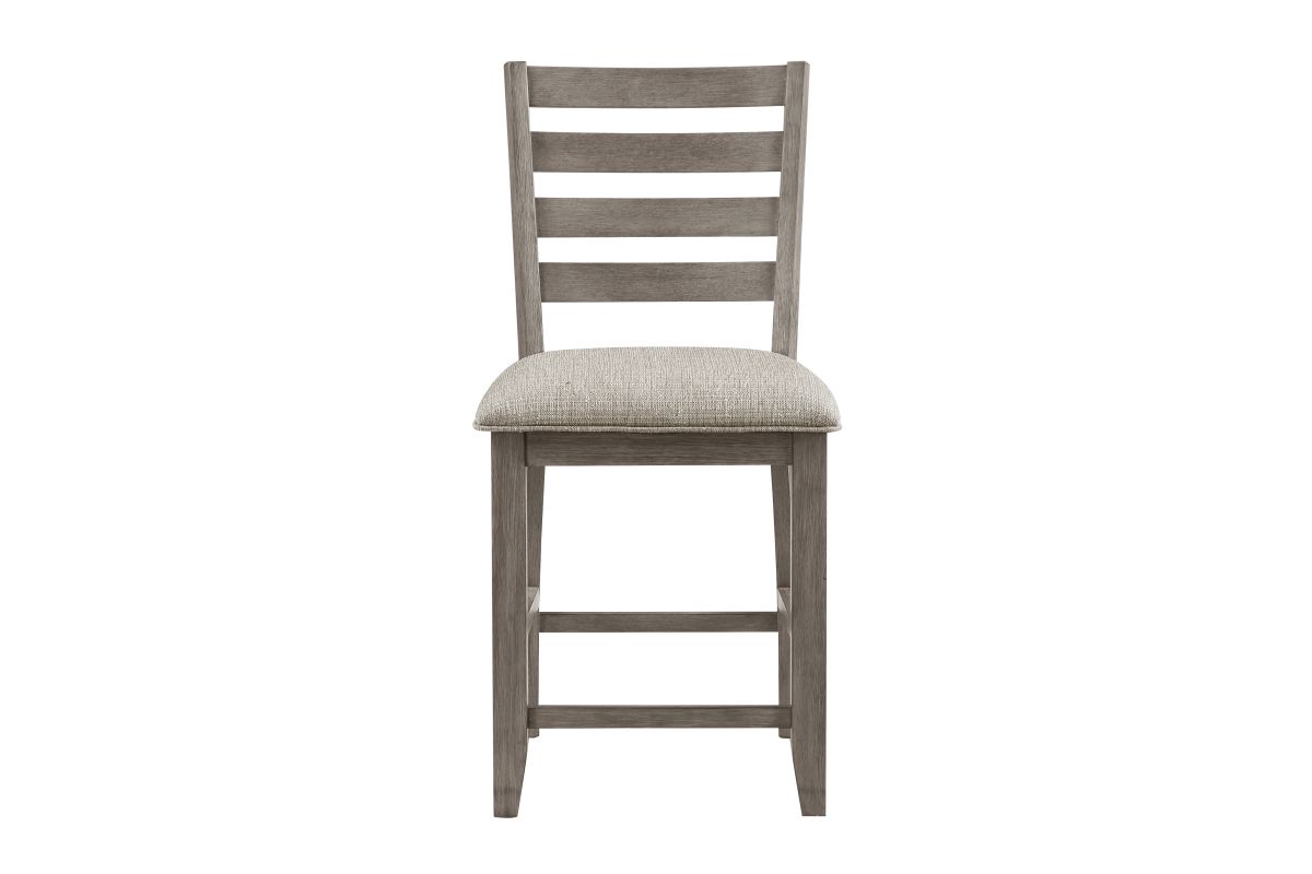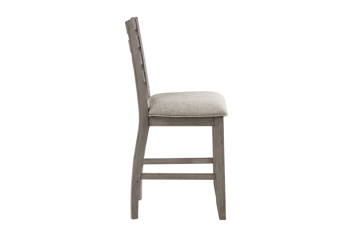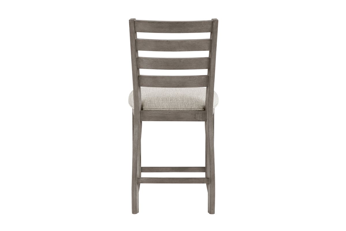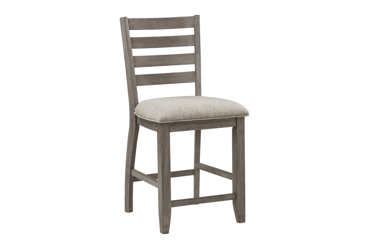 The traditional styling of the Tigard Collection lends timeless appeal to the look of your casual dining space. With subtle hints nodding to the Arts and Crafts design movement, the ladder-back counter height chair features classic lines that solidify the versatile aesthetic of the collection. Covering the padded seats of the chair is a neutral tone fabric upholstery, complementing the traditional gray finish of the chair’s wood veneer. Assembly required.