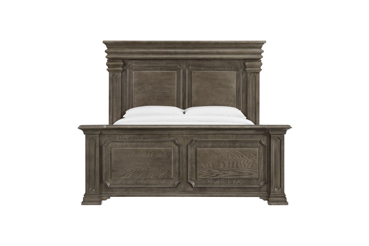 The Radcliff King Pabel Bed has high-minded style and a homey touch. Its dual panel headboard and footboard feature an inlay design and warm touch lighting. The subtle gray finish,