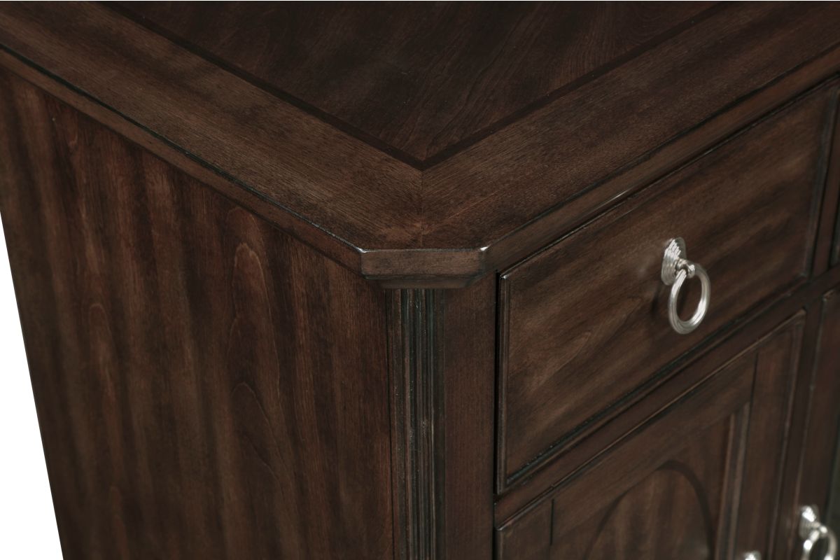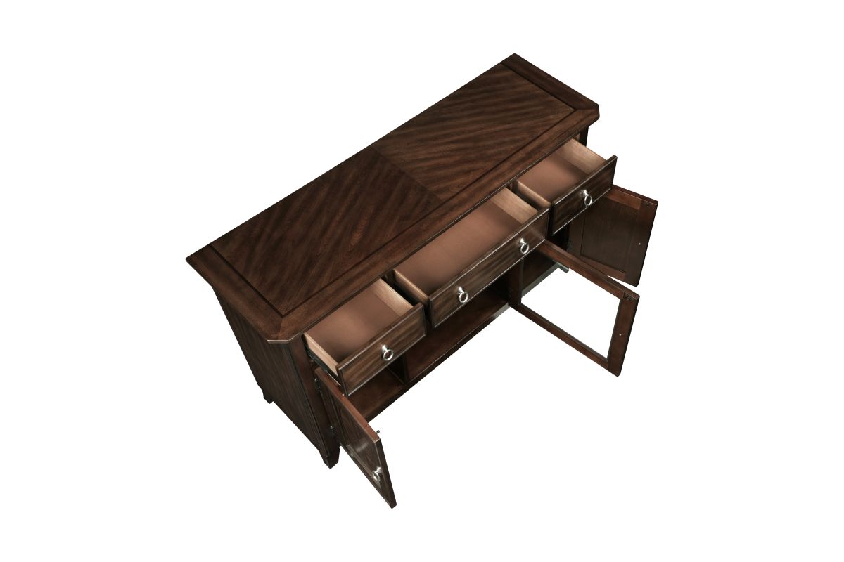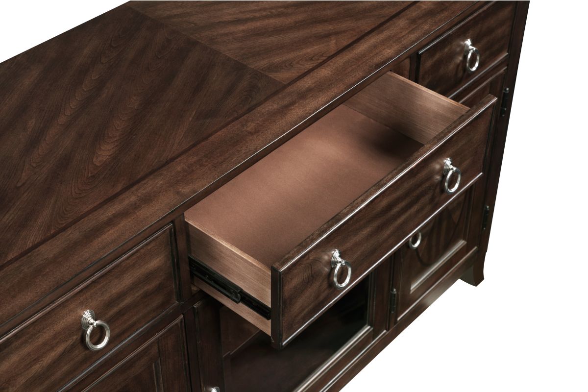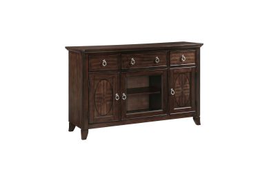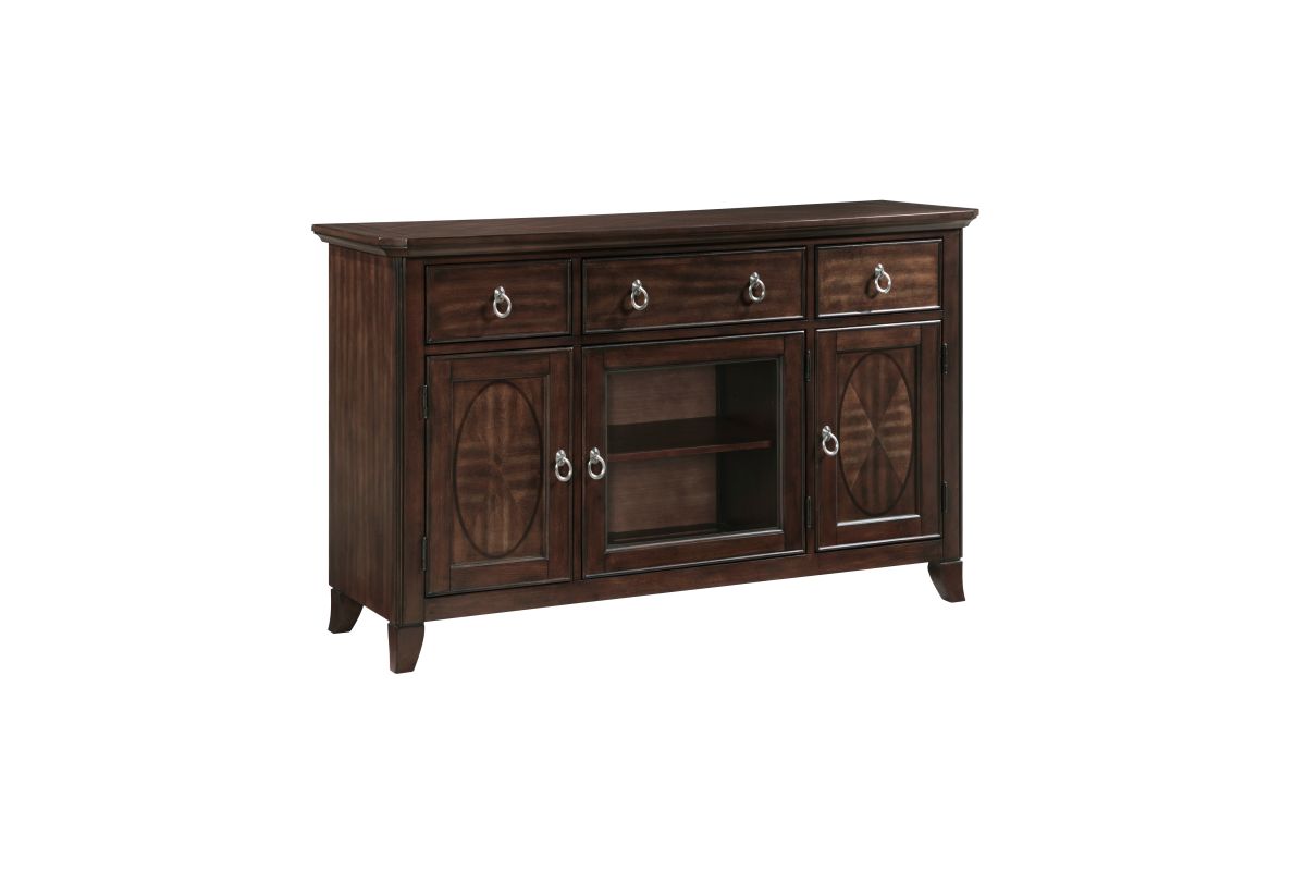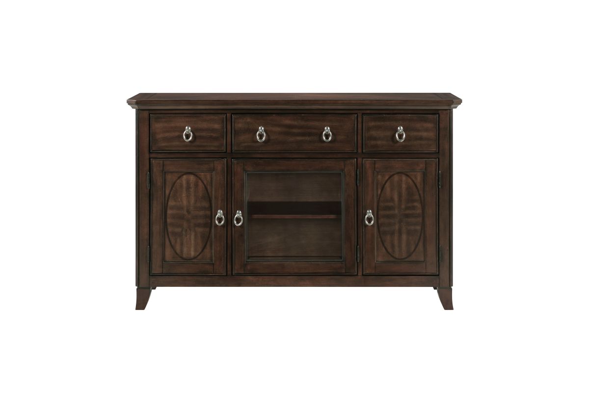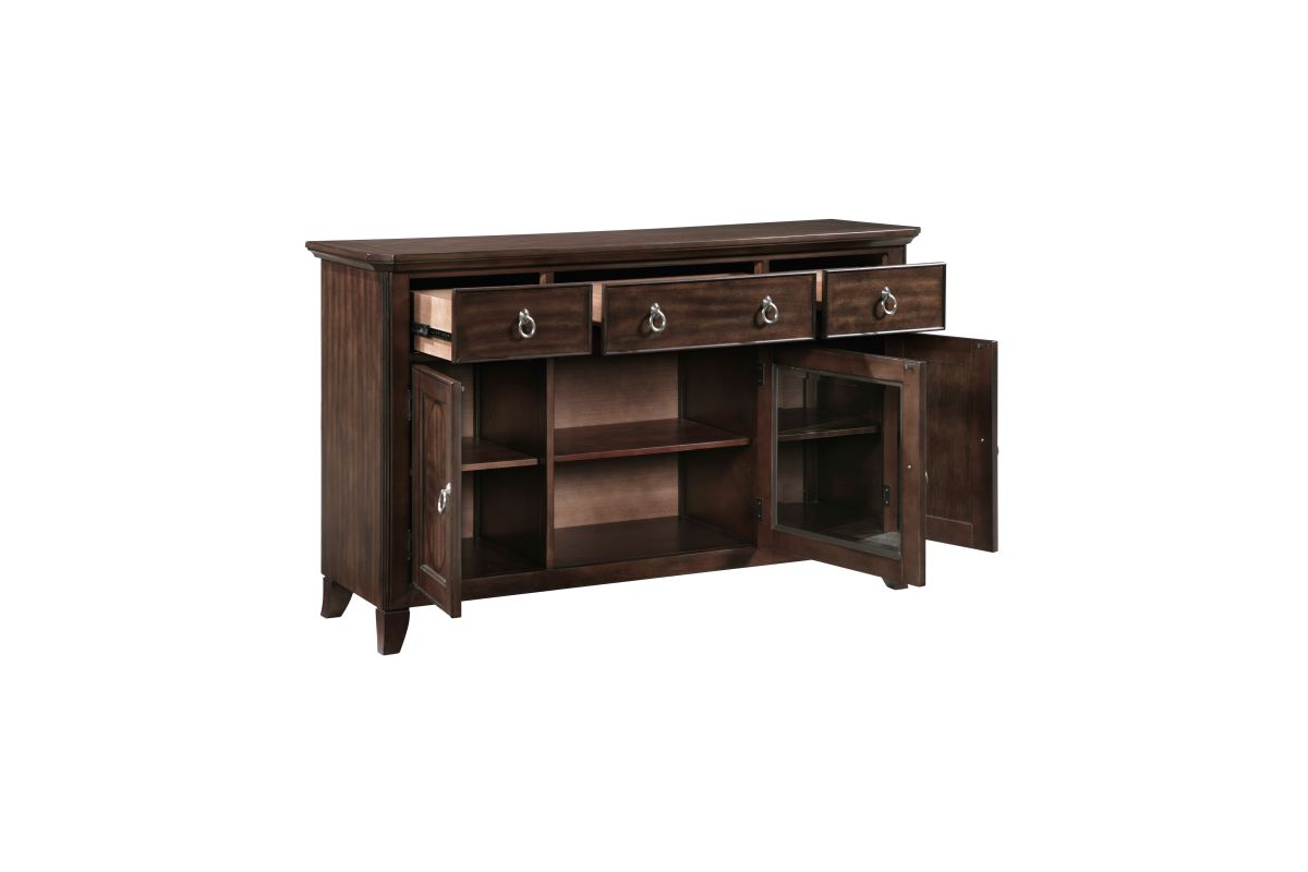 Add both elegance and functionality to your dining or living space with this server. Crafted from high-quality birch veneer, wood, and engineered wood, this server features a rich cherry finish complemented by a sophisticated dark walnut inlay, creating a timeless appeal. It offers ample storage with three smooth-gliding dovetail drawers, two side cabinets each with an adjustable shelf, and a center cabinet with an adjustable shelf and a stylish glass door. The polished chrome tone ring pulls add a touch of modern sophistication. While assembly is required, the result is a beautifully designed and highly functional server that enhances any room with its classic charm and practical storage solutions.