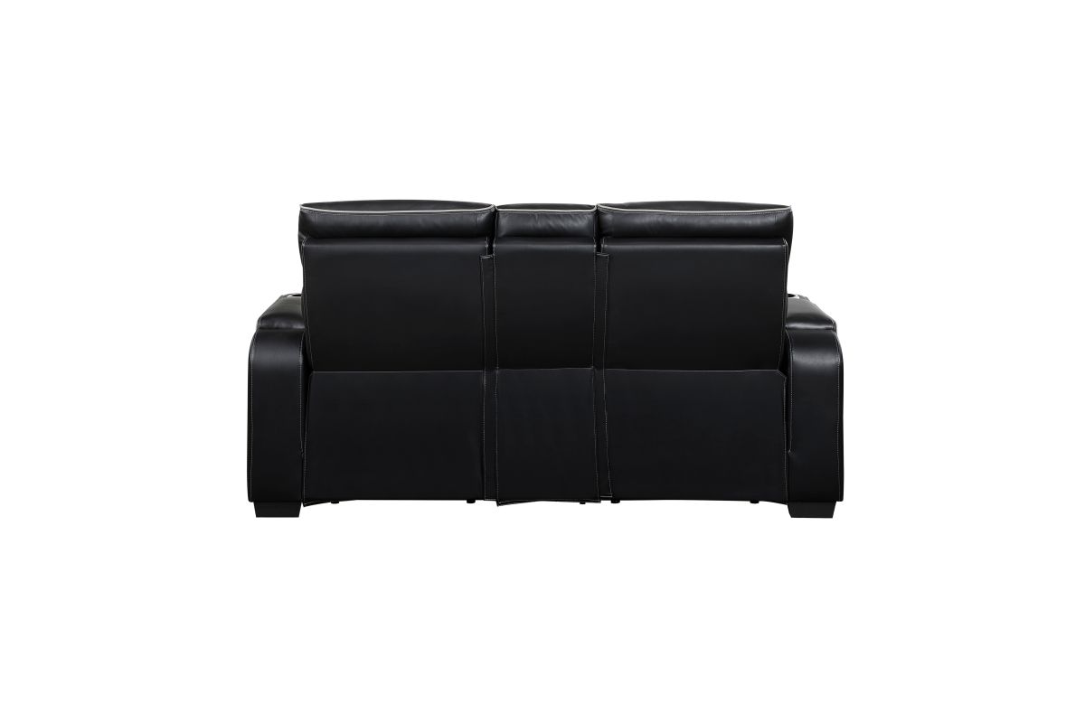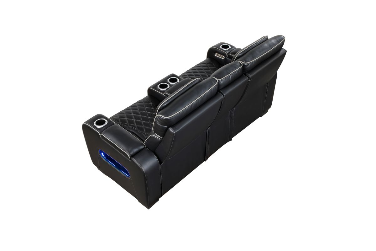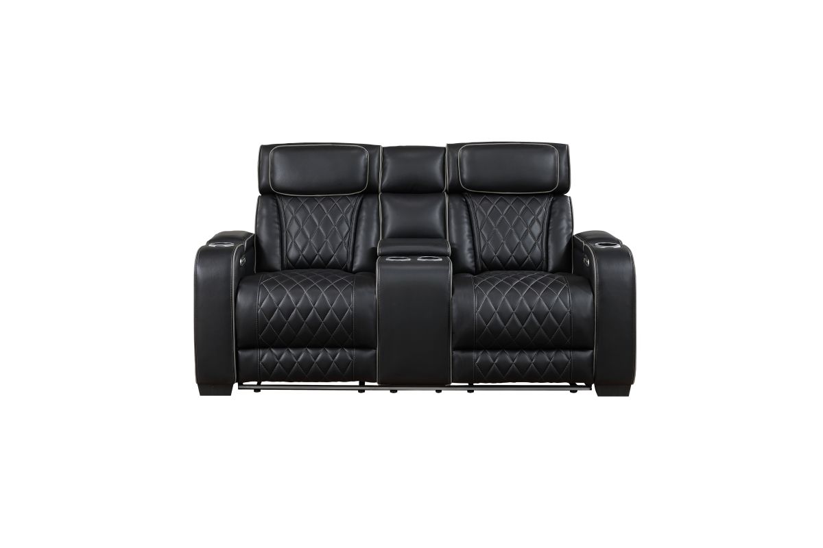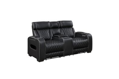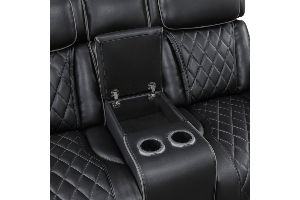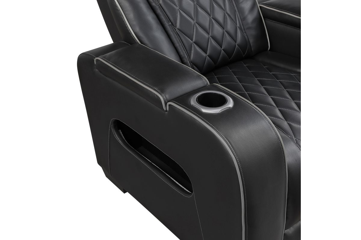 Experience unparalleled comfort and convenience with this black faux leather power double reclining loveseat. This luxurious loveseat is designed for ultimate relaxation with features like independent power reclining, adjustable power headrests, and ambient LED lighting. The center console provides storage and cup holders for added convenience, while built-in USB ports keep your devices charged. Top and side storage arms offer additional storage space for remotes or other essentials. The sleek black faux leather upholstery with diamond-stitched detailing adds a touch of modern sophistication, making this loveseat a perfect centerpiece for your home theater or living room. assembly required.