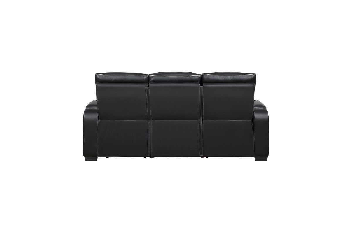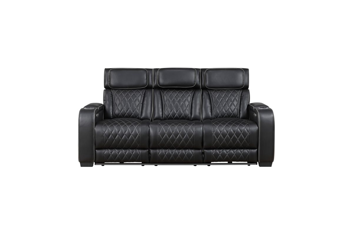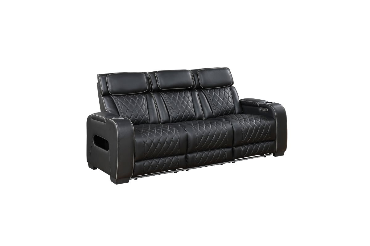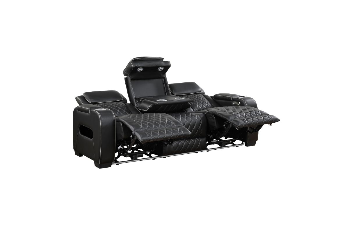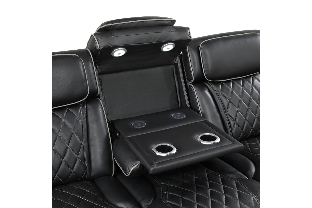 Experience the pinnacle of home theater luxury with this black faux leather power double reclining sofa. Designed for ultimate comfort and convenience, this sofa features independent power reclining and adjustable power headrests, allowing each person to find their perfect position. The center drop-down console reveals cup holders and reading lights, while two wireless charging pads and USB ports keep your devices powered. Top and side storage arms provide ample space for remotes and other essentials. Ambient LED lighting adds a touch of modern sophistication. The sleek black faux leather upholstery with diamond-stitched detailing ensures both durability and style, making this sofa the perfect centerpiece for your entertainment space.