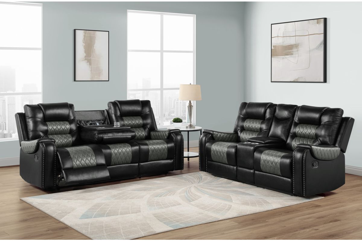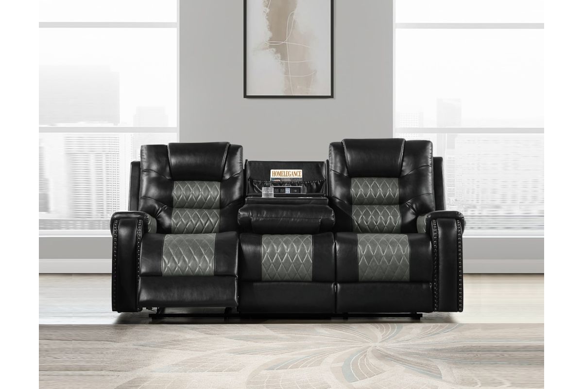 Experience ultimate comfort and convenience with the Hart Reclining Sofa (Model SH8890BLK-3). Featuring power reclining seats, a central drop-down table with integrated charging station, and built-in cup holders, this sofa is designed to enhance your living room with style and functionality. Upholstered in sleek black fabric, it offers both durability and modern appeal.