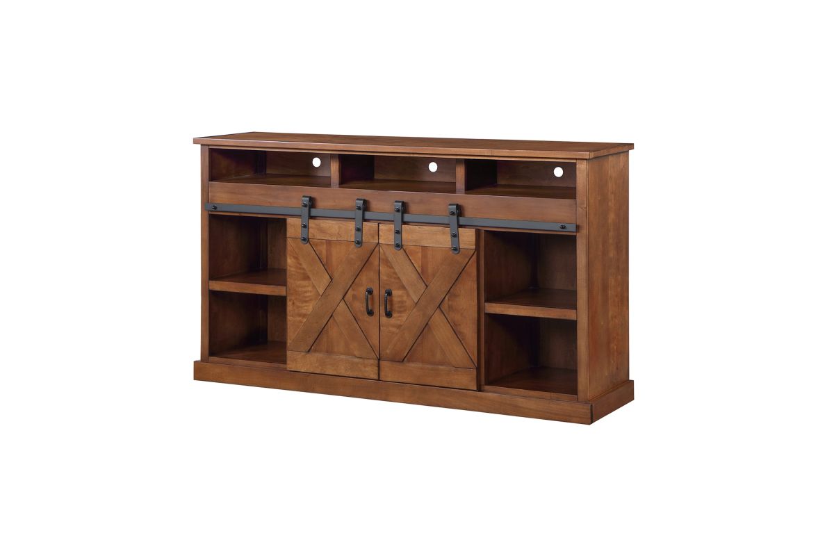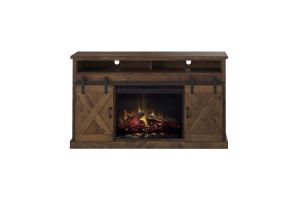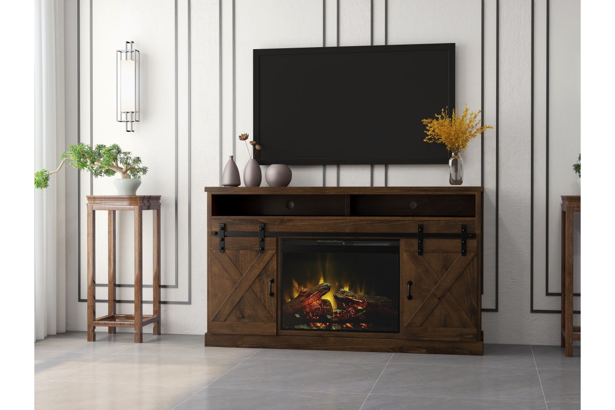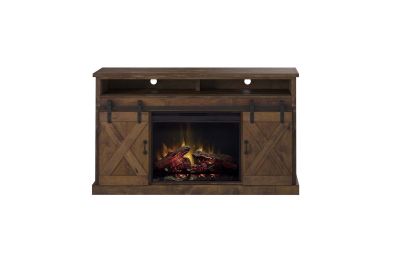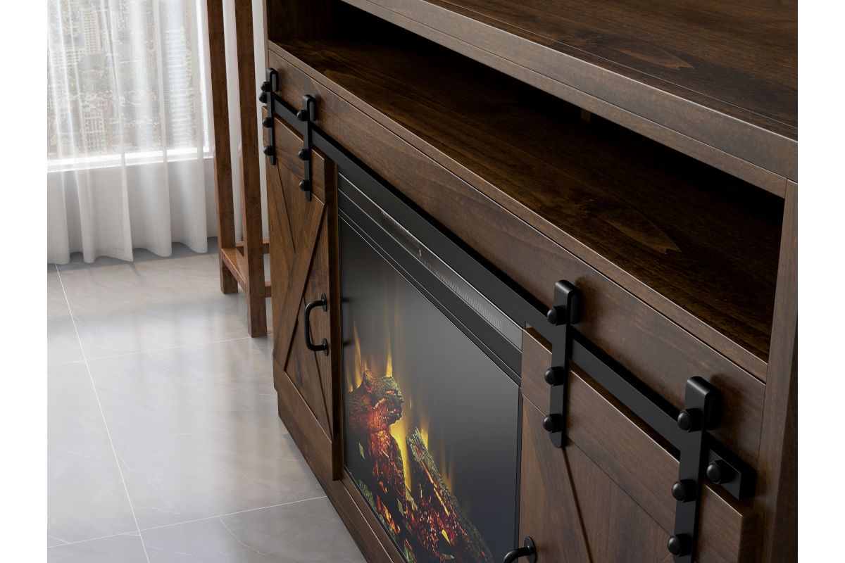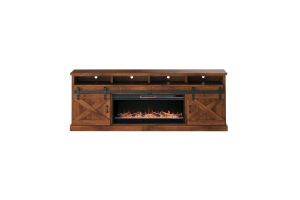 The Bridgevine Home Rustic Farmhouse 66" Electric Fireplace TV Stand Console is steeped in age-old tradition and style. Expertly crafted from the finest sustainable Knotty Alder Solids and Veneers, this Fireplace TV Stand is finished in a rich Aged Whiskey and accented with matte black, forged iron hardware. Featuring rustic, X-style farmhouse sliding barn doors and 5 shelves, this TV Stand with Fireplace will accommodate TVs up to 75 inches and provide ample storage for media and gaming consoles and home décor favorites. Cable management openings on the back panel will keep your cords and wires concealed. The 28" electric fireplace insert includes a remote control and multiple settings allow for heat up to 400 square feet. Four (included) screws make securing the fireplace insert to the console quick and simple. Minimal assembly required.