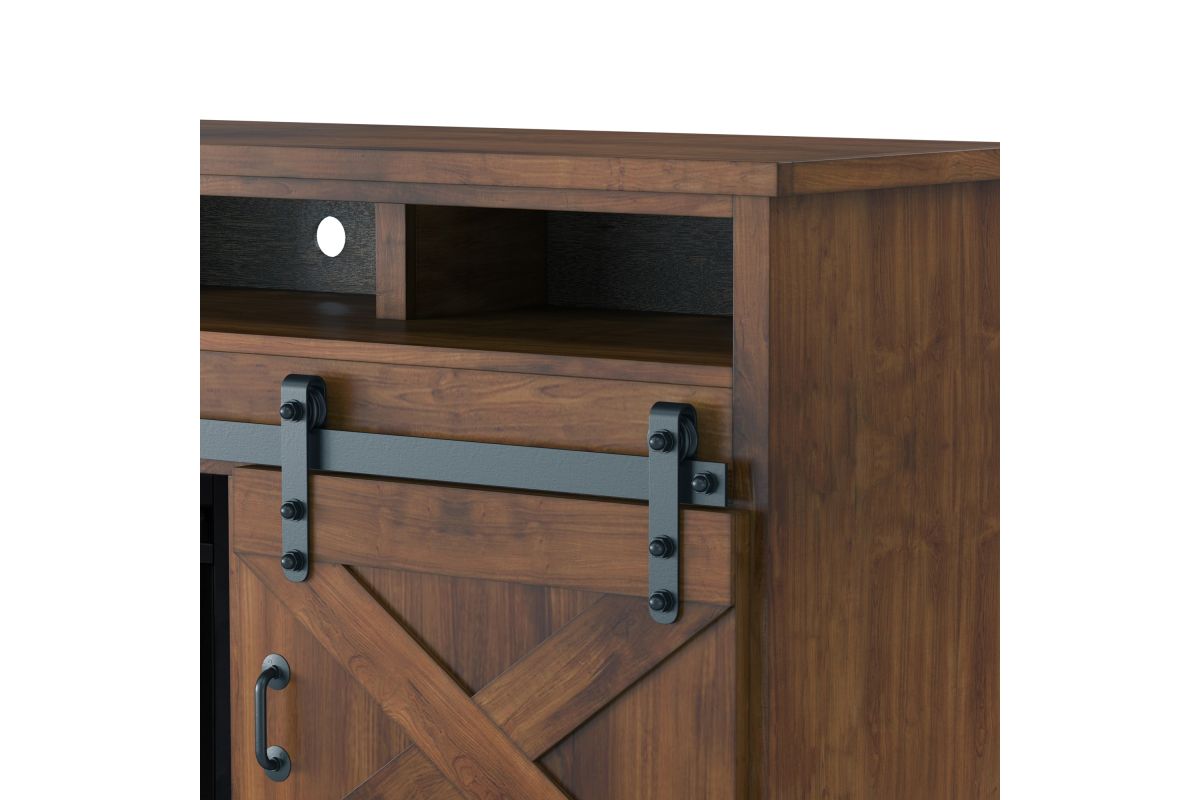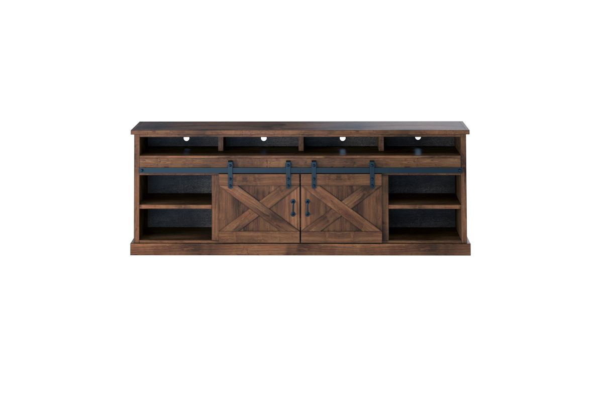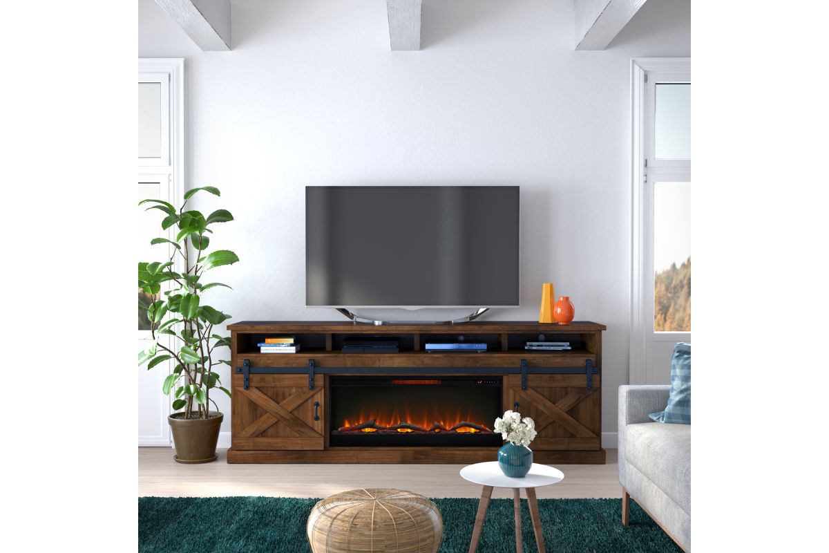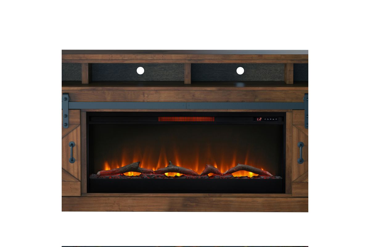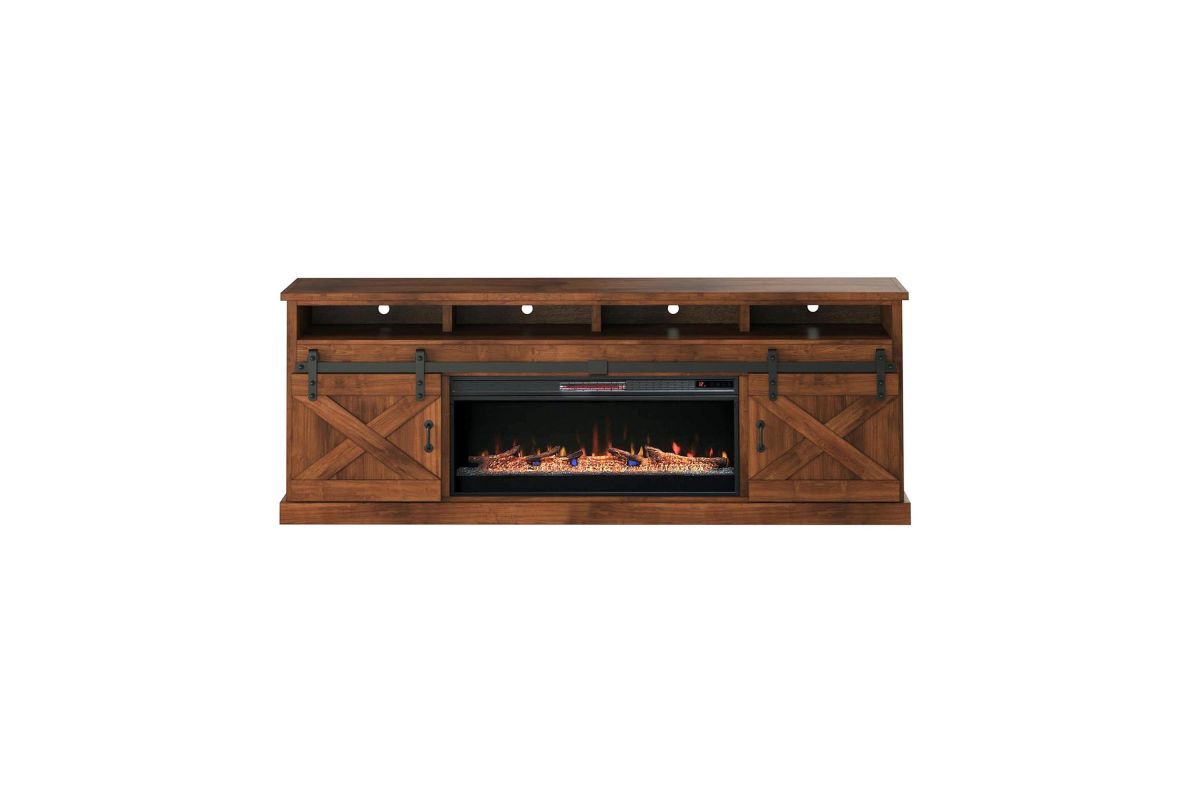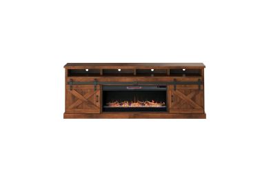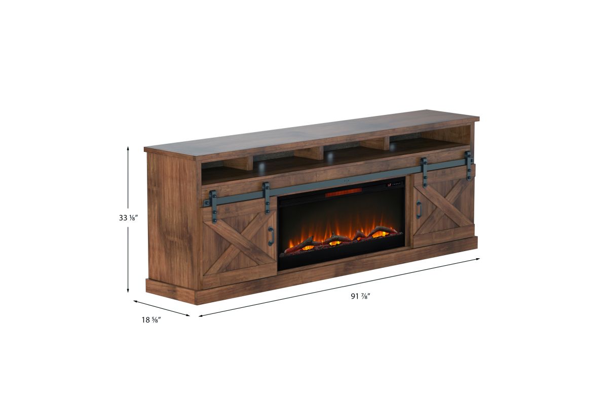 The Bridgevine Home Rustic Farmhouse 93" Electric Fireplace TV Stand Console is steeped in age-old tradition and style. Expertly crafted from the finest sustainable Knotty Alder Solids and Veneers, this Fireplace TV Stand is finished in Aged Whiskey and accented with matte black, forged iron hardware. Featuring rustic, X-style farmhouse sliding barn doors and 6 shelves, this Fireplace TV Console will accommodate TVs up to 100 inches and provide ample storage for media and gaming consoles and home décor favorites. Cable management openings on the back panel will keep your cords and wires concealed. The 42" electric fireplace insert includes a remote control and multiple settings allow for heat up to 400 square feet. Four (included) screws make securing the fireplace insert to the console quick and simple. Minimal assembly required.
