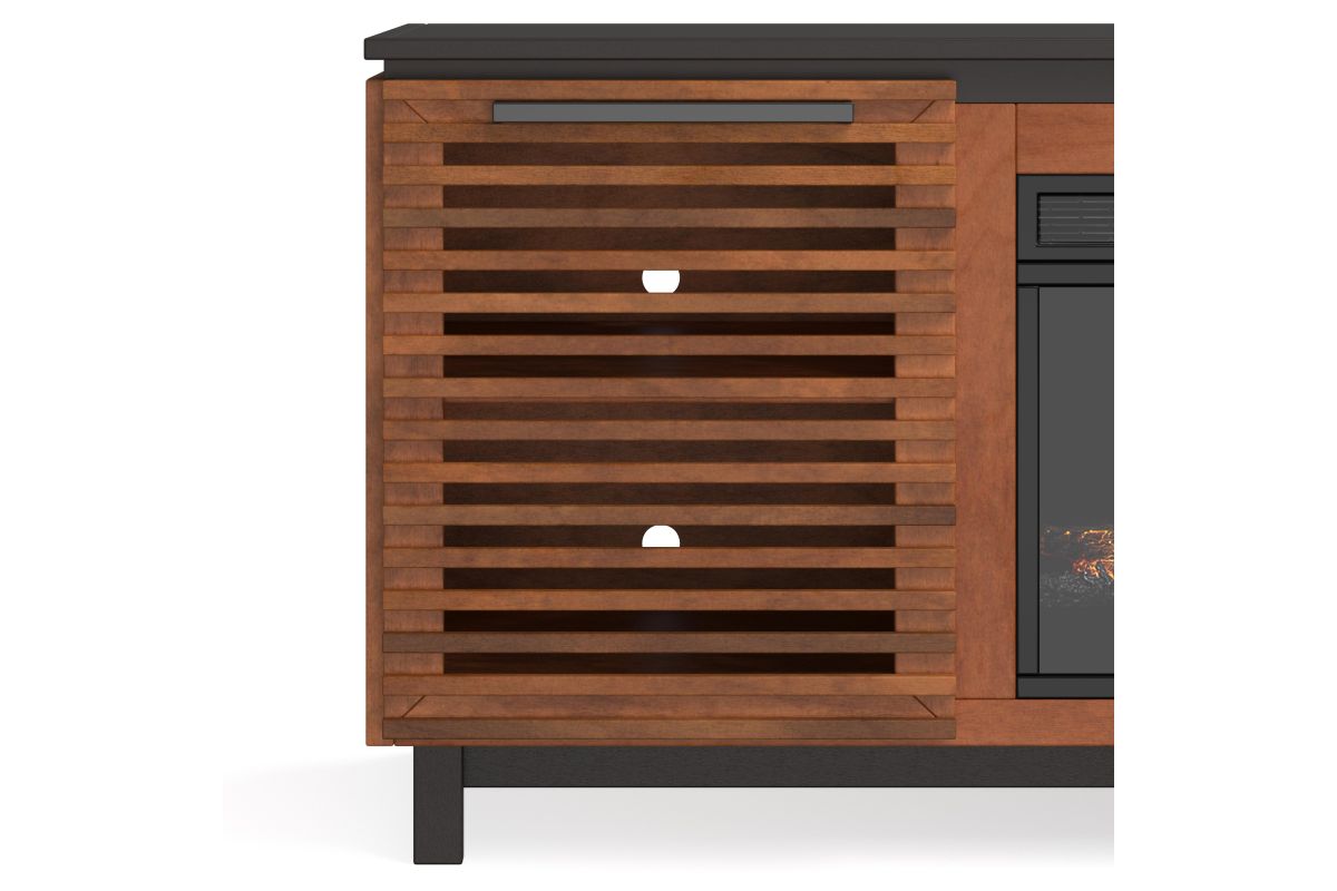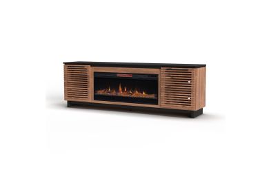 Bring home the Graceland 86" Electric Fireplace TV Stand from Bridgevine Home for a sophisticated and upscale addition to your living room or great room. This fireplace entertainment center is Scandinavian-inspired and artfully crafted from Poplar solids and Okume veneers with a two-tone Black and Bourbon finish. Featuring two doors, this TV stand will accommodate TVs up to 95 inches and provide ample storage for media and gaming consoles and home décor favorites. Cable management openings on the back panel will keep every cord and wire concealed. The 42" electric fireplace insert includes a remote control and multiple settings allow for heat up to 400 square feet. Four (included) screws make securing the fireplace insert to the console quick and simple. This showstopping fireplace TV Console will make a glamorous statement in your modern home. Minimal assembly required.