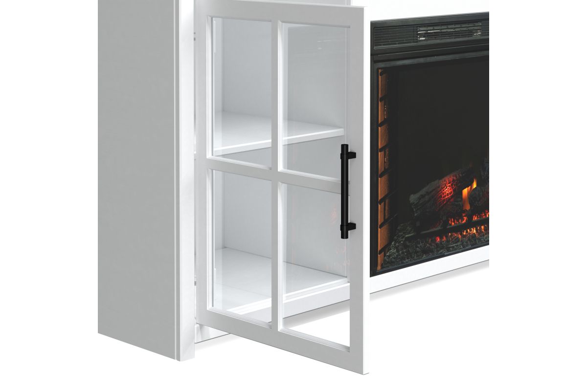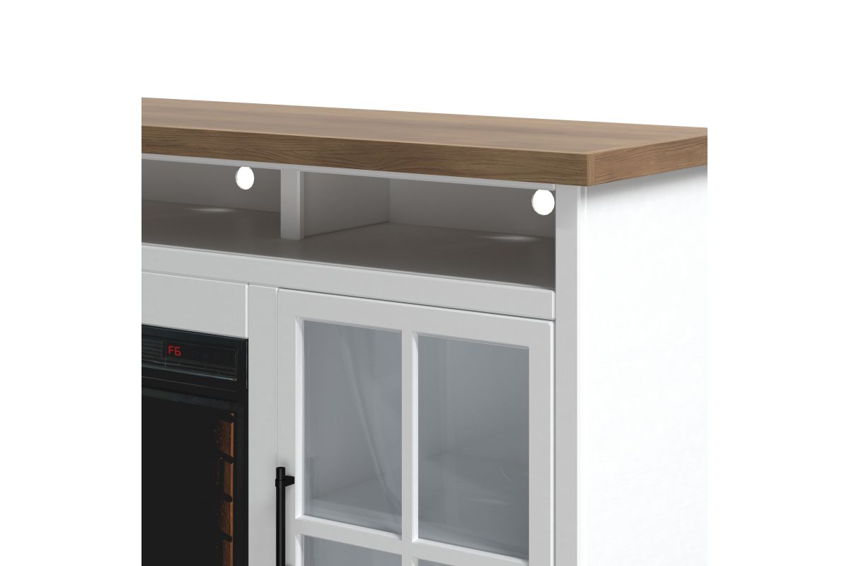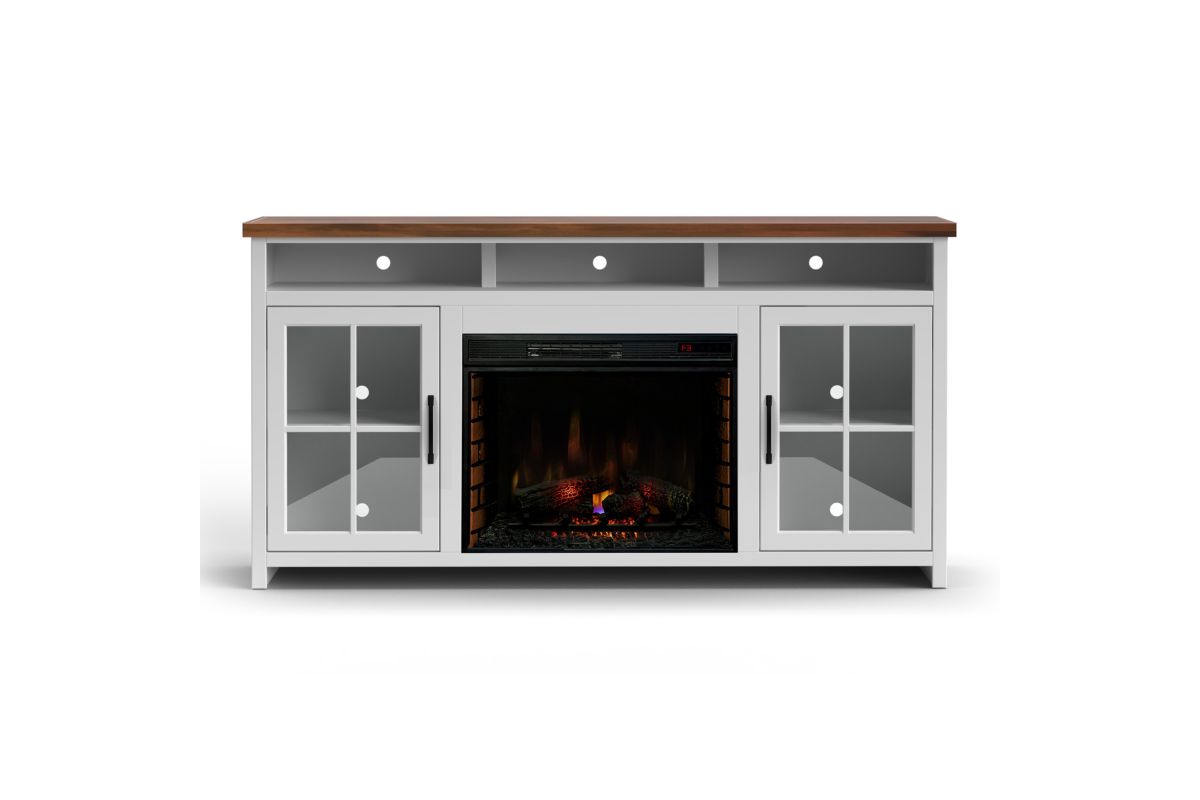 The Hampton 74" Fireplace TV Stand Console from Bridgevine Home delivers a flawless combination of modern farmhouse style and country simplicity. Beautifully crafted from Poplar Solids, Okoume Veneers and Knotty Alder, this Fireplace Entertainment Center features a two-tone Jasmine Whitewash and Barnwood finish and oil-rubbed Bronze hardware. Ideal for TVs up to 85 inches, this Fireplace TV Stand includes two glass windowpane doors, three shelves and cable management on the back panel for media and gaming console storage. The 28" electric fireplace insert includes a remote control and multiple settings allow for heat up to 400 square feet. Four (included) screws make securing the fireplace insert to the console quick and simple.