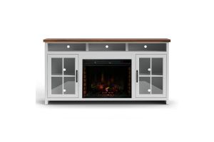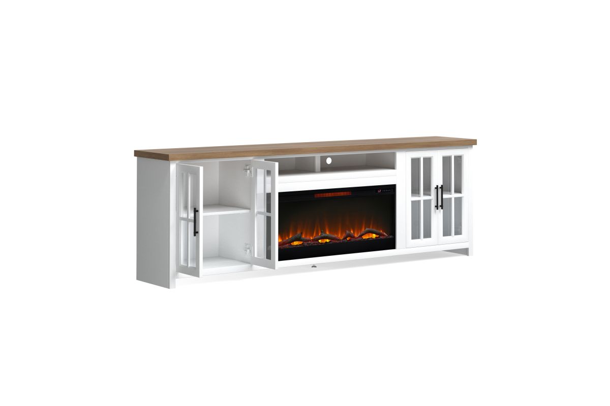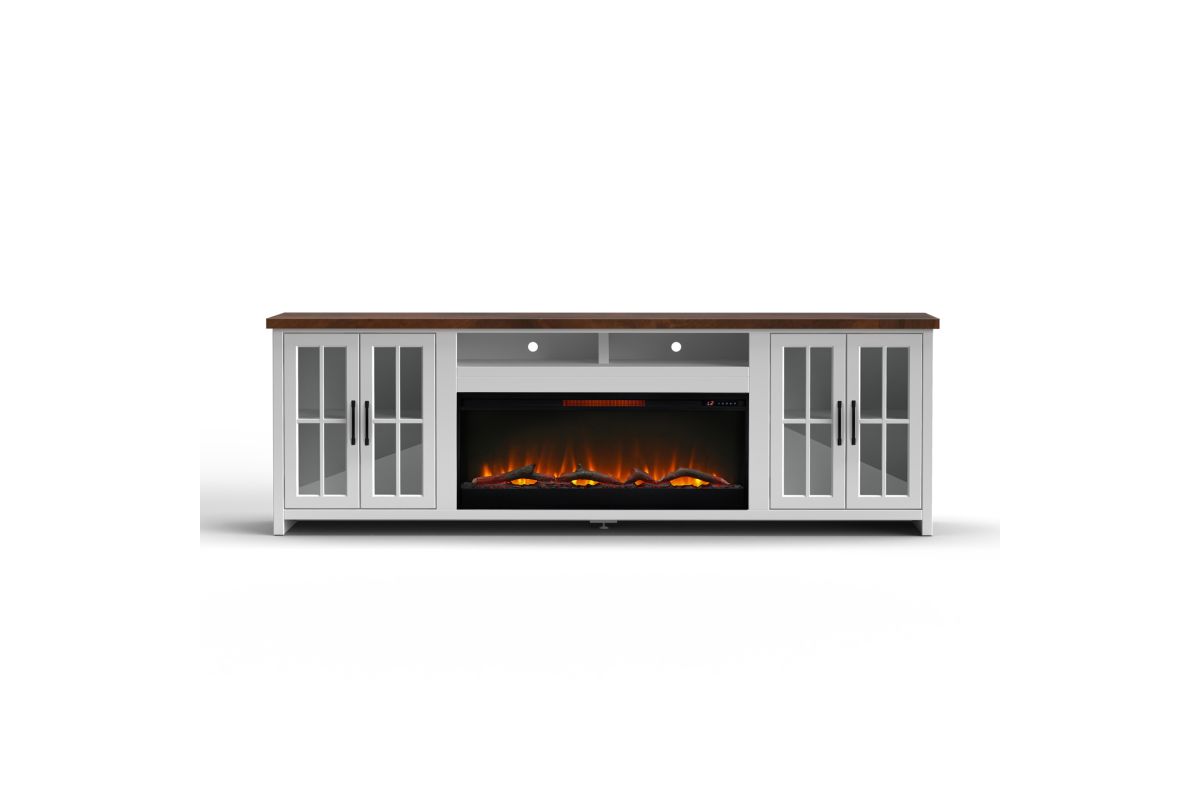 The Hampton 97" Fireplace TV Stand Console from Bridgevine Home delivers a flawless combination of modern farmhouse style and country simplicity. Beautifully crafted from Poplar Solids, Okoume Veneers and Knotty Alder, this Fireplace Entertainment Center features a two-tone Jasmine Whitewash and Barnwood finish and oil-rubbed Bronze hardware. Ideal for TVs up to 100 inches, this Fireplace TV Stand includes four glass windowpane doors, three shelves and cable management on the back panel for media and gaming console storage. The 42" electric fireplace insert includes a remote control and multiple settings allow for heat up to 400 square feet. Four (included) screws make securing the fireplace insert to the console quick and simple. Minimal assembly required.
