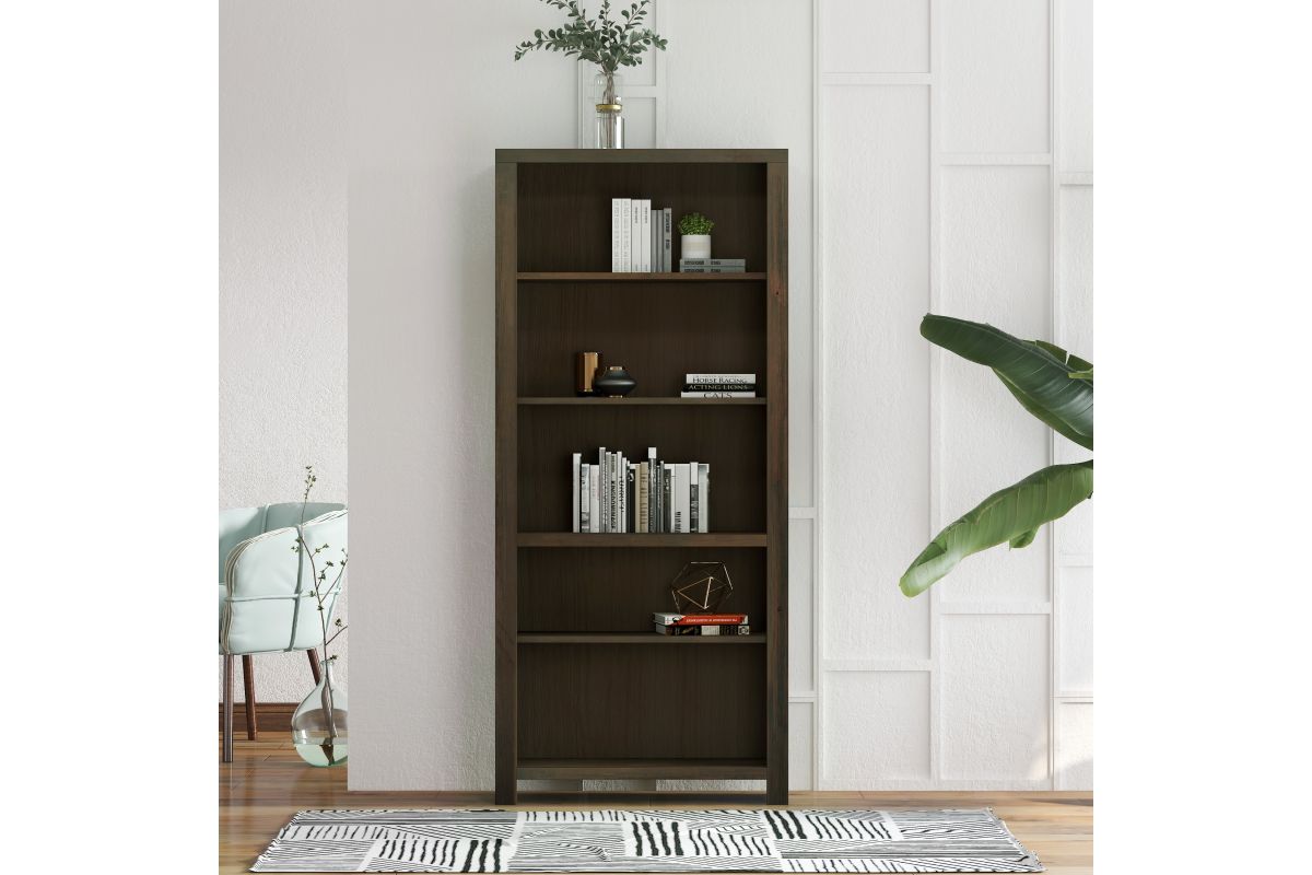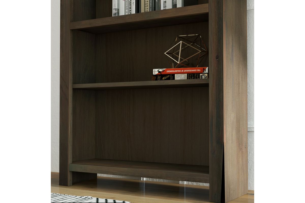 The Joshua Creek 72" high bookcase boasts a striking and modern take on rustic charm. Skillfully crafted from Knotty Alder solids and veneers, this bookshelf features a rich Barnwood finish and four adjustable shelves. Whether placed in your home office to store essentials or in your living room to showcase home décor and your book collection, this bookshelf will be a high-quality, picturesque addition to your home. Fully assembled upon arrival, all furniture from Bridgevine Home is ready to unbox and enjoy