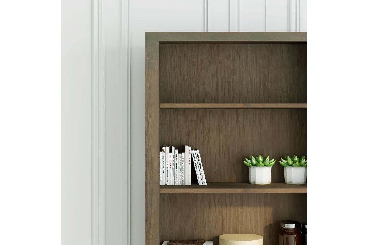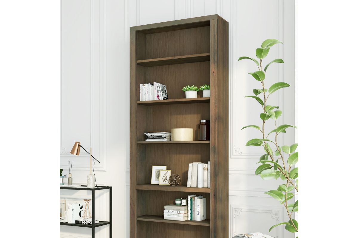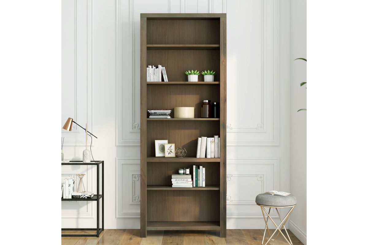 The Joshua Creek 84" high bookcase boasts a striking and modern take on rustic charm. Skillfully crafted from Knotty Alder solids and veneers, this bookshelf features a rich Barnwood finish and five adjustable shelves. Whether placed in your home office to store essentials or in your living room to showcase home décor and your book collection, this bookshelf will be a high-quality, picturesque addition to your home. Fully assembled upon arrival, all furniture from Bridgevine Home is ready to unbox and enjoy.