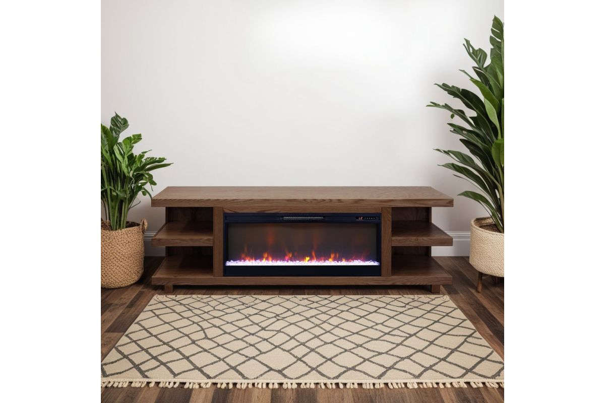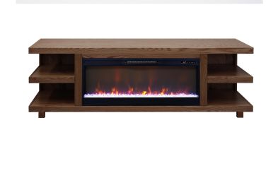 The Laurel Canyon 82 inch Fireplace TV Stand Console delivers the perfect blend of modern, urban style with rustic tranquility. Skillfully crafted from Oak Solids and Veneers, this robust Entertainment Center with Fireplace is available in your choice of three finish and features unique, open-ended shelving. This Fireplace TV Console is ideal for TVs up to 90 inches and will provide ample space to showcase home décor and house media and gaming consoles. Cable management openings on the back panel will keep all cords and wires concealed. The 42" Electric Fireplace Insert with crystals and faux wood burning logs includes multiple settings that will heat up to 400 square feet and a remote control. Four (included) screws make securing the fireplace insert to the console quick and simple. From mountain lodge to urban loft, the clean lines of Laurel Canyon will be a stunning and welcome addition to any home. Minimal Assembly required.