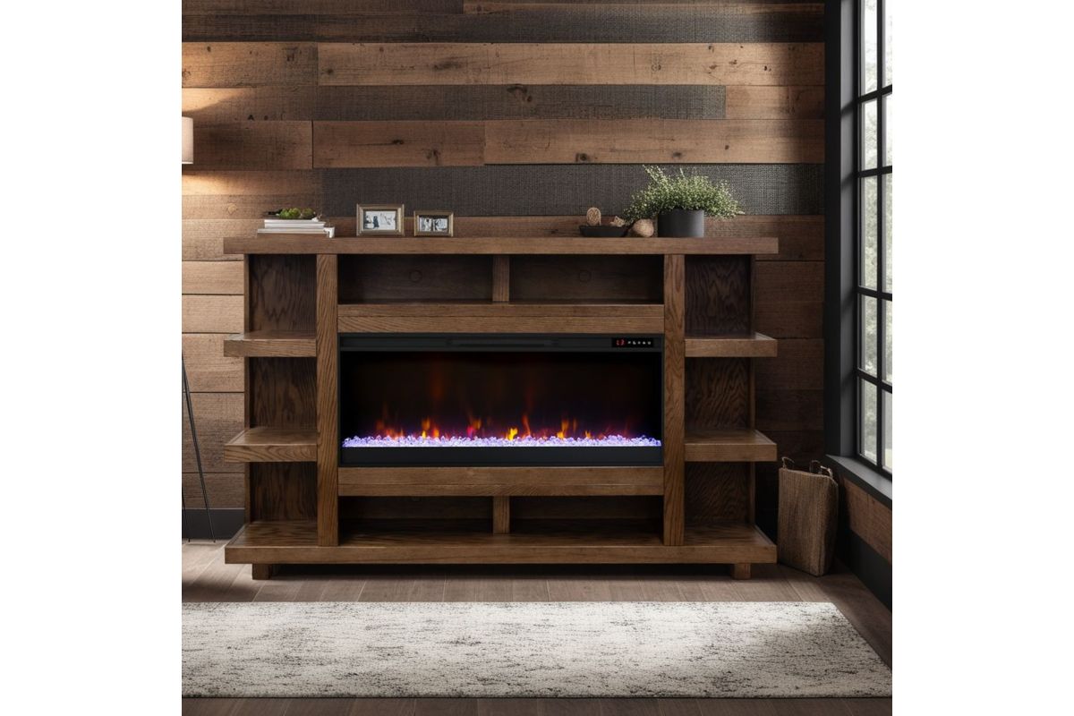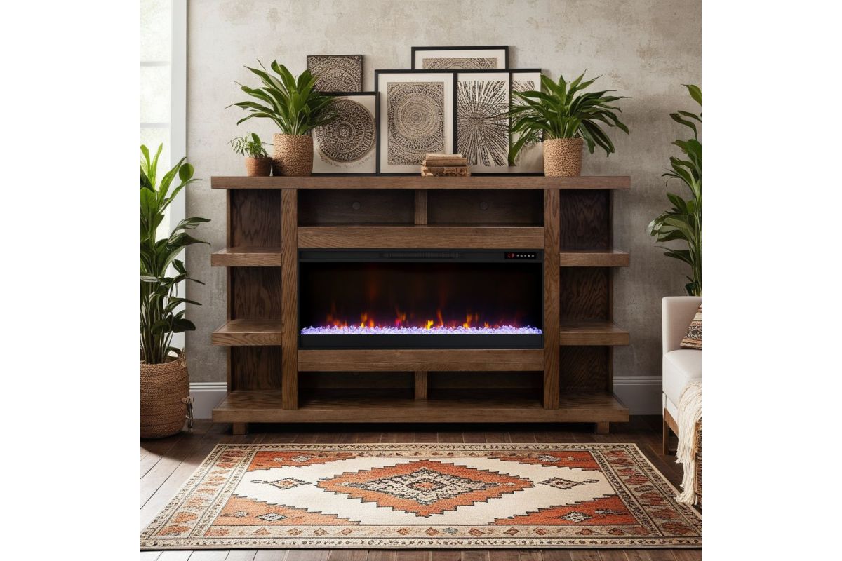 The Laurel Canyon 72 inch Fireplace Mantel delivers the perfect blend of modern, urban style with rustic tranquility. Skillfully crafted from Oak Solids and Veneers, this robust Mantel with Electric Fireplace is available in your choice of three finish options and features unique, open-ended shelving. Ideal to place below a wall-mounted TV, this Fireplace Mantel will provide ample space to showcase home décor and house media and gaming consoles. Cable management openings on the back panel will keep all cords and wires concealed. The 42" Electric Fireplace Insert with crystals and faux wood burning logs includes multiple settings that will heat up to 400 square feet and a remote control. Four (included) screws make securing the fireplace insert to the console quick and simple. From mountain lodge to urban loft, the clean lines of Laurel Canyon will be a stunning and welcome addition to any home. Minimal Assembly required.