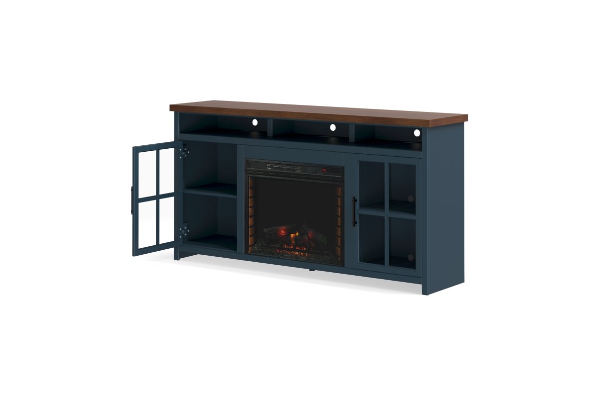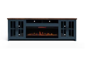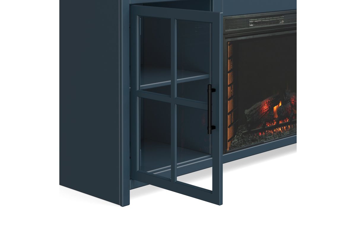 The Nantucket 74" Fireplace TV Stand Console from Bridgevine Home delivers a flawless combination of modern farmhouse style and country simplicity. Beautifully crafted from Poplar Solids, Okoume Veneers and Knotty Alder, this Fireplace Entertainment Center features a two-tone Blue Denim and Whiskey finish and oil-rubbed Bronze hardware. Ideal for TVs up to 85 inches, this Fireplace TV Stand includes two glass windowpane doors, three shelves and cable management on the back panel for media and gaming console storage. The 28" electric fireplace insert includes a remote control and multiple settings allow for heat up to 400 square feet. Four (included) screws make securing the fireplace insert to the console quick and simple. Minimal assembly required