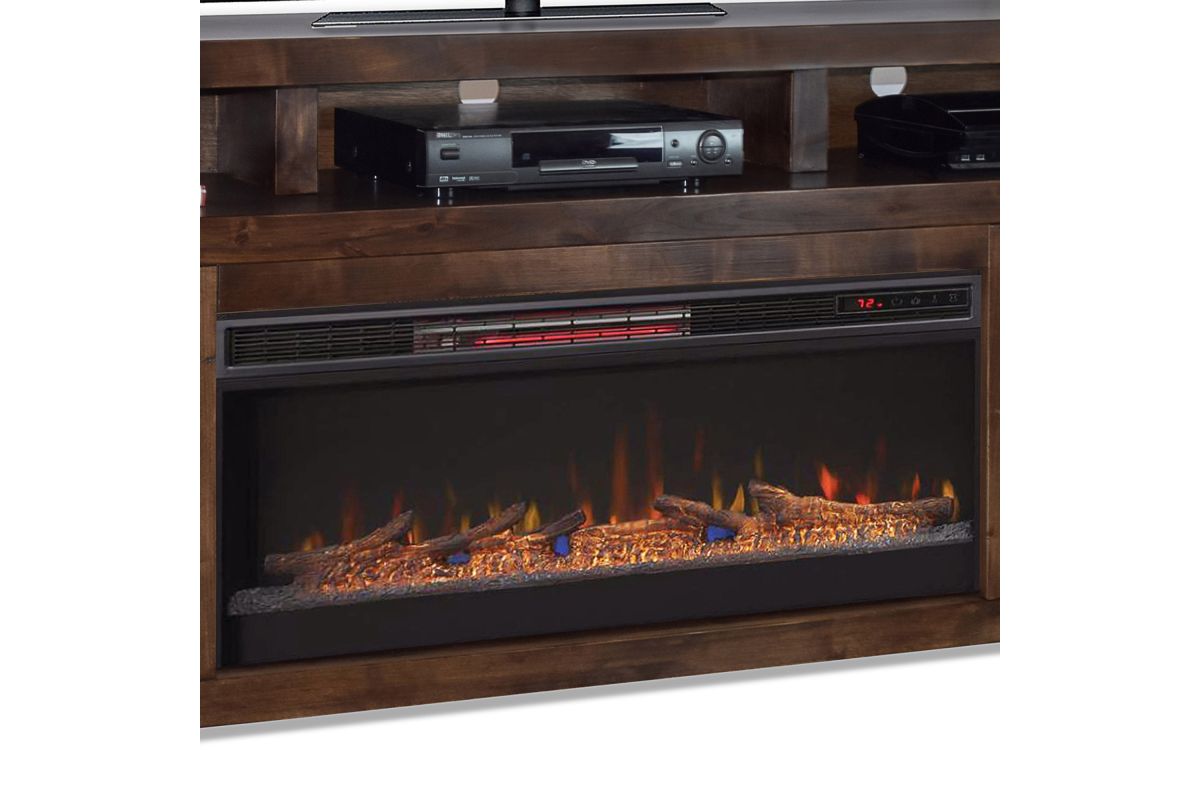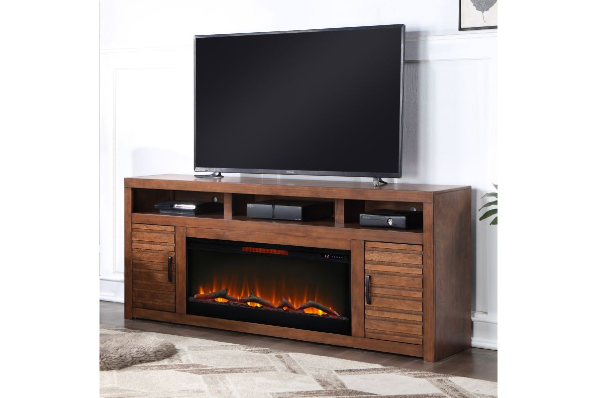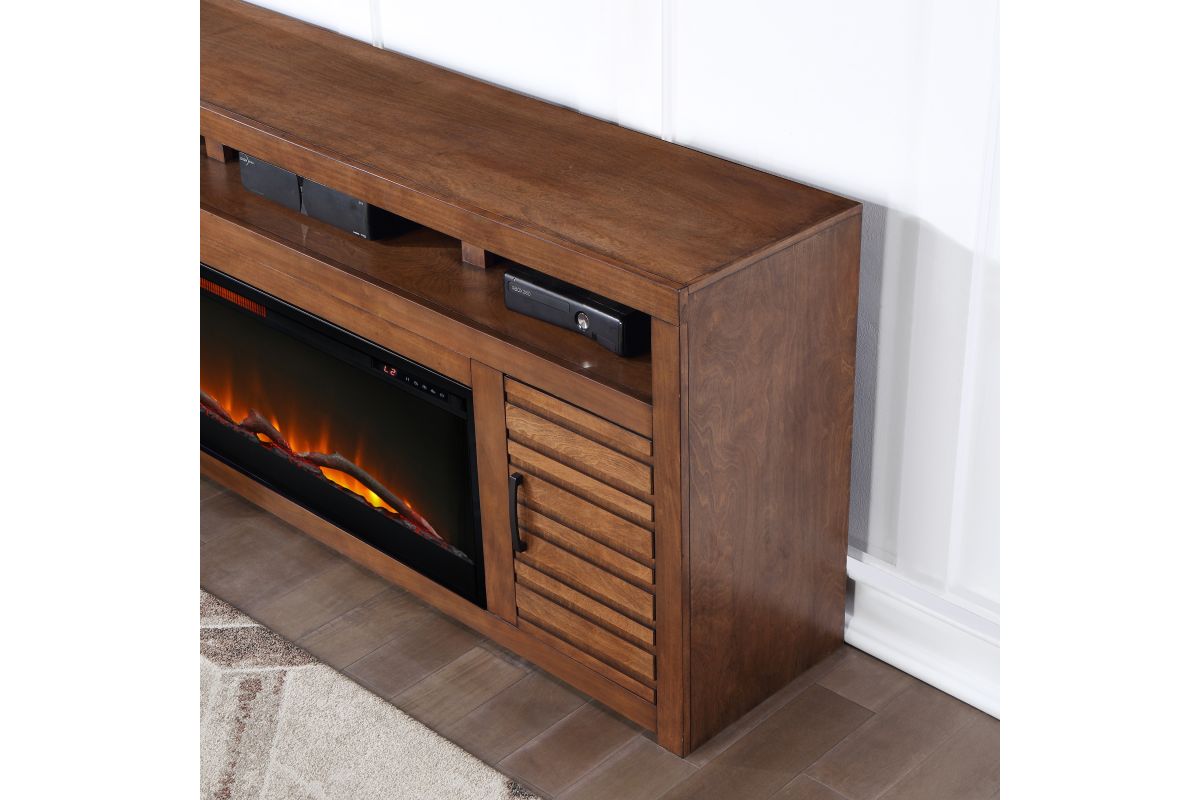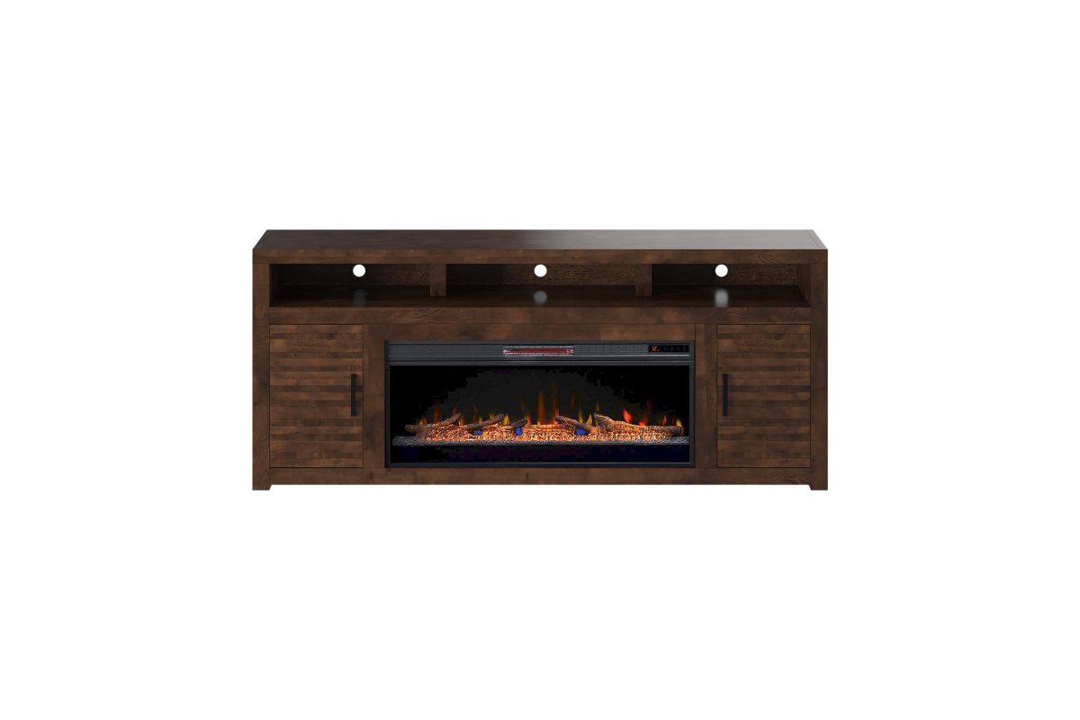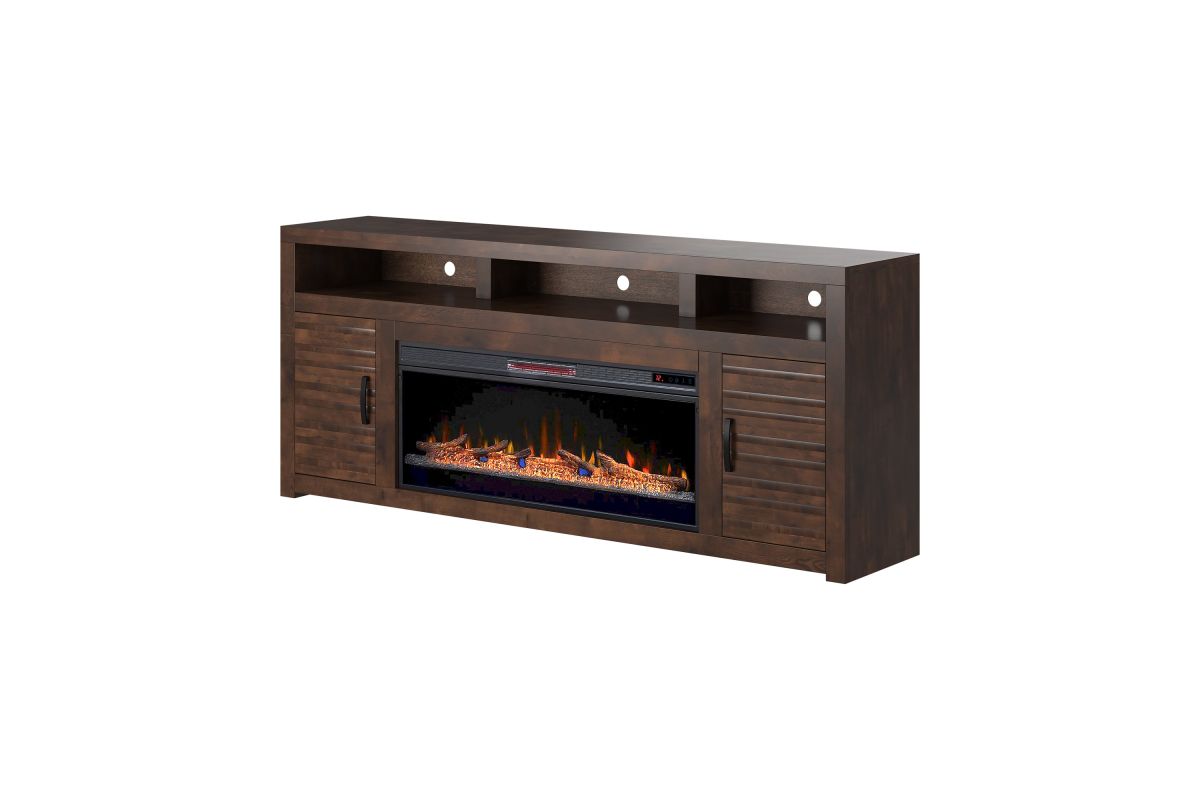 The Sausalito 78" Electric Fireplace TV Stand Console from Bridgevine home delivers a modern robust silhouette with a slightly rustic and urban feel. Skillfully crafted from Knotty Alder Solids and Veneers, this Fireplace TV Stand boasts intentional distressing and a rich Whiskey finish that enhances the natural wood grain. Featuring three open shelving areas and two doors with horizontal slat detailing and Flat Black hardware, this Fireplace TV Console will accommodate TVs up to 95 inches and provide ample storage for media and gaming consoles and home décor favorites. Cable management openings on the back panel will keep your cords and wires concealed. The 42" electric fireplace insert includes a remote control and multiple settings allow for heat up to 400 square feet. Four (included) screws make securing the fireplace insert to the console quick and simple.