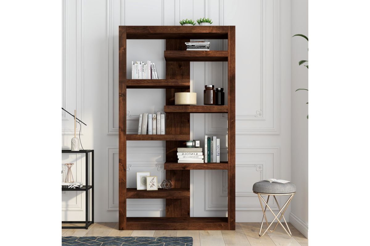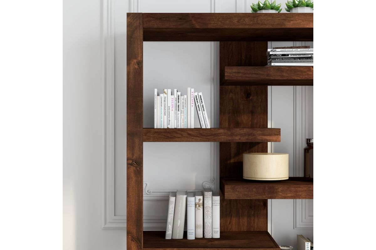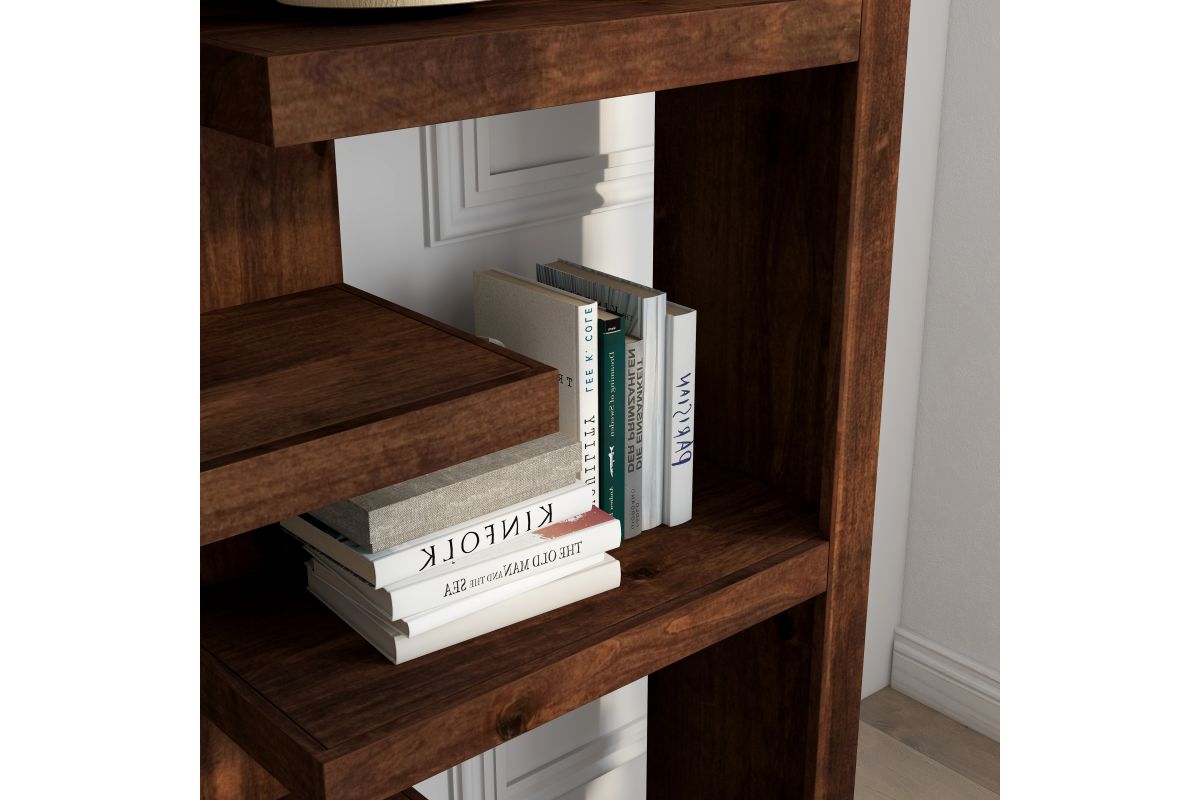 The Sausalito 72" high Bookcase from Bridgevine home delivers a modern robust silhouette with a slightly rustic and urban feel. Skillfully crafted from Knotty Alder Solids and Veneers, this bookshelf boasts intentional distressing and a rich Whiskey finish that enhances the natural wood grain. Featuring six alternating shelves, this bookshelf is ideal to showcase home décor, house your book collection or organize office supplies. Whether placed in your living room, home office or bedroom, this bookcase will be a welcome addition to your home. Fully assembled upon arrival, all furniture from Bridgevine Home is ready to unbox and enjoy.