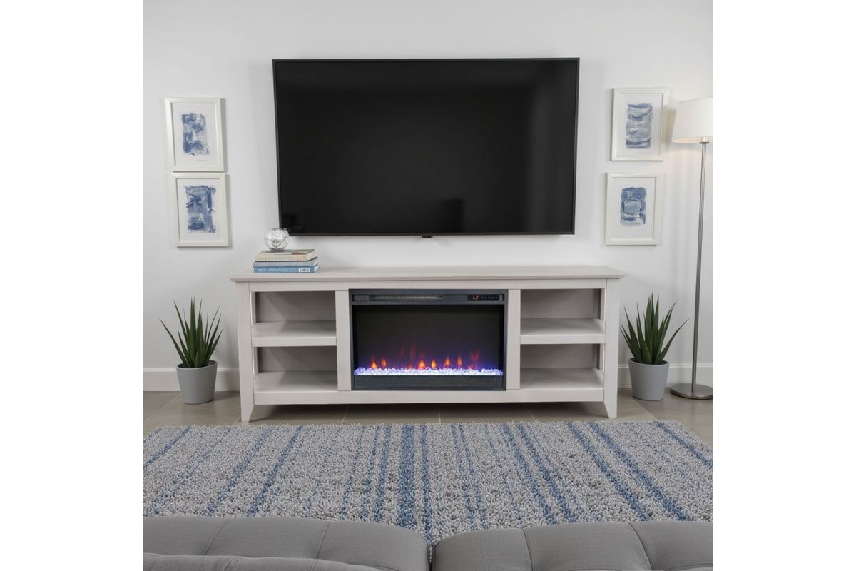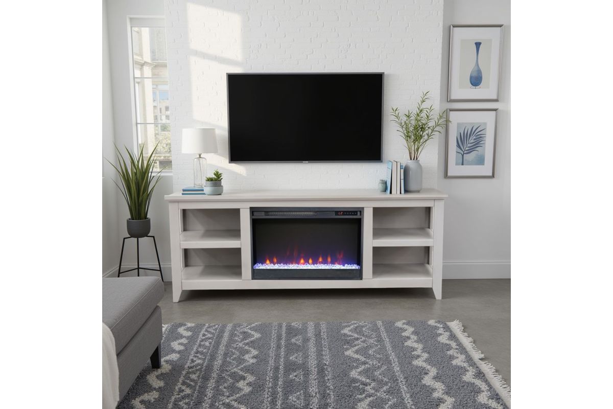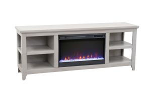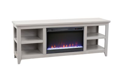 The Studio 65" Fireplace TV Stand from Bridgevine Home delivers simple, versatile, transitional style. Skillfully crafted from Poplar Solids and Okoume Veneers, this Electric Fireplace TV Console features a Sandstone finish, ample storage space on open shelving and will accommodate TVs up to 75 inches. The 26" electric fireplace insert includes a remote control and multiple settings allow for heat up to 400 square feet. Four (included) screws make securing the fireplace insert to the console quick and simple. Minimal assembly required.