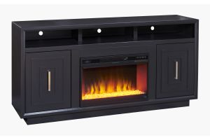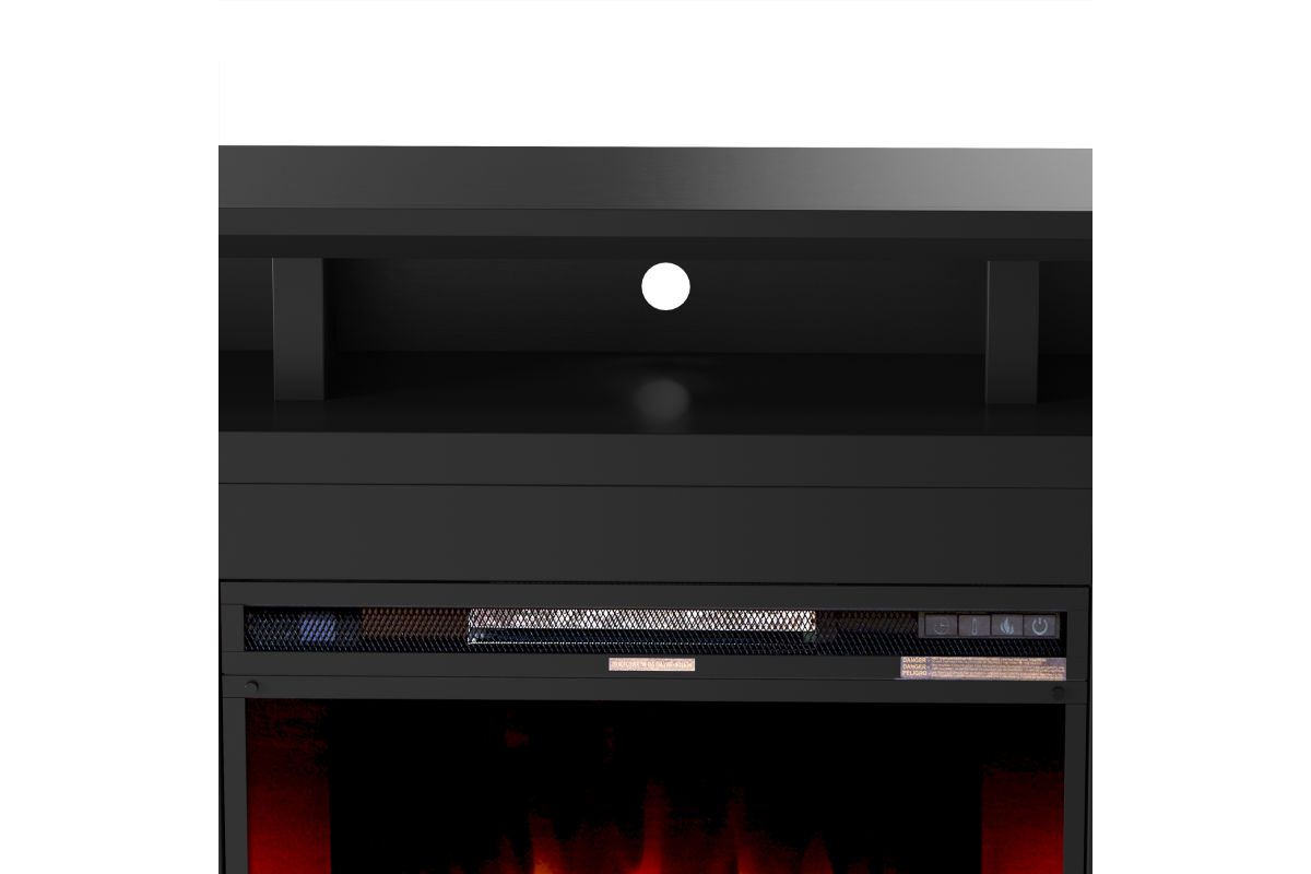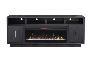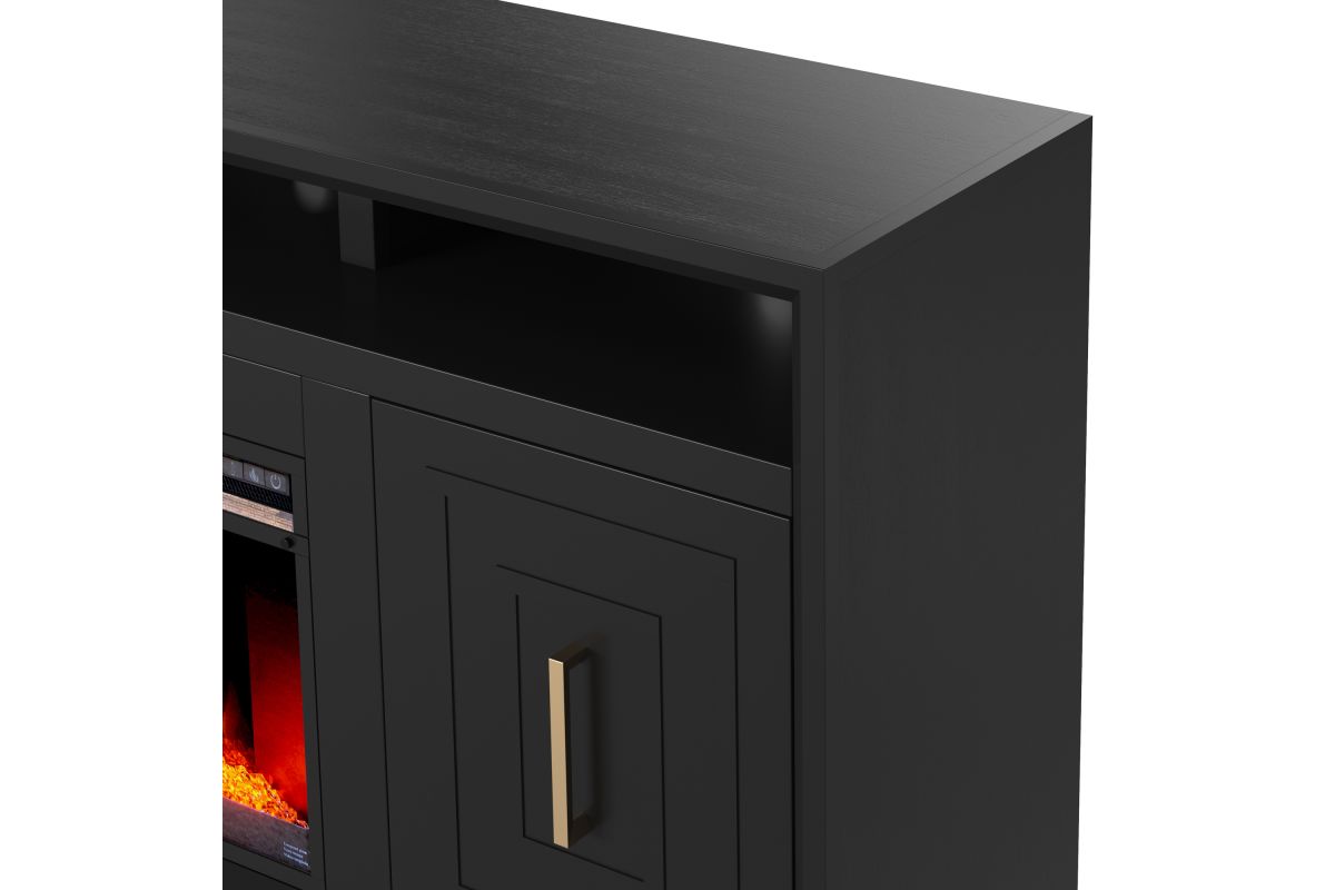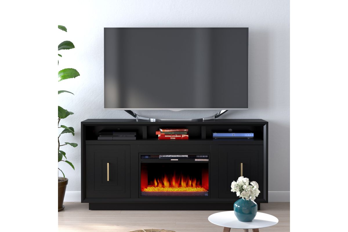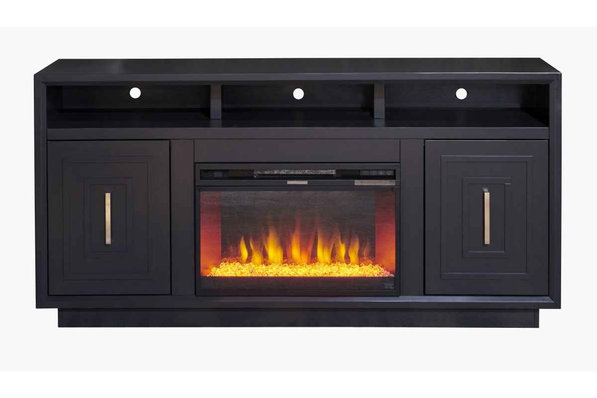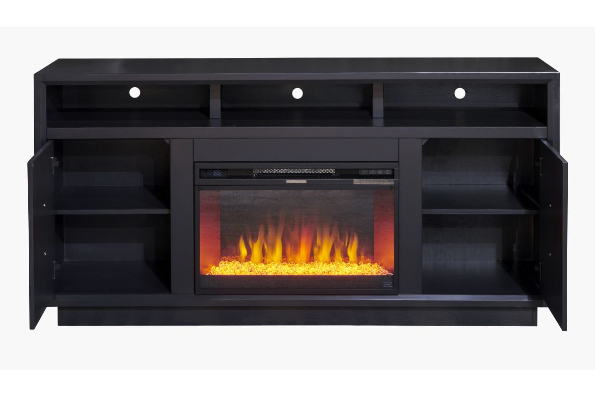 The Sunset 67" Electric Fireplace TV Stand Console from Bridgevine Home is refreshing and modern and will make a brilliant contemporary statement in your home. Featuring clean, structural lines this Fireplace TV Stand is exquisitely crafted from Poplar Solids and Okume Veneers, finished in a Black and completed with elongated nickel hardware and a plinth base. This Fireplace TV Console will accommodate TVs up to 80 inches and two doors and one open shelving area will provide ample storage for media and gaming consoles. Cable management openings on the back panel will keep your cords and wires concealed. The 26" electric fireplace insert includes a remote control and multiple settings allow for heat up to 400 square feet. Four (included) screws make securing the fireplace insert to the console quick and simple. Minimal assembly required