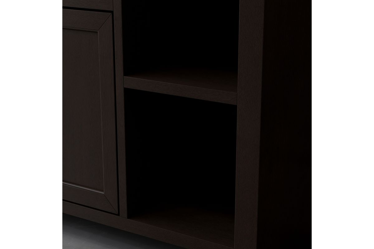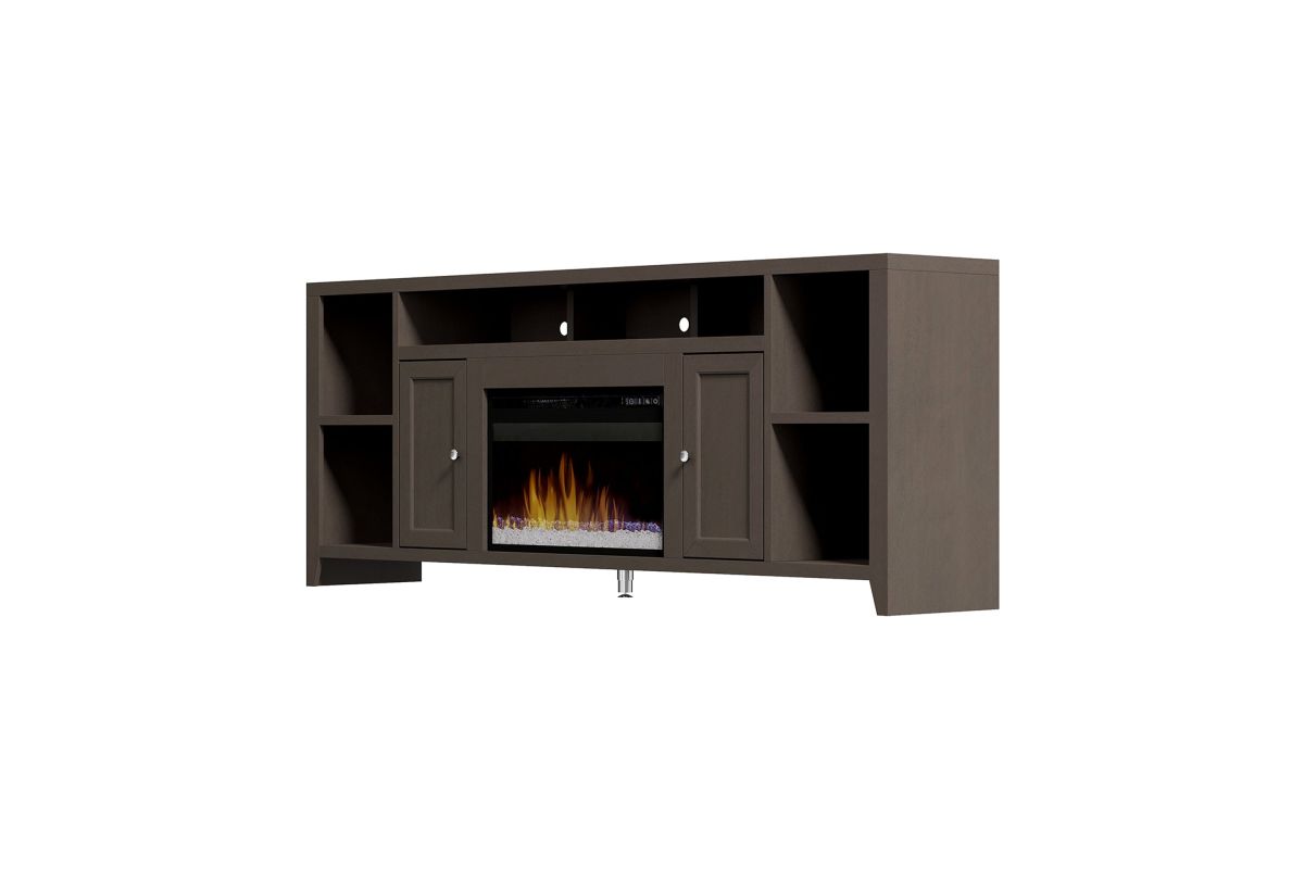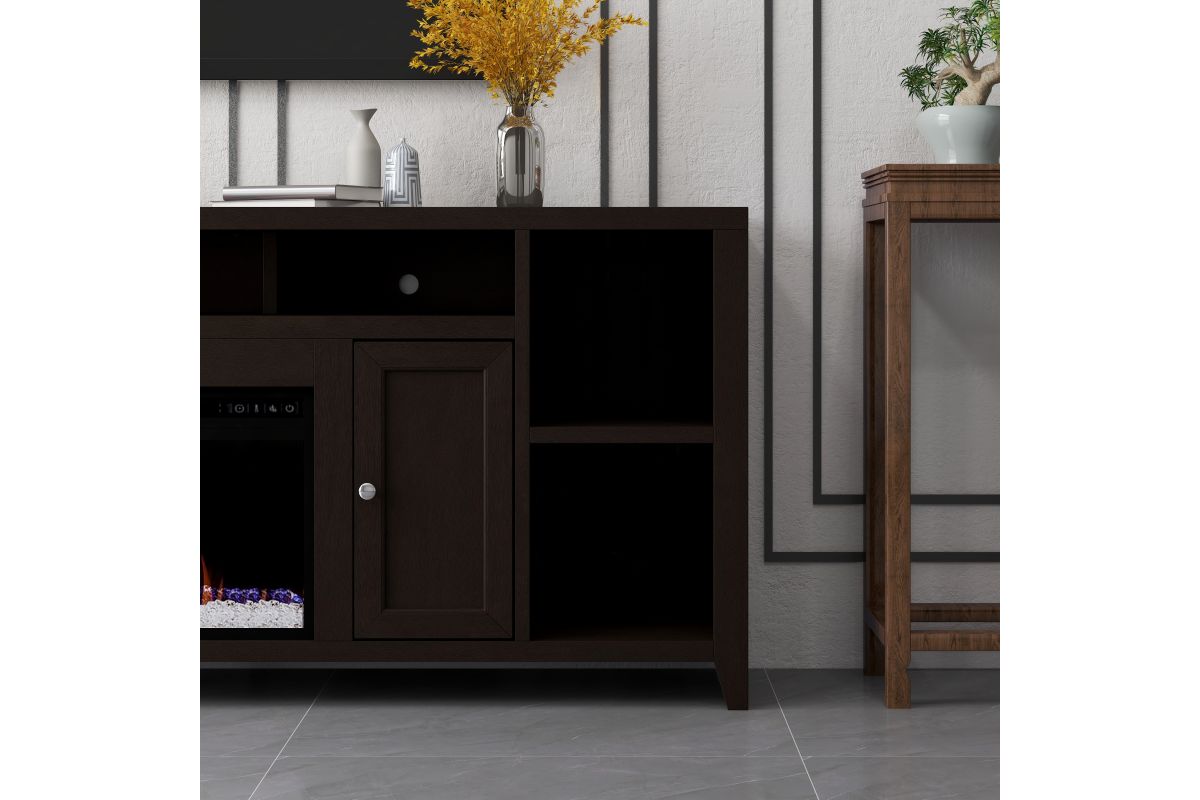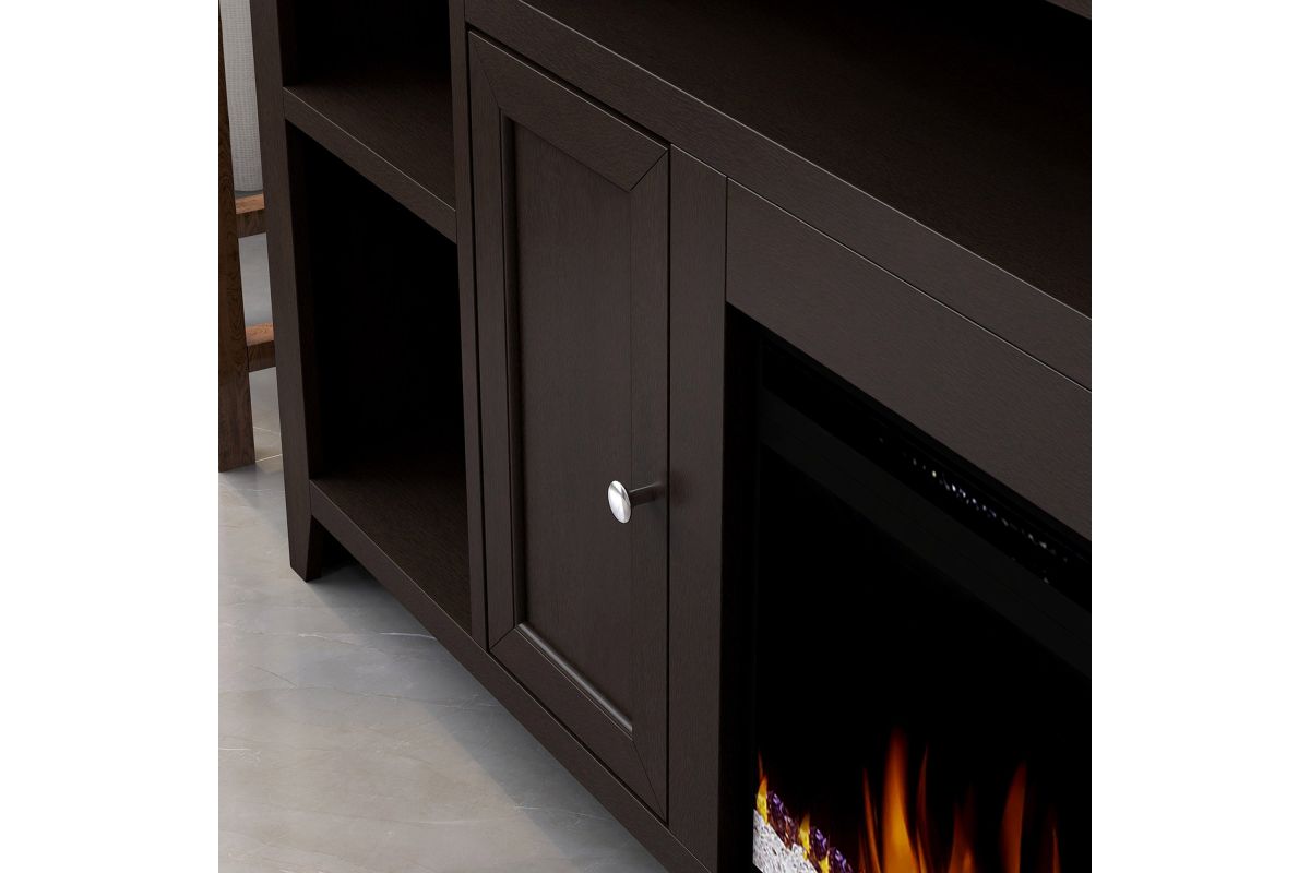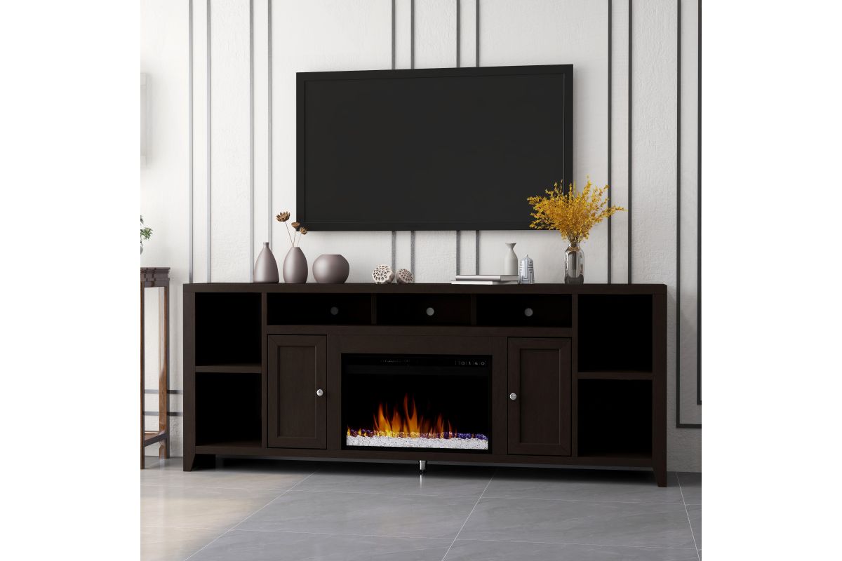 The Urban Loft 84" Electric Fireplace TV Stand Console from Bridgevine Home delivers form and function with an upscale urban feel. This fireplace TV Stand is crafted from Poplar Solids and premium Veneers in a rich Mocha brown finish and accented with Brushed Nickel hardware. Featuring two doors and five shelves, this fireplace TV Console will accommodate TVs up to 95 inches and provide ample storage for media and gaming consoles. Cable management openings on the back panel will keep your cords and wires concealed. The 42" electric fireplace insert will heat up to 400 sq square feet and includes tempered safety glass and a remote control. Multiple settings include automatic room temperature control (64F - 82F), adjustable flame brightness and flame effect without heat. Fully assembled upon arrival, all furniture from Bridgevine Home is ready to unbox and enjoy. Minimal assembly required.