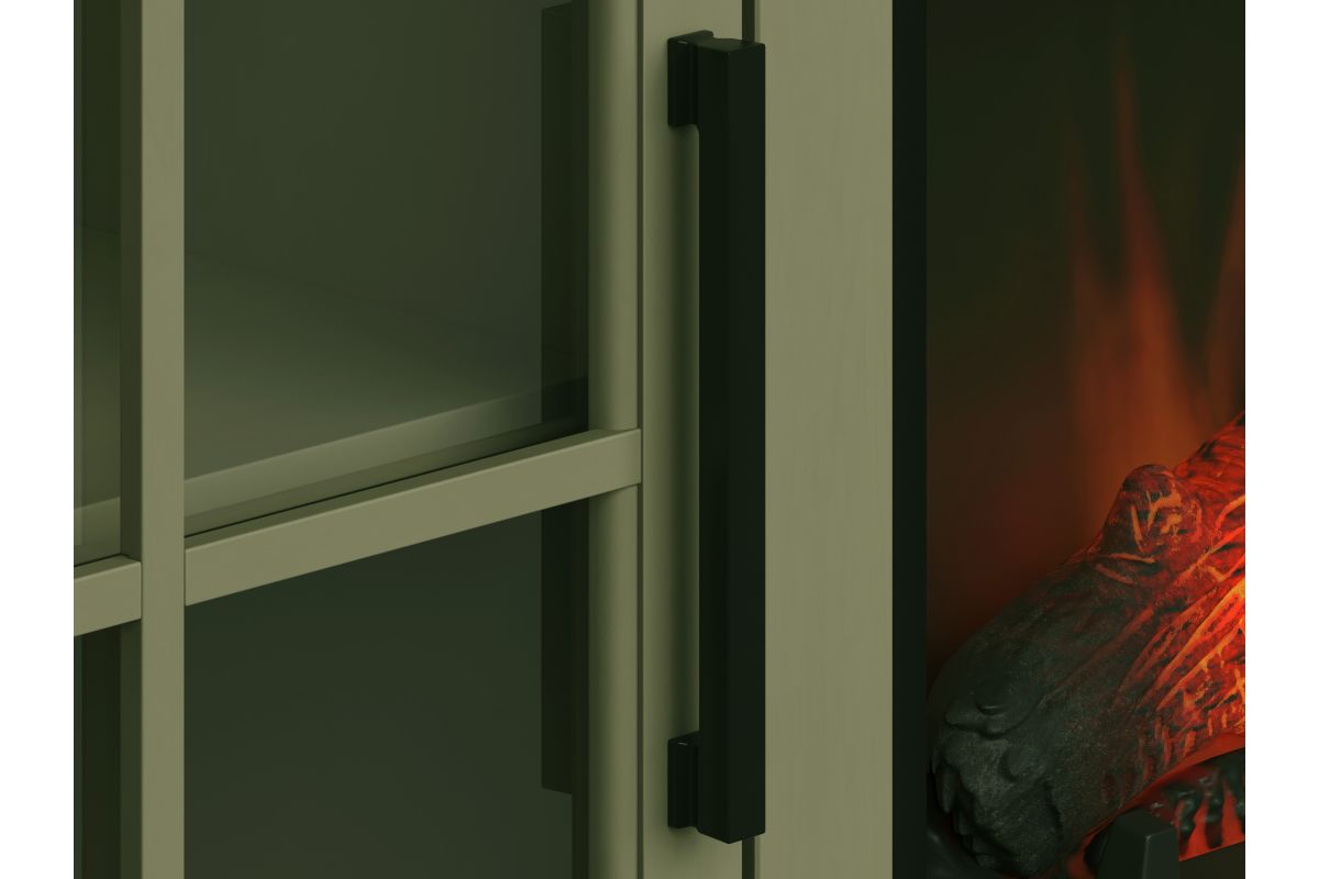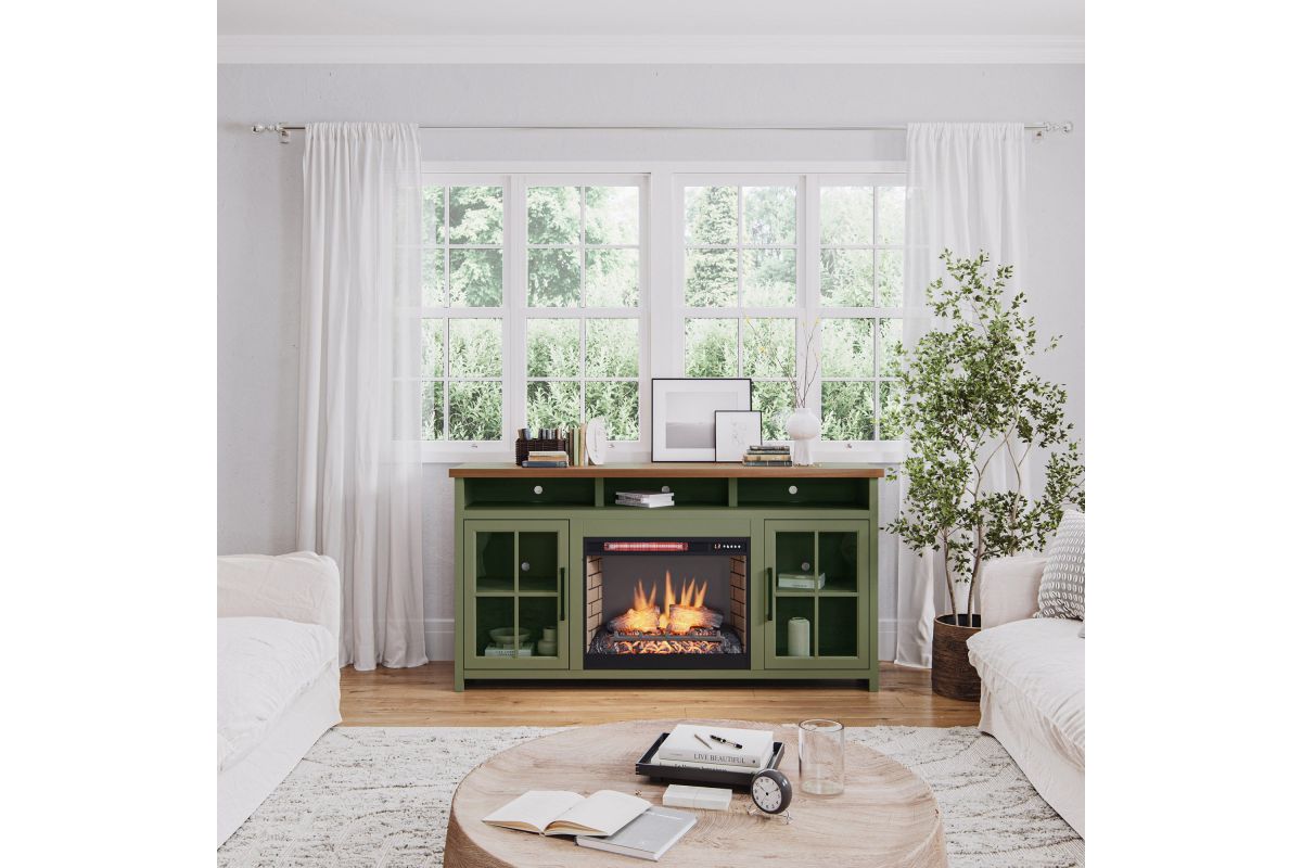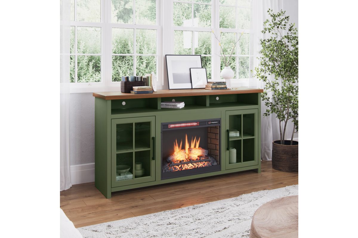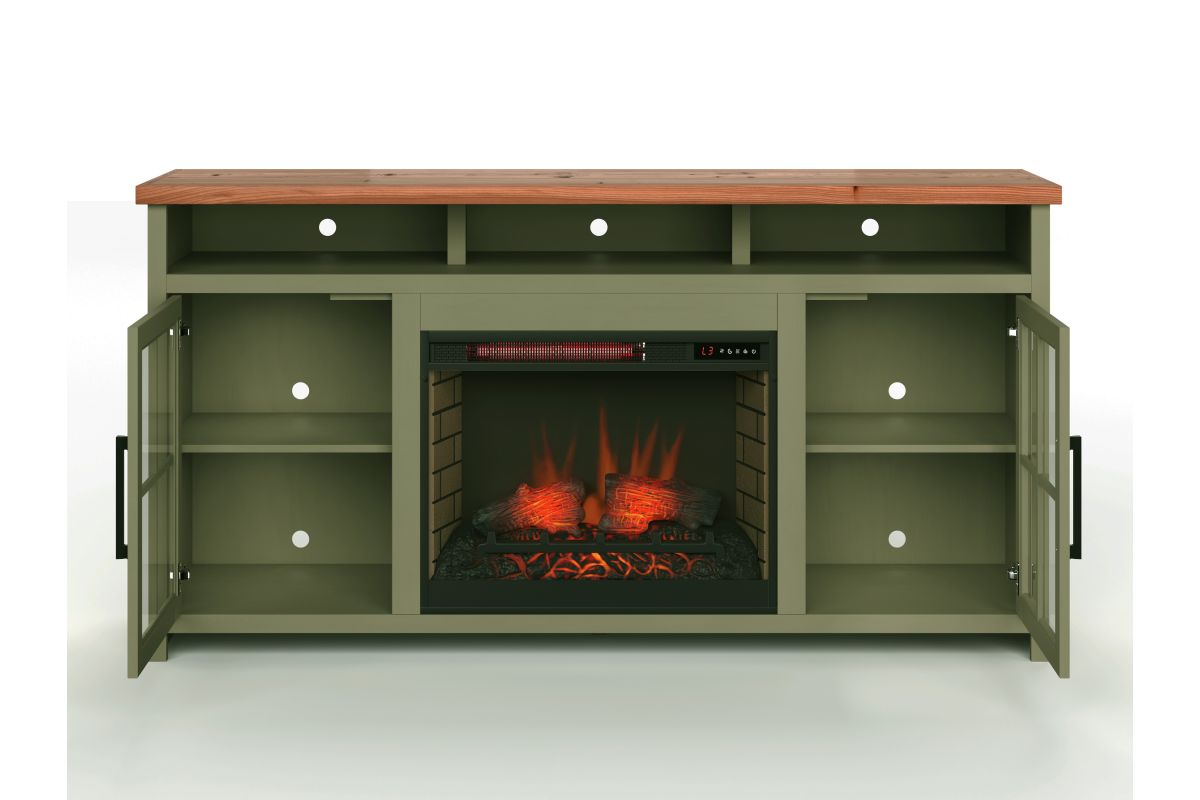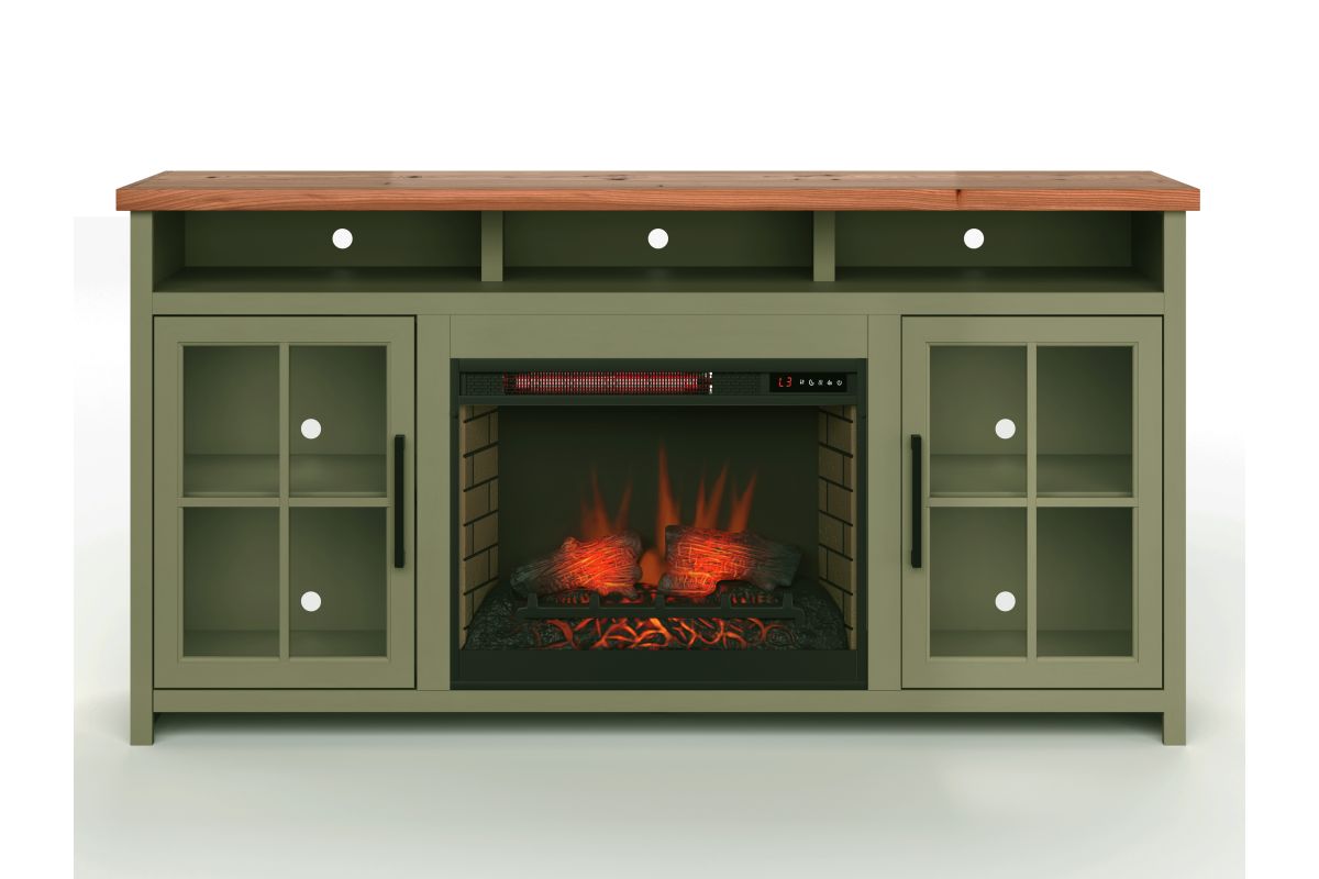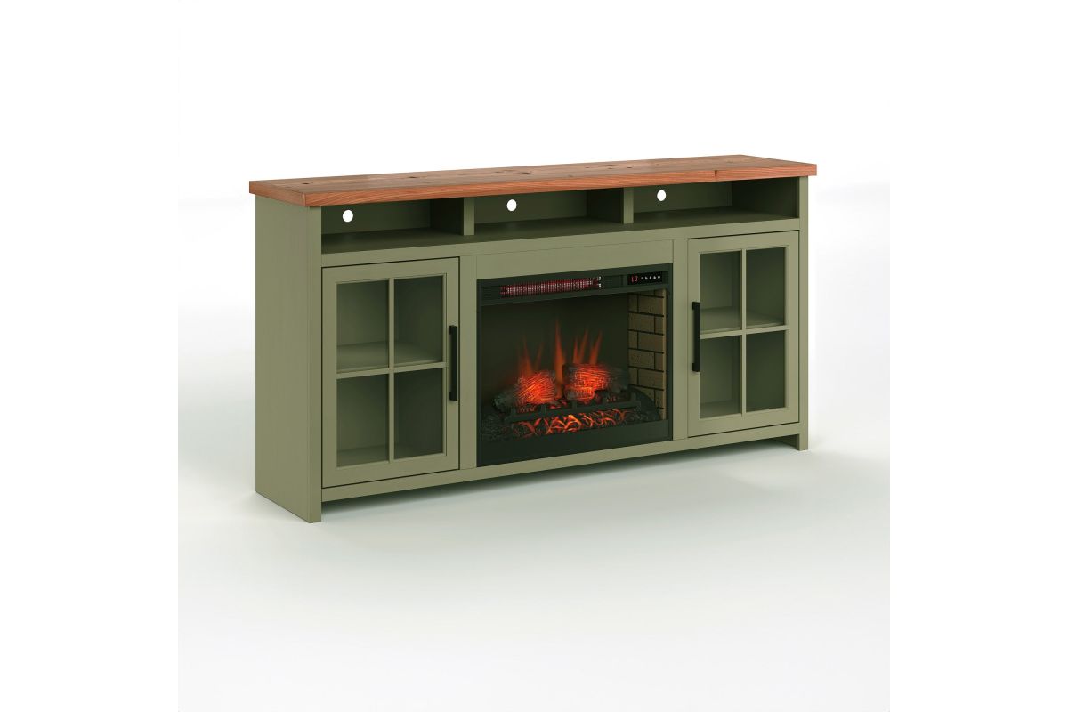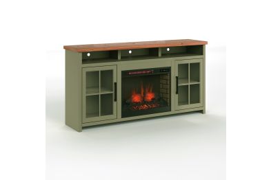 The Vineyard 74" Fireplace TV Stand Console from Bridgevine Home delivers a flawless combination of modern farmhouse style and country simplicity. Beautifully crafted from Poplar Solids, Okoume Veneers and Knotty Alder, this Fireplace Entertainment Center features a two-tone Sage Green and Fruitwood finish and oil-rubbed Bronze hardware. Ideal for TVs up to 85 inches, this Fireplace TV Stand includes two glass windowpane doors, three shelves and cable management on the back panel for media and gaming console storage. The 28" electric fireplace insert includes a remote control and multiple settings allow for heat up to 400 square feet. Four (included) screws make securing the fireplace insert to the console quick and simple. Minimal assembly required.
