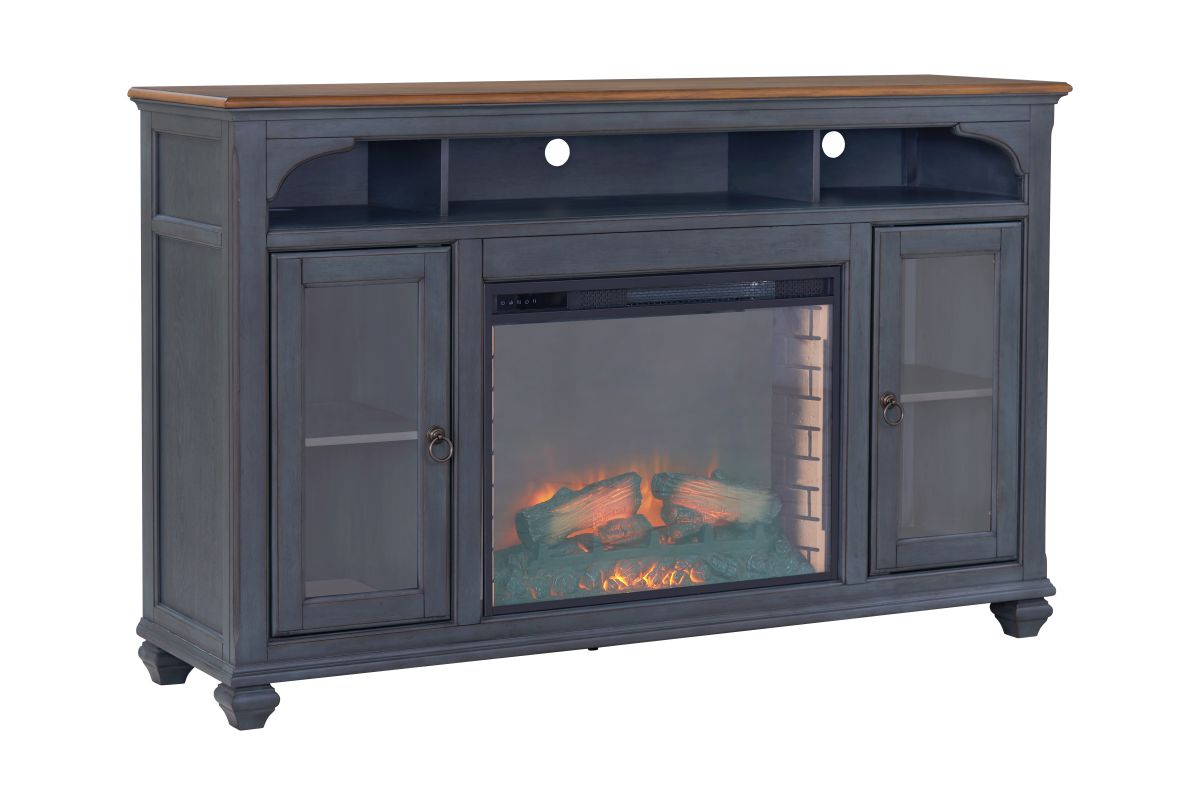 The Americana 66 inch Fireplace TV Stand boasts a refreshing coastal twist on traditional style. Skillfully crafted from Rubberwood Solids and Birch Veneers, the subtle distressing, Corduroy Blue finish and Antique Pewter hardware give this Electric Fireplace TV Console an updated look with a timeless heirloom feel. Ideal for TVs up to 80 inches, this Fireplace Entertainment Center includes two framed glass doors, three shelves and cable management on the back panel for media and gaming console storage. The 28" electric fireplace insert includes a remote control and multiple settings allow for heat up to 400 square feet. Four (included) screws make securing the fireplace insert to the console quick and simple. Just like Baseball, Apple Pie and Rock & Roll, the Americana TV Console will become a beloved favorite in your home. Assembly required.